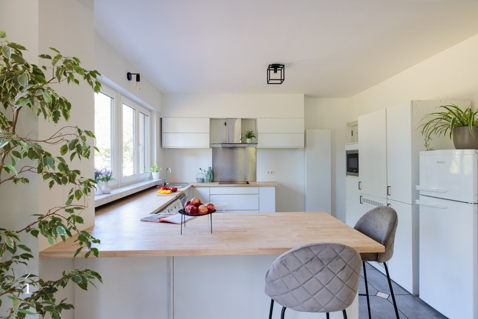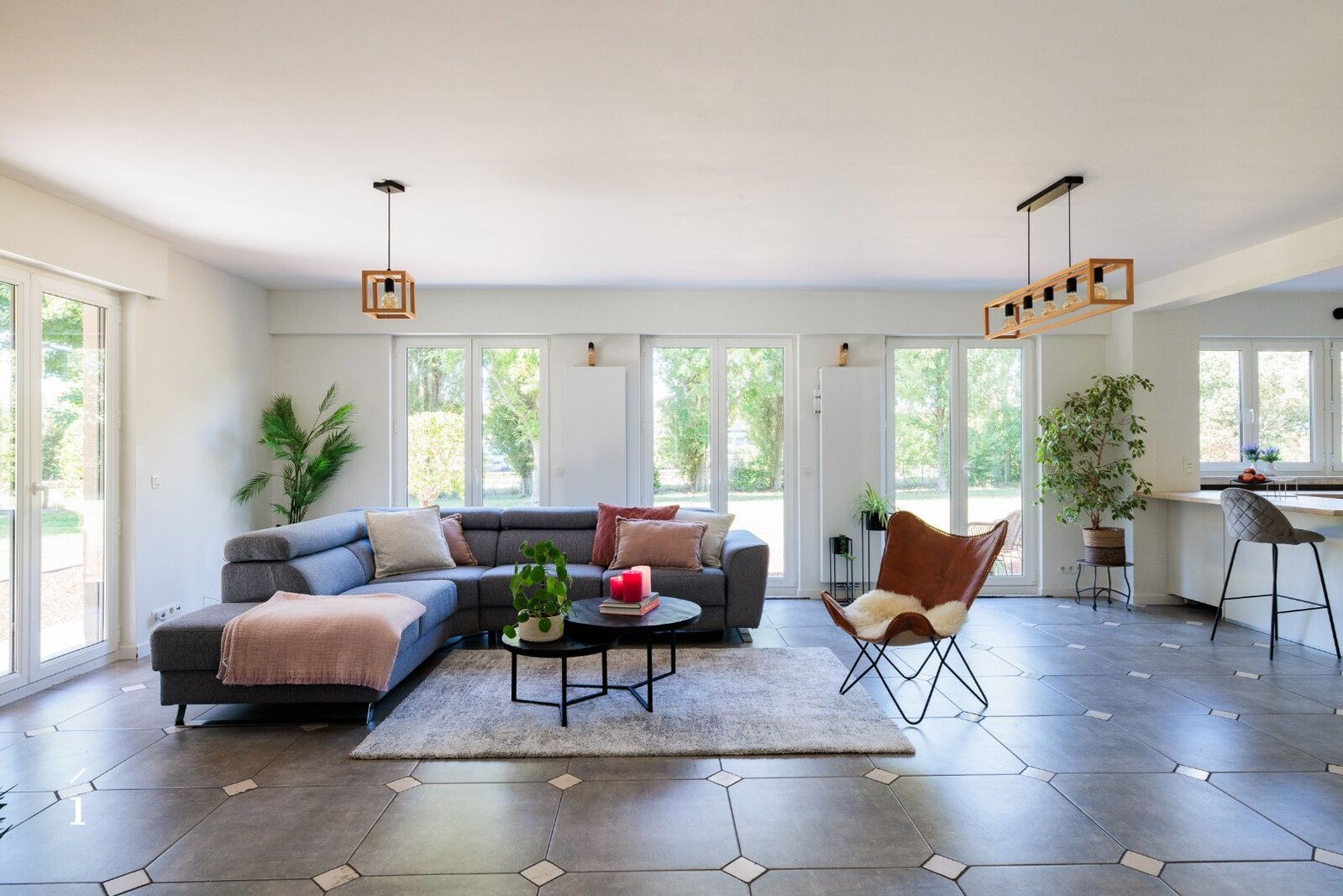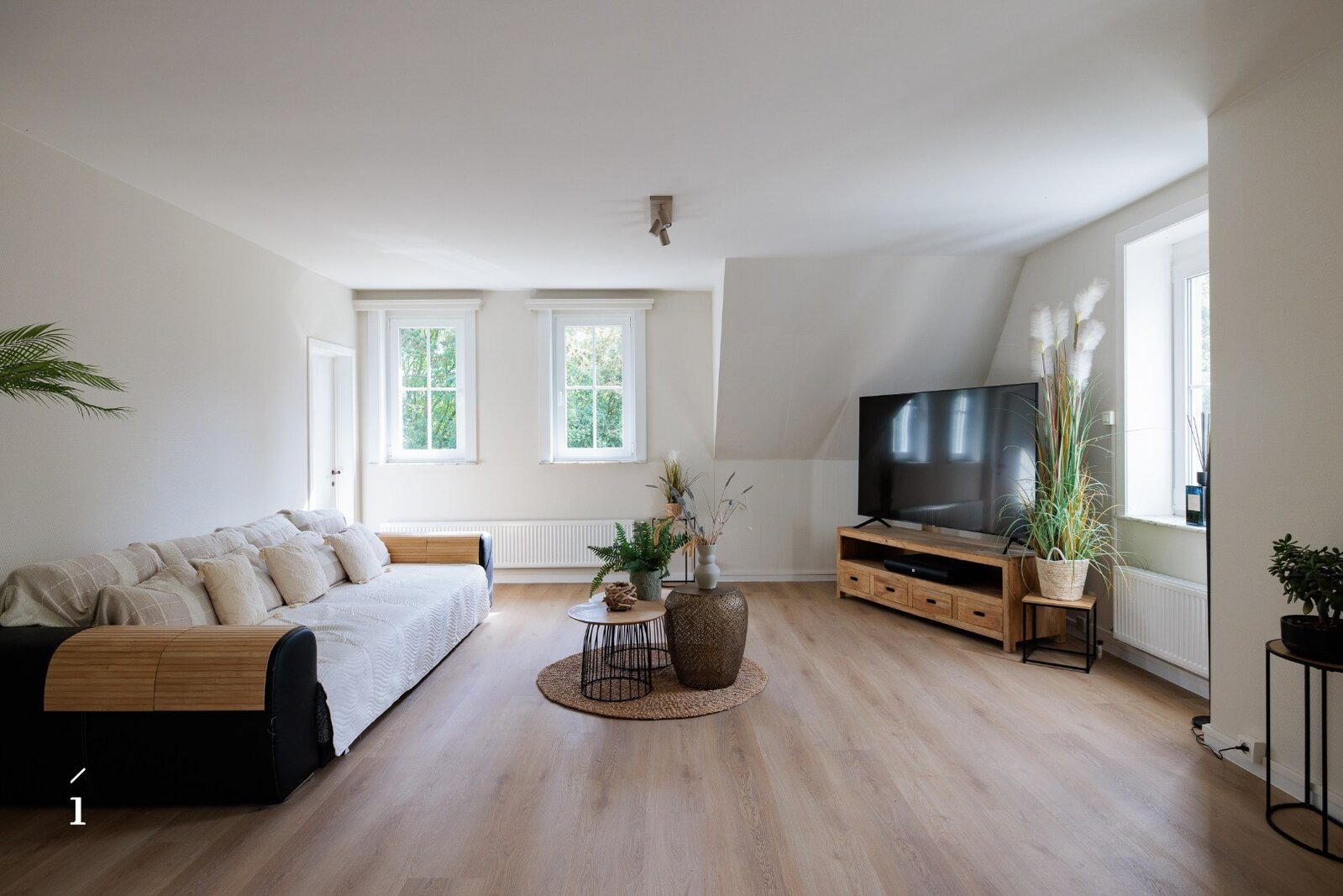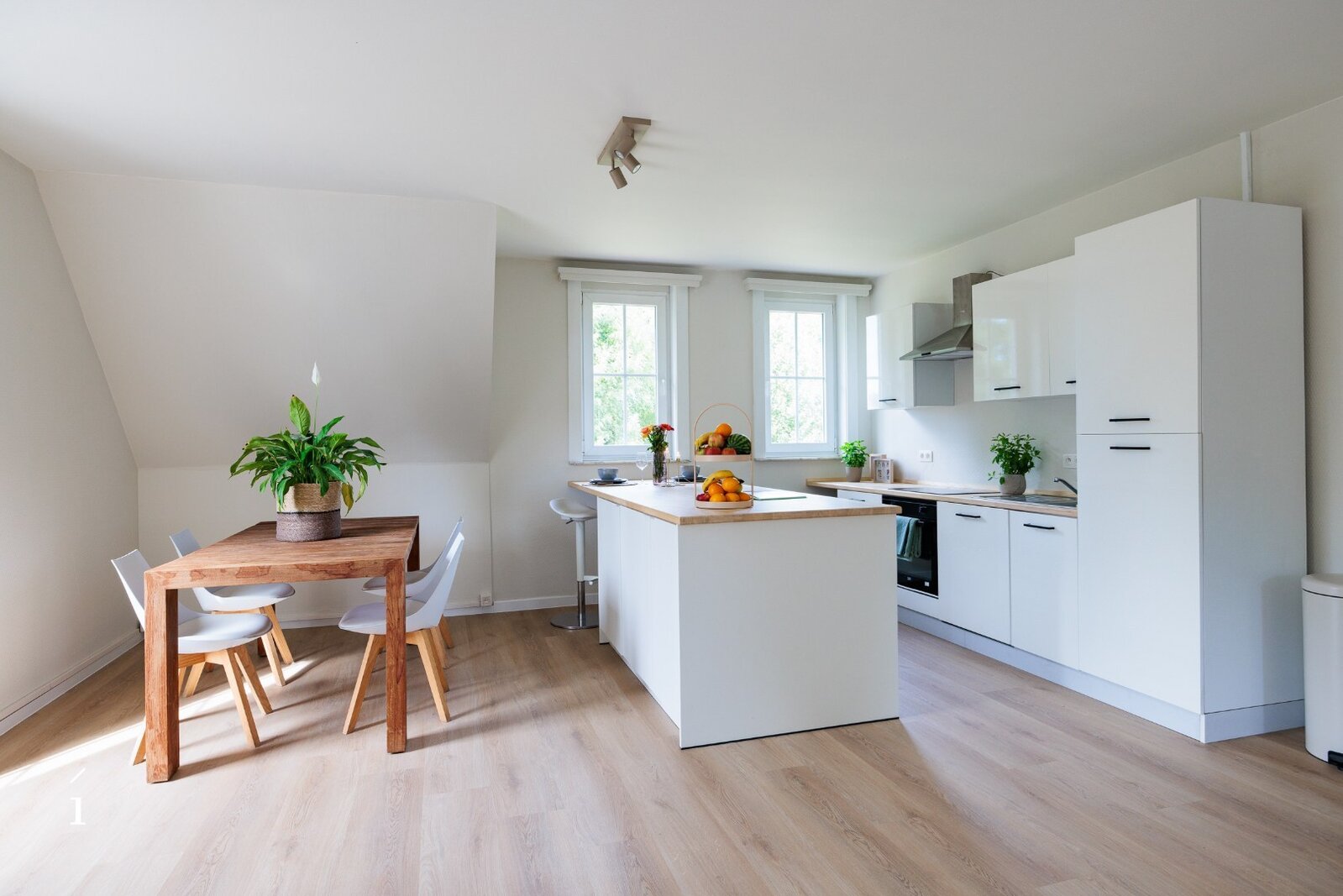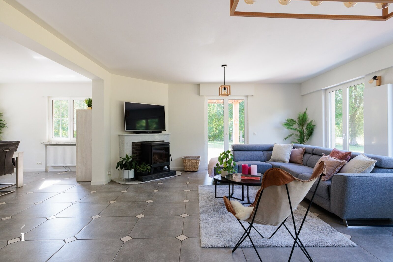 Via de ruime inkomhal, met gastentoilet, komt u binnen in deze open leefruimte. dankzij de indeling vloeien woonkamer, zithoek en keuken naadloos in elkaar over, wat zorgt voor een ruimtelijk en verbonden gevoel. Grote raampartijen langs drie zijden – oost, zuid en west – laten de hele dag door het natuurlijke licht binnenstromen en bieden een prachtig zicht op het omliggende groen.