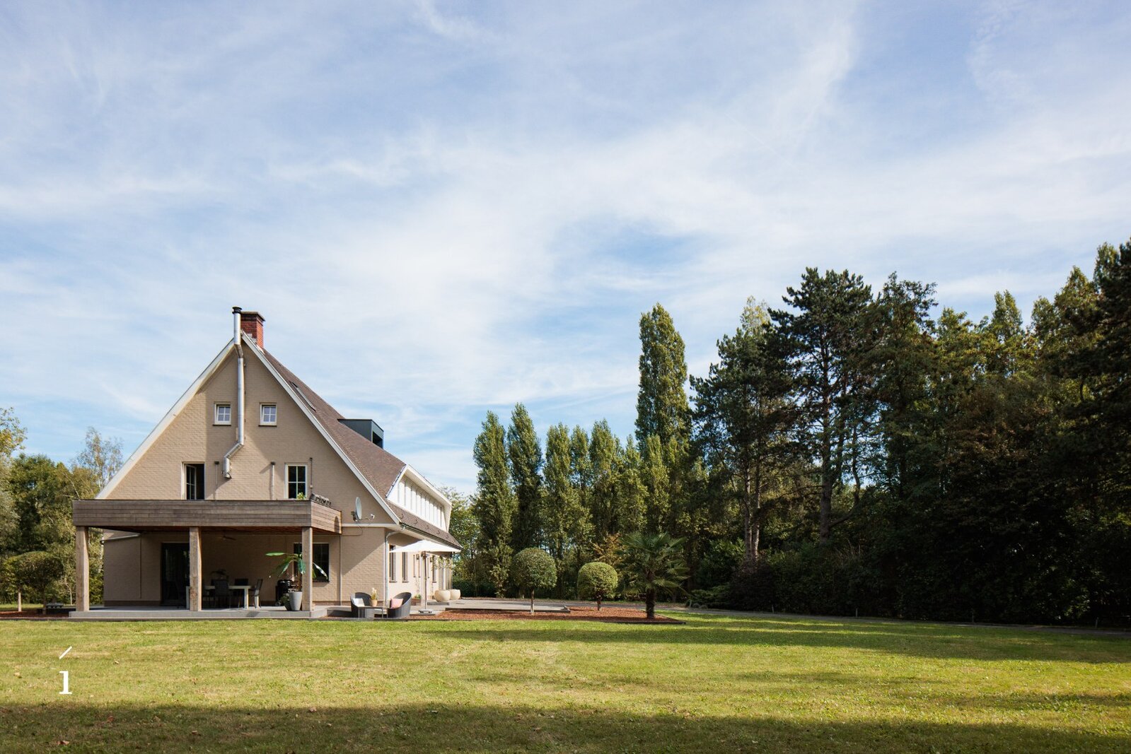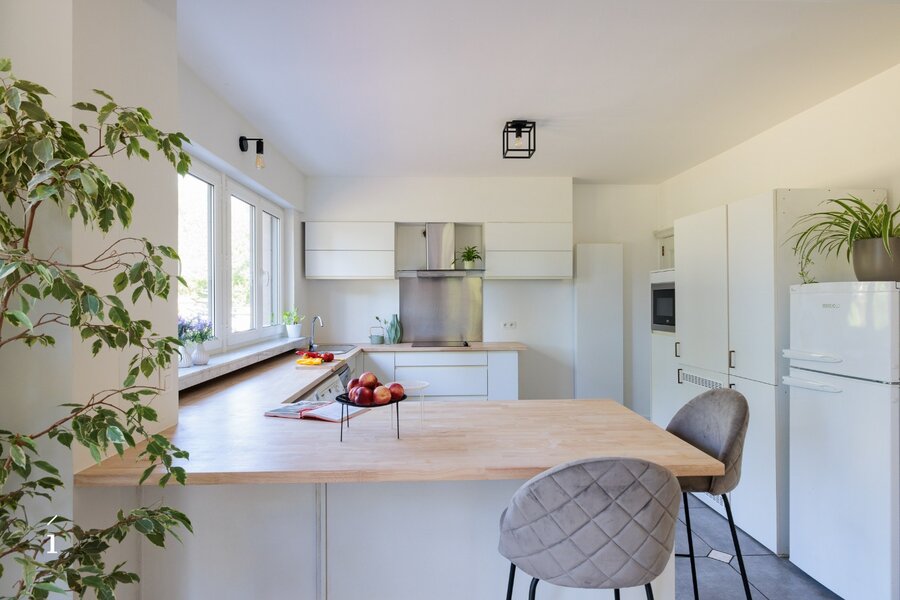 Op de eerste verdieping bevindt zich een tweede leefruimte met open keuken – een volwaardige verdieping die perfect dienst kan doen als aparte wooneenheid, studio of ontspanningsruimte. Dankzij de directe toegang tot het zuidwestgerichte terras geniet je hier volop van de namiddag- en avondzon.