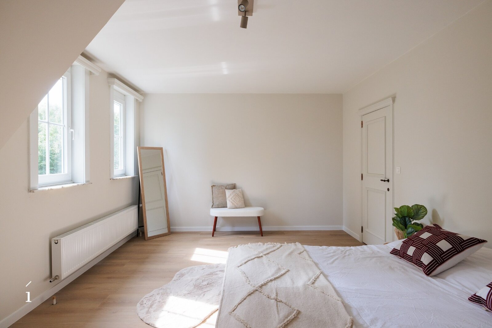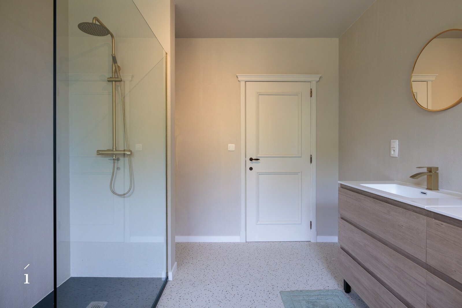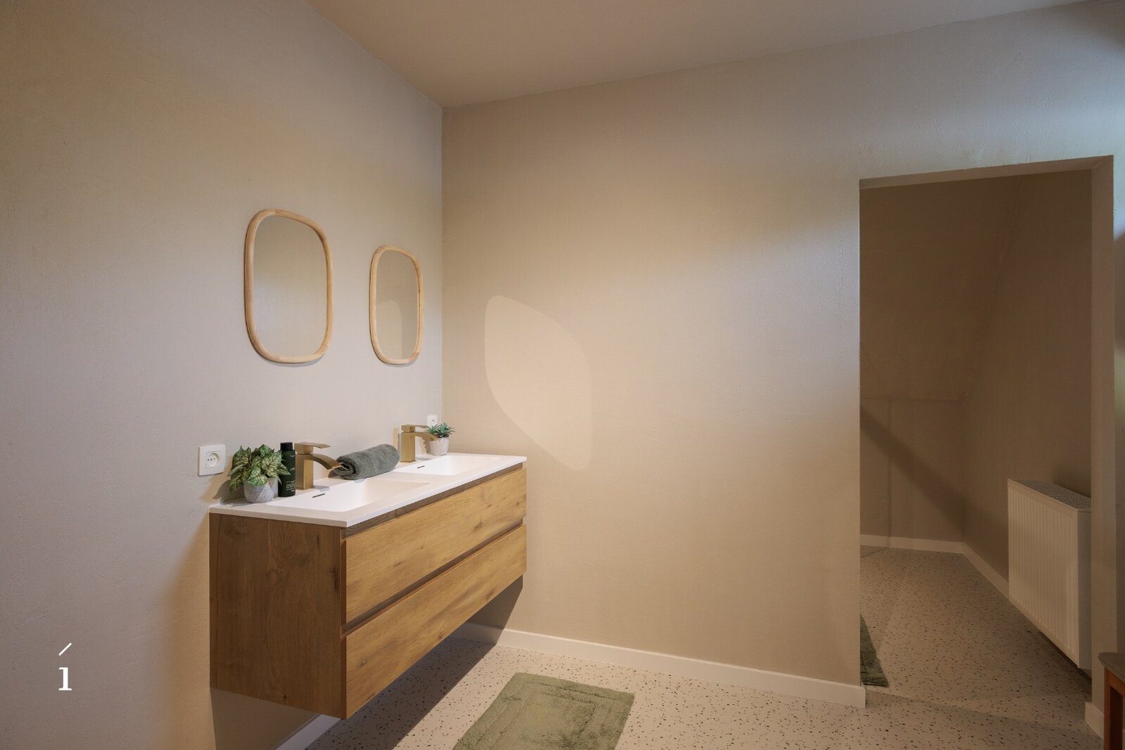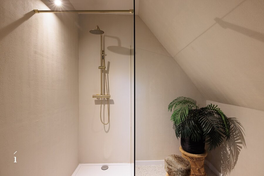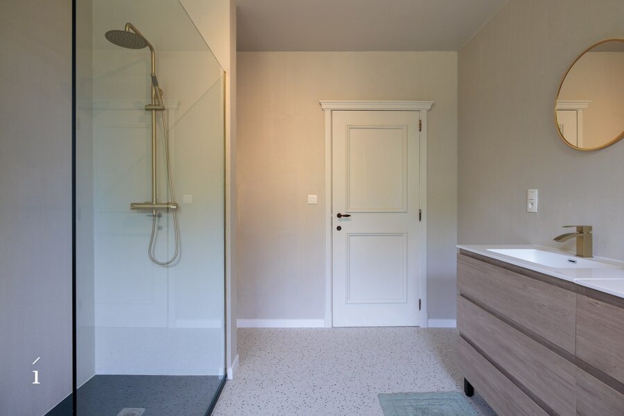 Verder is er een eigen badkamer, uitgerust met een dubbele lavabo en een ruime inloopdouche, wat bijdraagt aan het comfort en de zelfstandigheid van deze verdieping.