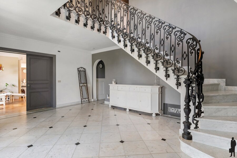 Imposante inkomhal met marmeren vloer en sierlijke trapleuning