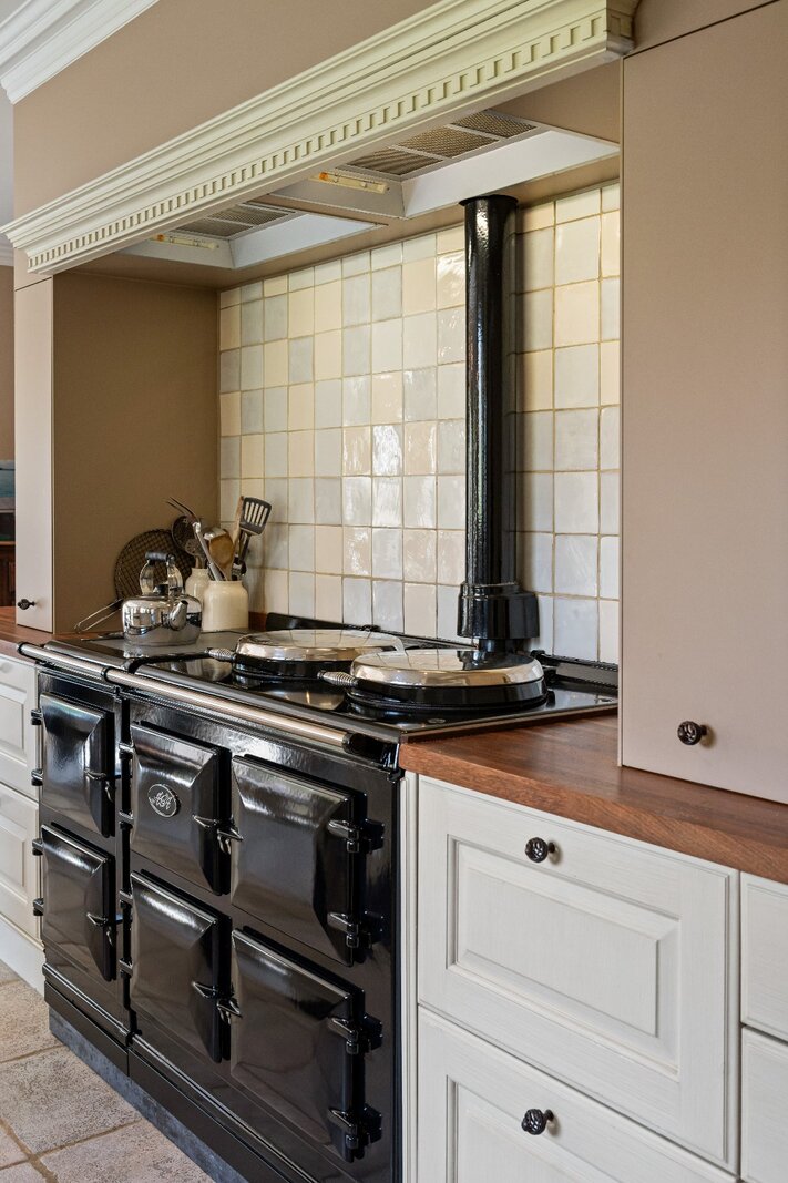 Binnen verwelkomt de woning u met meerdere grote leefruimtes, ontworpen met oog voor licht en elegantie. De woonkamer beschikt over een stijlvolle gashaard die voor een warme sfeer zorgt. De volledig uitgeruste keuken met luxueuze AGA-stoof biedt een prachtig zicht op de volwassen, perfect onderhouden tuin.