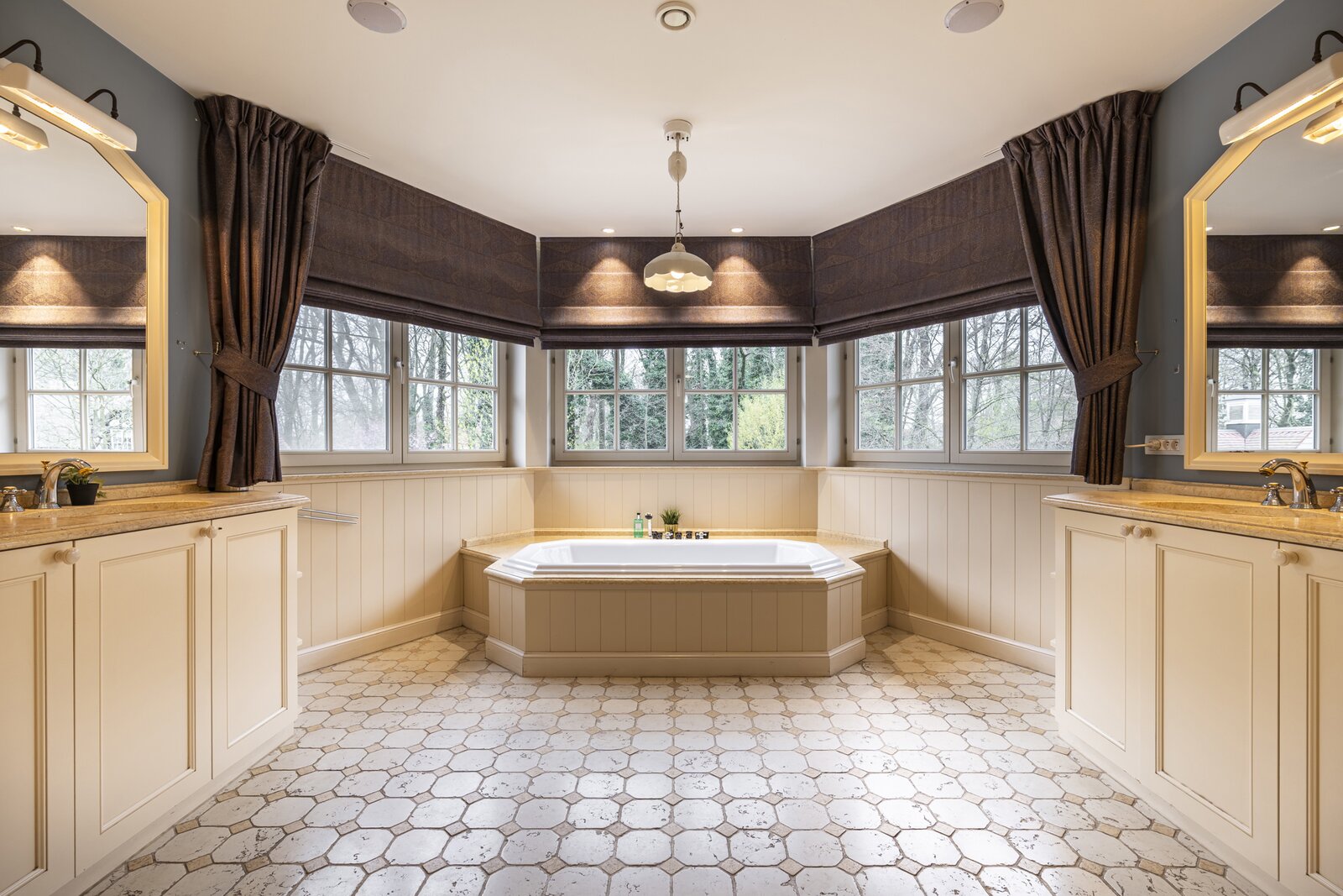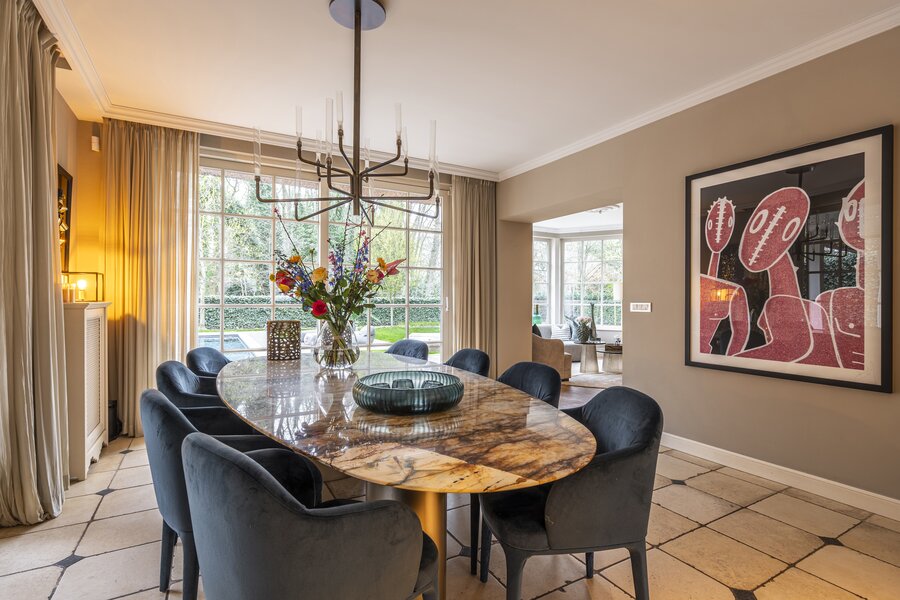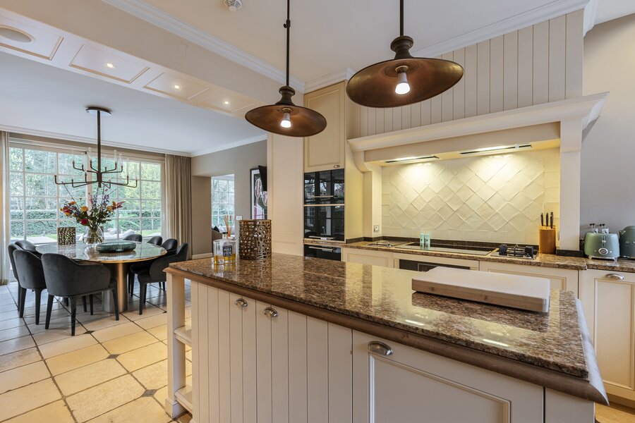 Via een indrukwekkende inkomhal met zicht op de prachtig aangelegde tuin betreedt u de leefruimtes. Deze zijn harmonieus ingedeeld en omvatten een sfeervol salon met gashaard, afgewerkt in Franse natuursteen, een lichtrijke tuinkamer/eetplaats en een stijlvolle woonkeuken. De keuken is uitgerust met kwaliteitsvolle toestellen en alle hedendaags comfort, waaronder een Amerikaanse koelkast, inductiekookplaat, gasvuur, ingebouwde frietketel, oven en vaatwasser. Daarnaast biedt de keuken een gezellige zithoek en een prachtig uitzicht op de tuin.