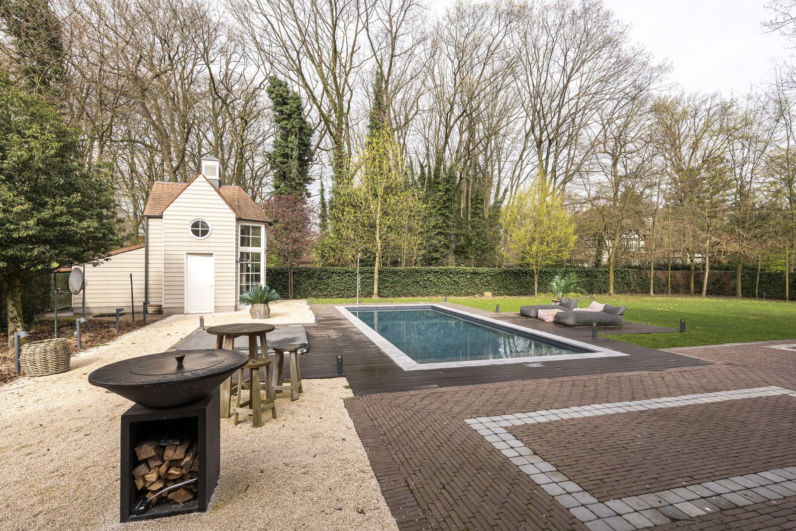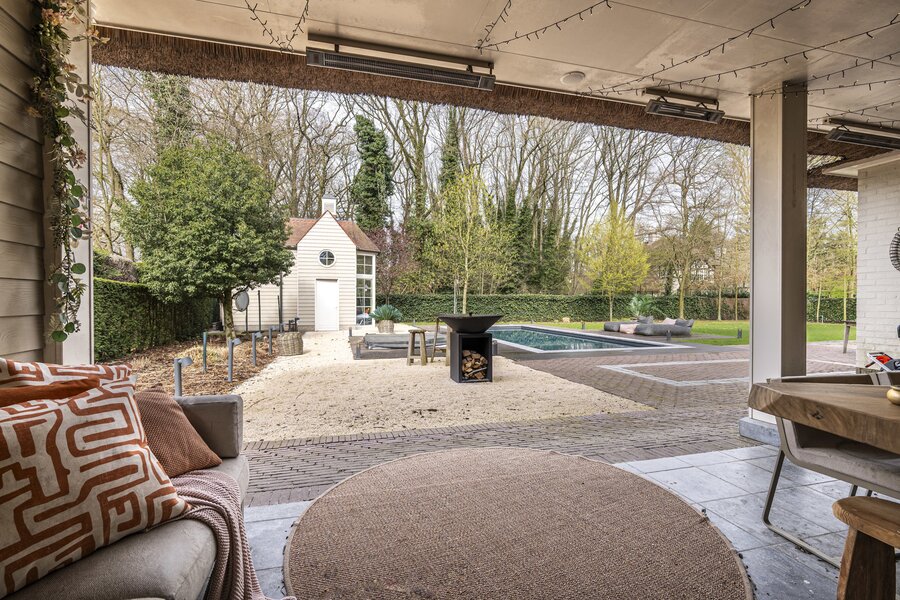 Buitengebeuren: Het overdekte terras, uitgerust met terrasverwarming en een ingebouwde muziekinstallatie, sluit naadloos aan op de keuken en biedt een prachtig zicht op de tuin met maximale privacy. Aansluitend bevindt zich een verwarmd biozwembad en een jacuzzi. Achteraan het perceel bevindt zich een bijgebouw in dezelfde stijl als de woning, met tuinberging, tevens voorzien van de technische installatie voor het zwembad. Het volledige eigendom is omheind en afgesloten met een automatische toegangspoort. Vooraan is er bijkomende parkeergelegenheid en een extra dubbele carport.