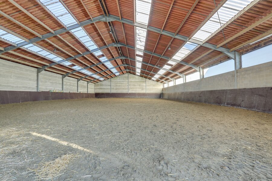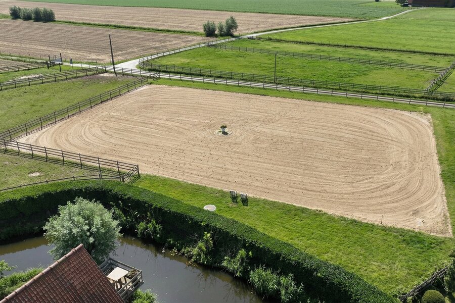 The property further features an indoor arena (approx. 35 x 20 m) and a professionally constructed, drained outdoor arena (approx. 40 x 60 m). Additional facilities include a wash area with solarium, tack room, rug room, dedicated laundry for horse equipment and blankets, and a separate feed room with silo. At the rear of the estate, space is foreseen for the installation of a horse walker.