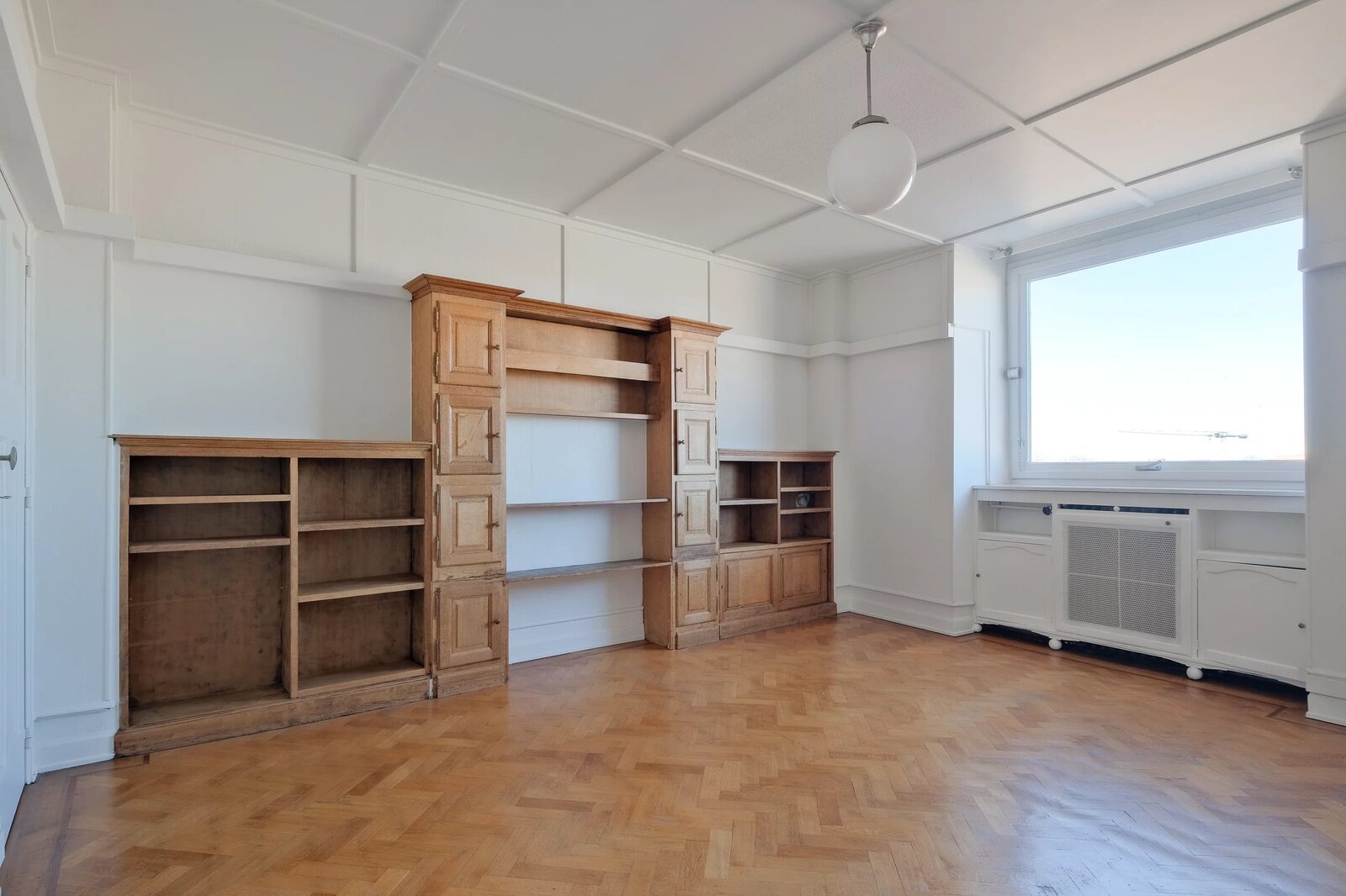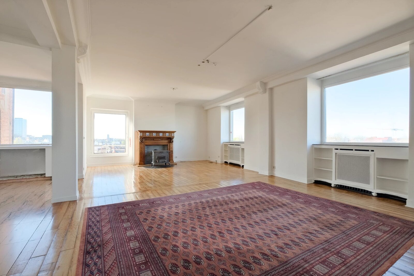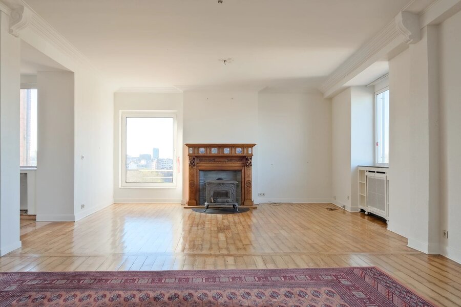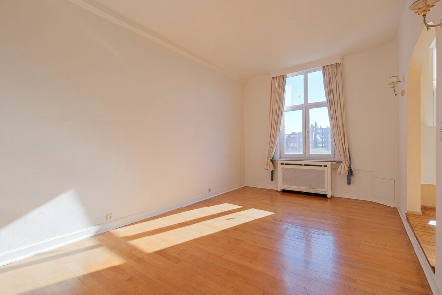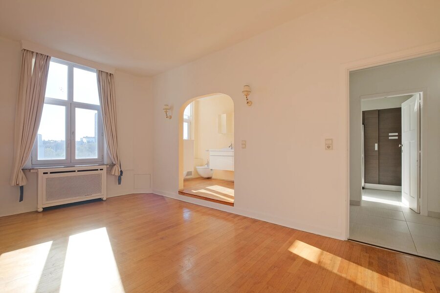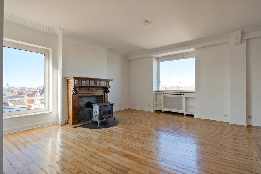 Square of Val de la Cambre, near the Étangs d’Ixelles and Bois de la Cambre, a magnificent apartment with a total gross area of approximately 183 m², with converted attics of approximately 30 m² gross, featuring a southwest-facing terrace. It is composed as follows: entrance hall, living room of approximately 67 m², separate kitchen, separate WC, hallway, master bedroom of approximately 18.5 m² with shower room (bidet and WC), second bedroom of approximately 11.5 m² (legal situation: dressing room) with adjoining bathroom (with bidet), third bedroom of approximately 25 m².