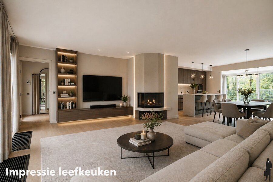 Gelijkvloerse verdieping: U betreedt de woning via de ruime inkomhal, die rechts toegang biedt tot de lichtrijke woonkamer. Grote raampartijen tot op de grond zorgen voor veel natuurlijk daglicht en een aangenaam zicht op de tuin. Aansluitend bevindt zich de veranda, die de leefruimte op een mooie manier uitbreidt en het binnen- en buitengevoel naadloos met elkaar verbindt.