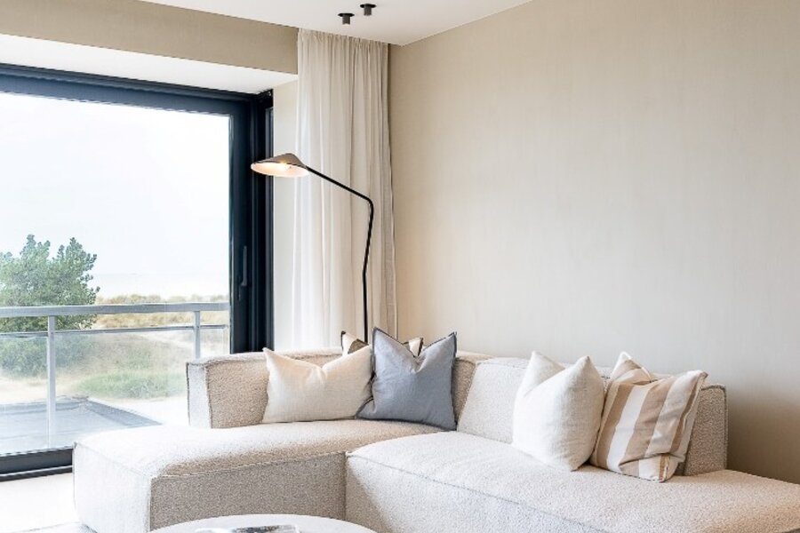 De brede gevel zorgt voor een prachtig uitzicht op zee en duinen vanuit de lichtrijke leefruimte met open keuken, zithoek en eethoek. Verder bestaat het appartement uit 2 ruime slaapkamers, elk met eigen douchekamer en dressing. Beide slaapkamers hebben directe toegang tot het zonnige, zuidgeoriënteerd terras. De derde kamer kan zowel dienst doen als bureau of als derde slaapkamer.