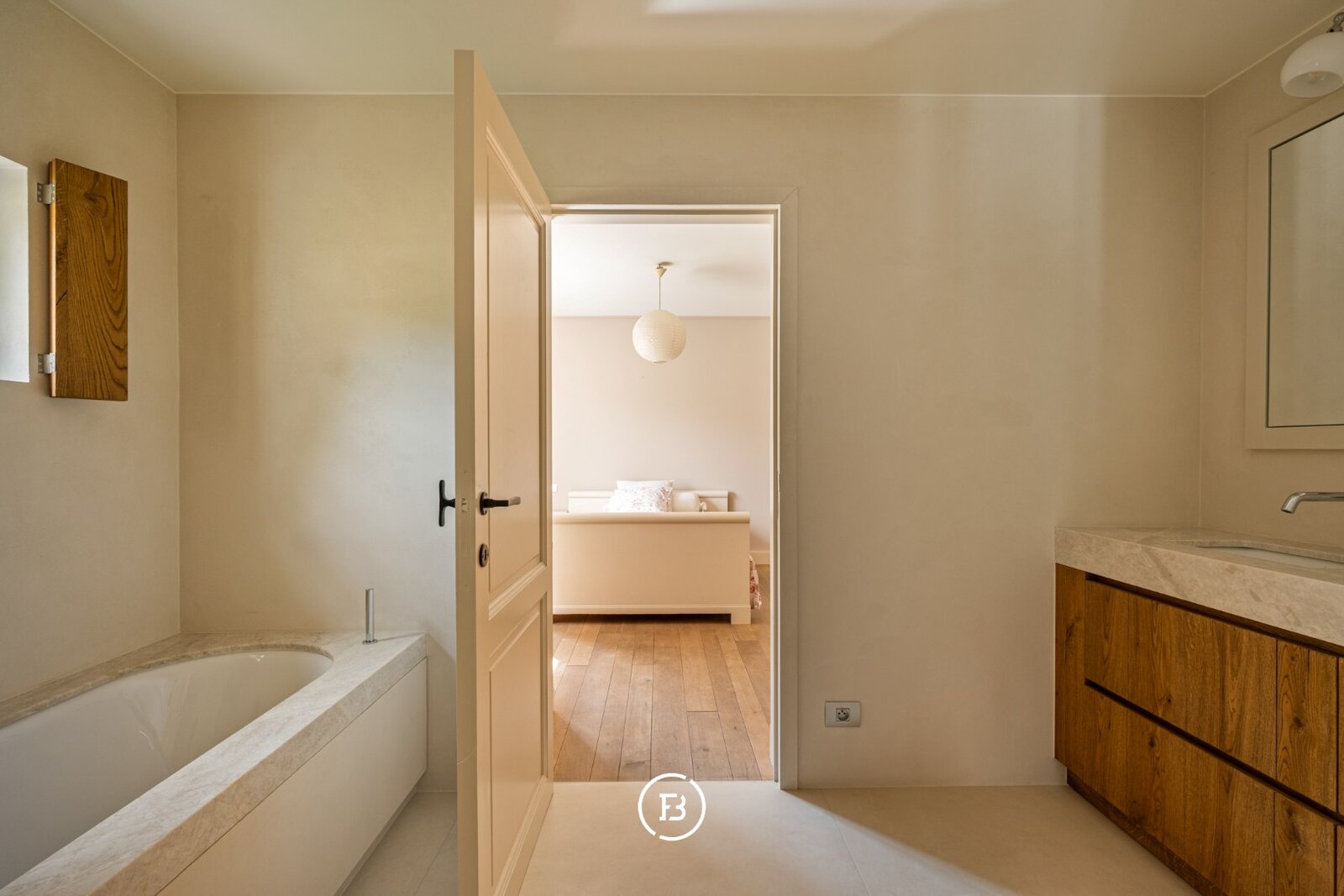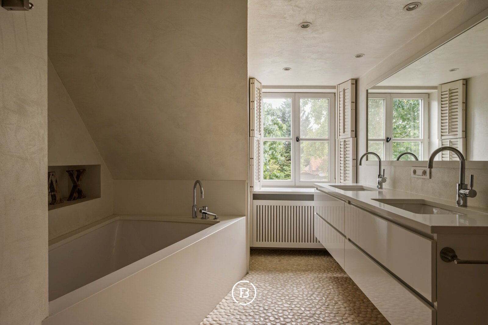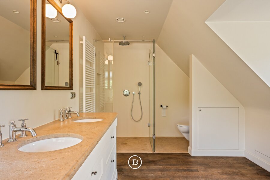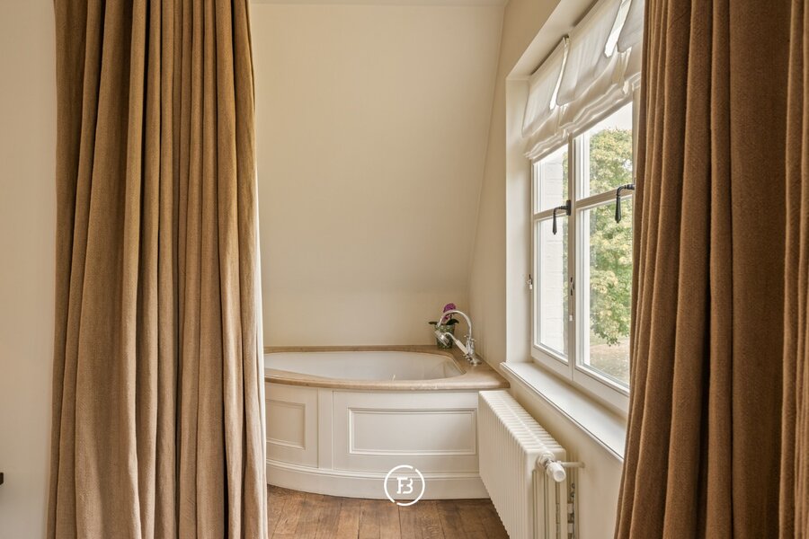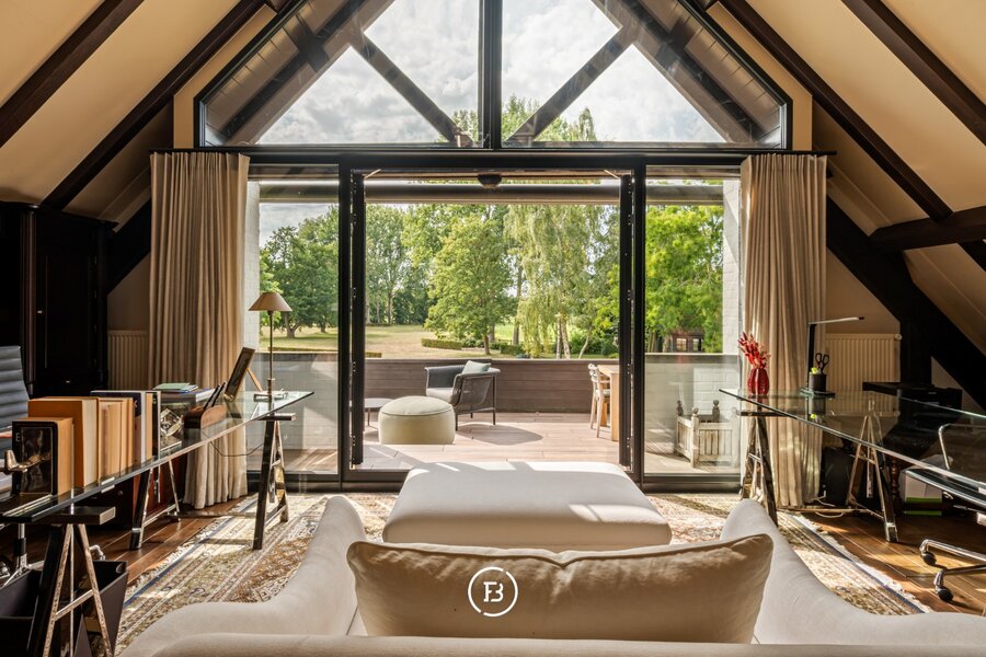 De villa ademt een warme grandeur. Bij het binnenkomen opent zich een royale leefruimte, met een open haard. De bibliotheek, een plek van rust en concentratie, grenst aan een terras vanwaar je uitkijkt over het domein. De leefkeuken vormt het hart van het huis, gezellig en verbonden met een ruim terras. Op het gelijkvloers bevinden zich bovendien twee slaapkamers, een comfortabele badkamer en een dubbele garage. Boven wachten drie ruime kamers, waaronder een master suite met dressing en eigen badkamer. Aparte badkamer voor de andere kamers.