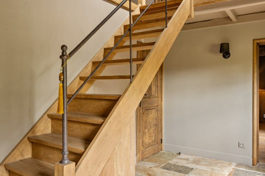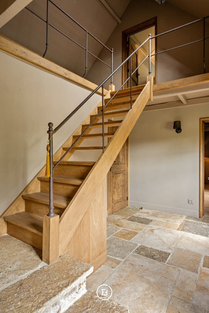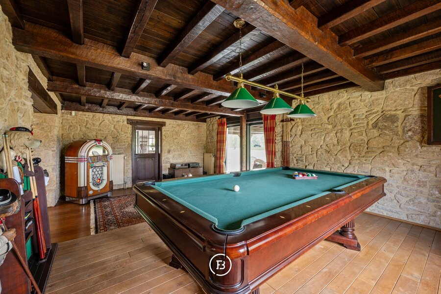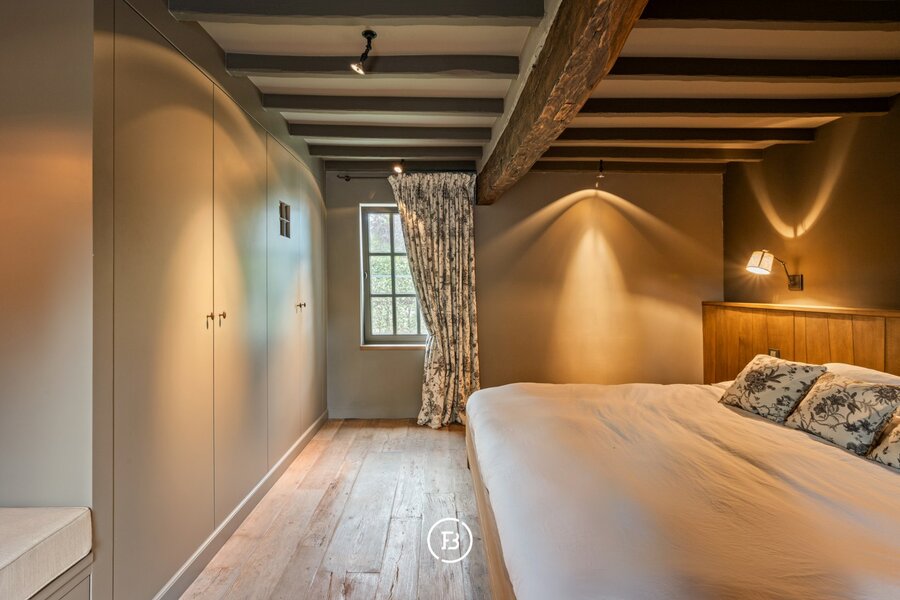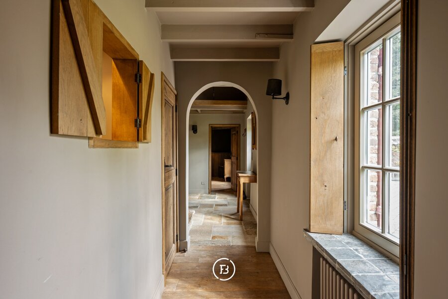 De hoeve, volledig gerenoveerd met behoud van authentieke details, vormt een verhaal apart. Haar robuuste muren en houten balken herinneren aan het verleden, terwijl de indeling – met twee slaapkamers, badkamer, open bureau en landelijke keuken met open haard – hedendaags comfort biedt zonder de ziel van het gebouw te verliezen.