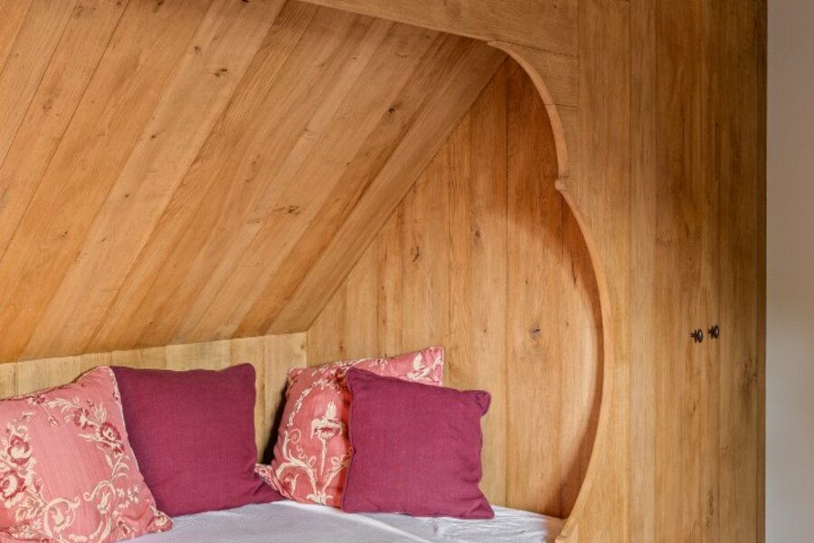 Verderop, discreet gelegen in het groen, staat een tiny house. Compact, maar volledig uitgerust, ideaal als gastenverblijf of atelier.