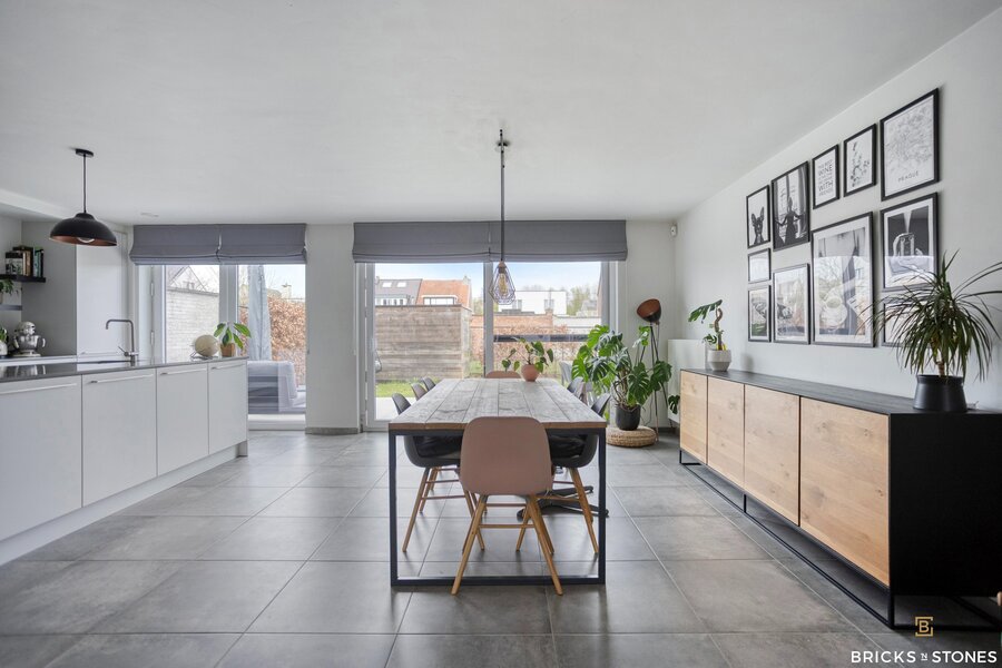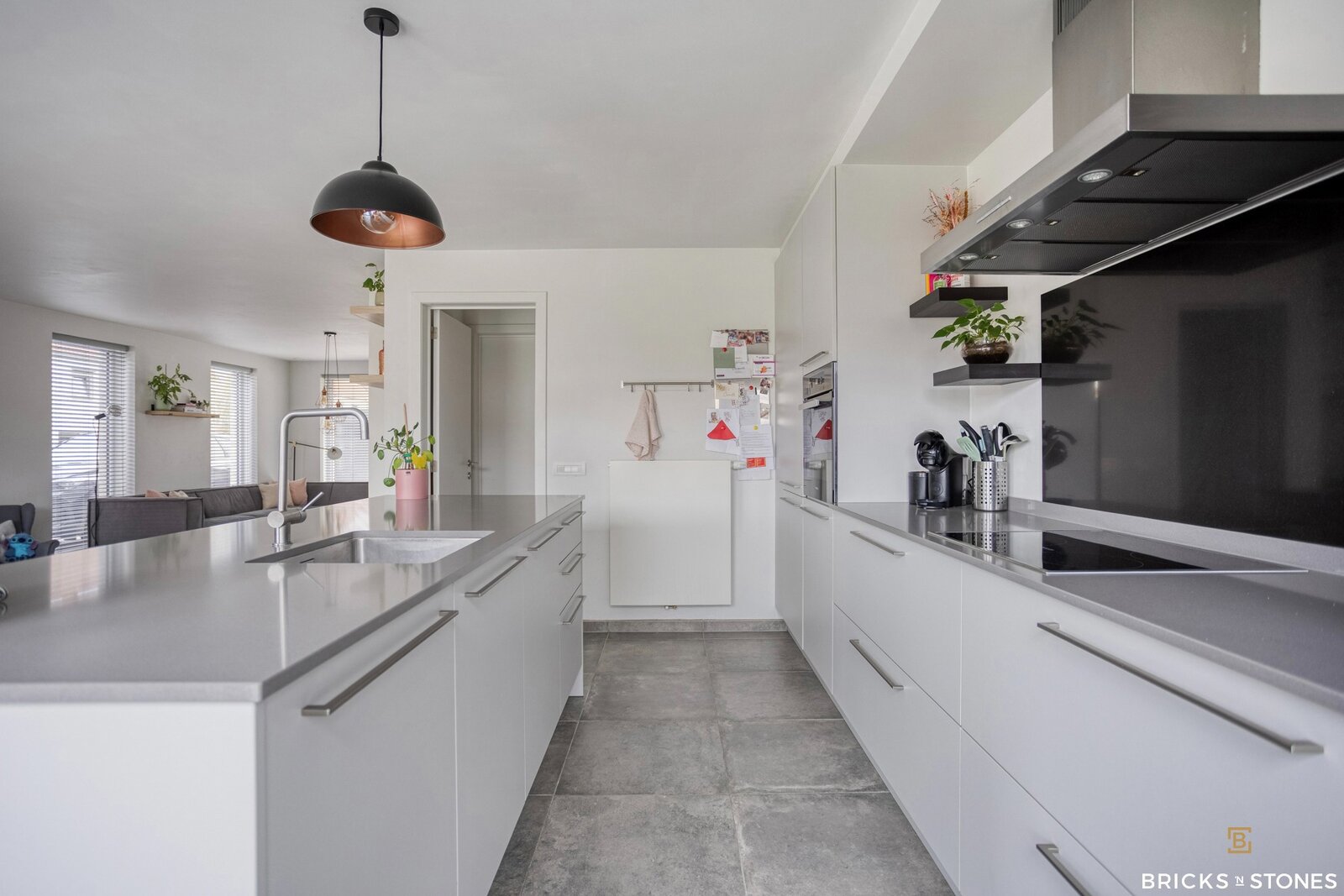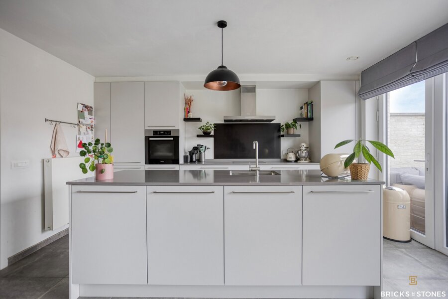 We betreden de woning via een verzorgde inkomhal met gastentoilet, die meteen toegang geeft tot de leefruimte. De open leefruimte baadt in het licht dankzij de grote raampartijen en biedt een aangename connectie met de tuin. De keuken met eiland sluit naadloos aan op de eetplaats en zithoek en is uitgerust met kwaliteitsvolle Miele toestellen.. Aansluitend bevindt zich een praktische berging met aansluiting voor wasmachine en droogkast;