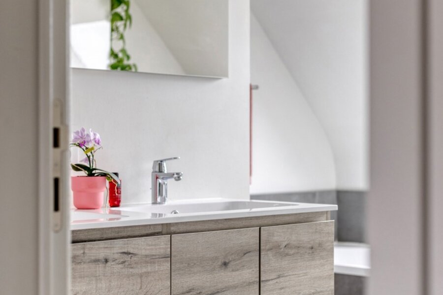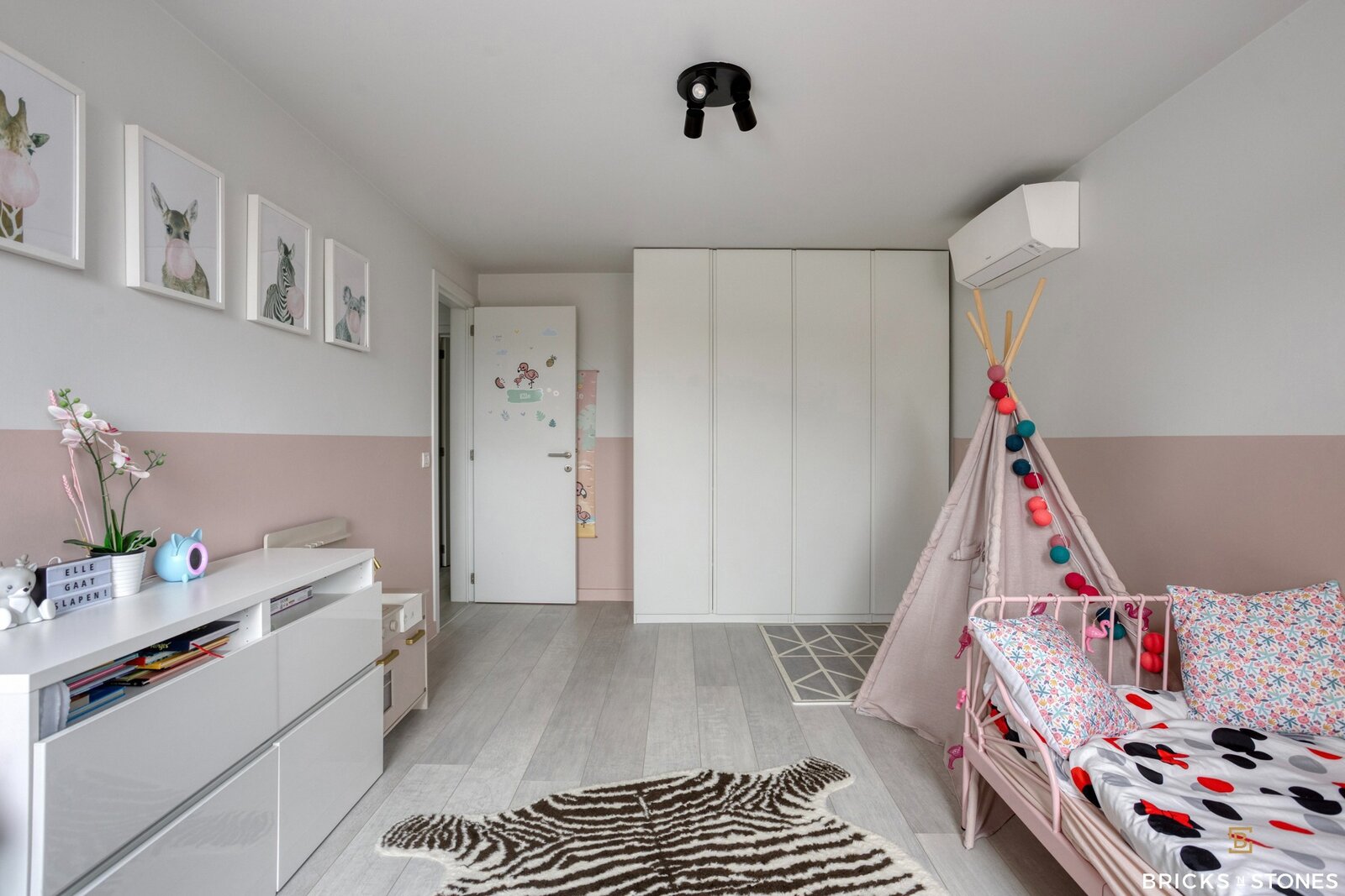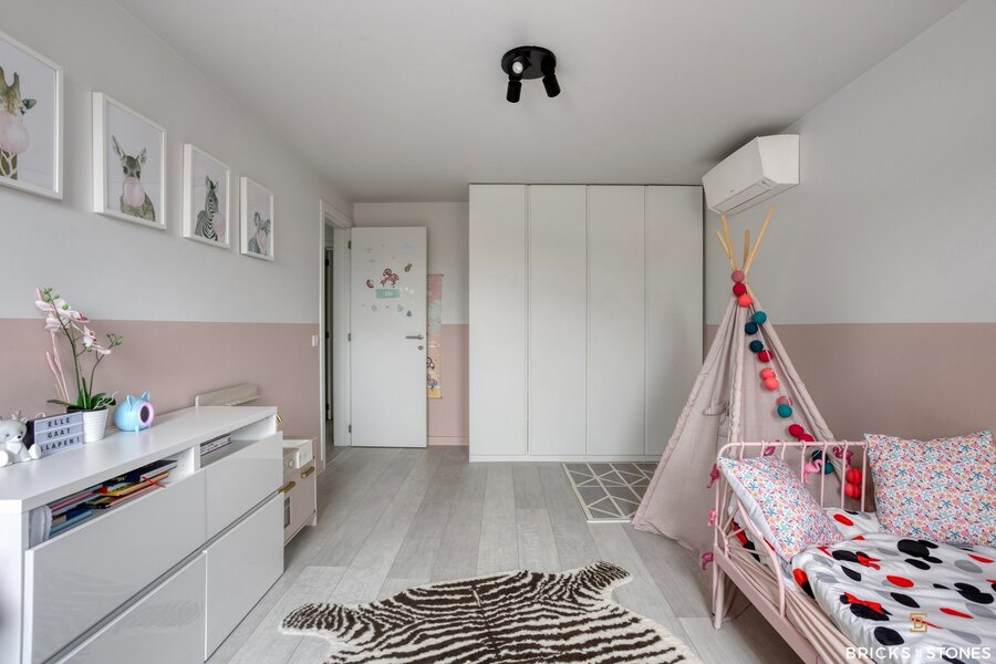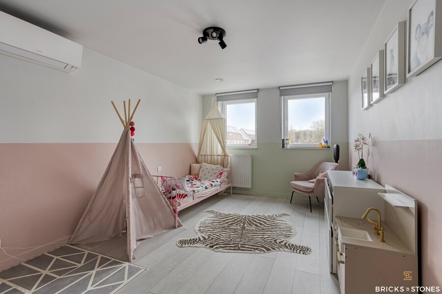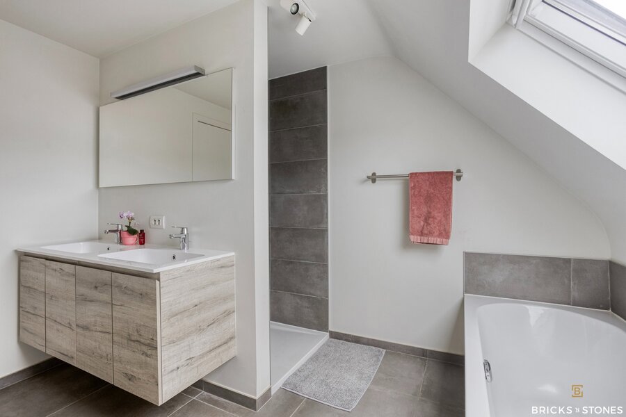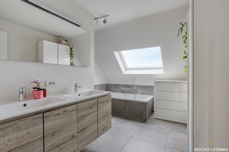 Op de eerste verdieping bevinden zich drie good-sized slaapkamers (ca. 16 -14-14 m²) en een strakke badkamer uitgerust met zowel bad als douche en dubbele wastafel. De indeling is hier perfect afgestemd op een gezin, met voldoende ruimte en privacy voor iedereen.