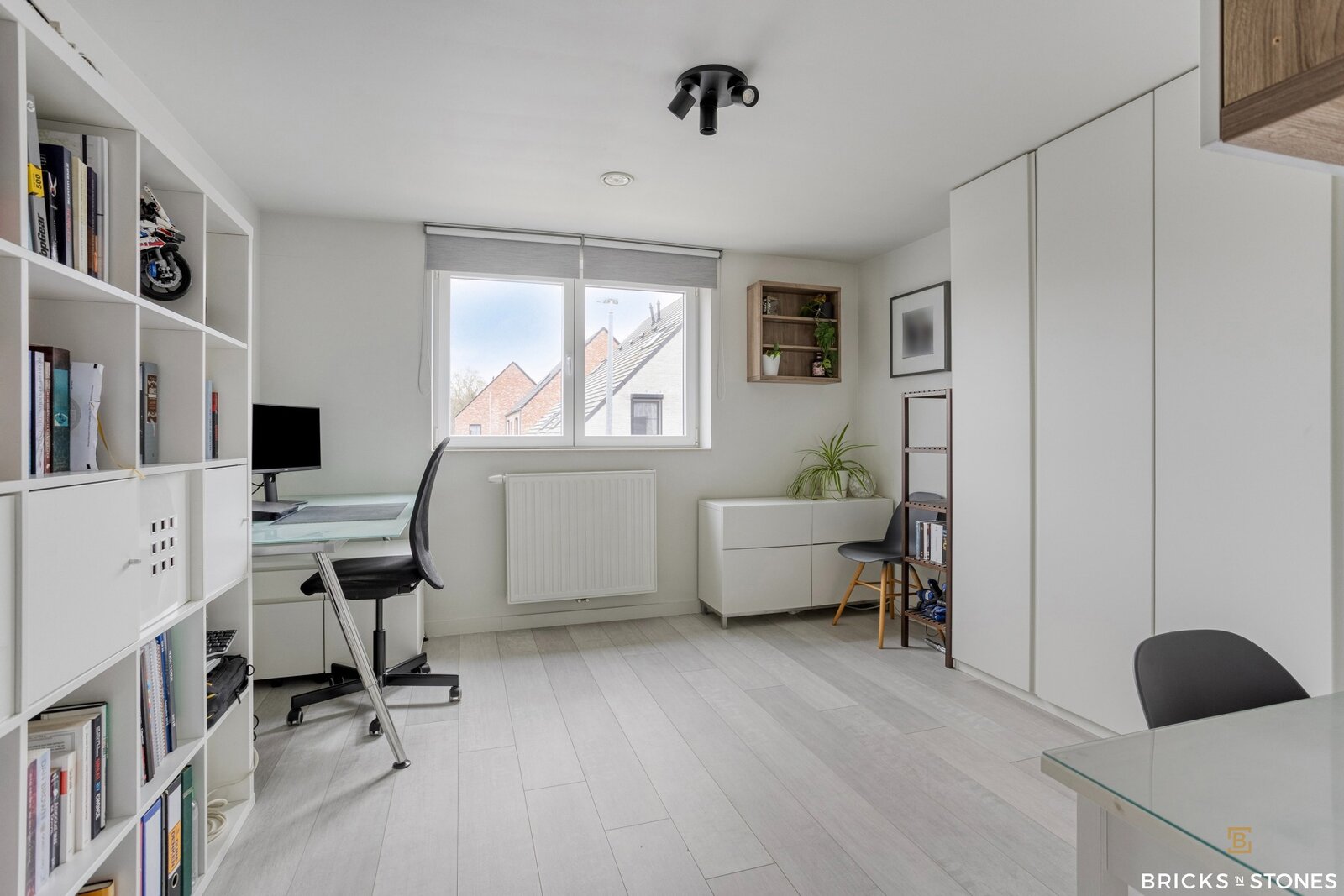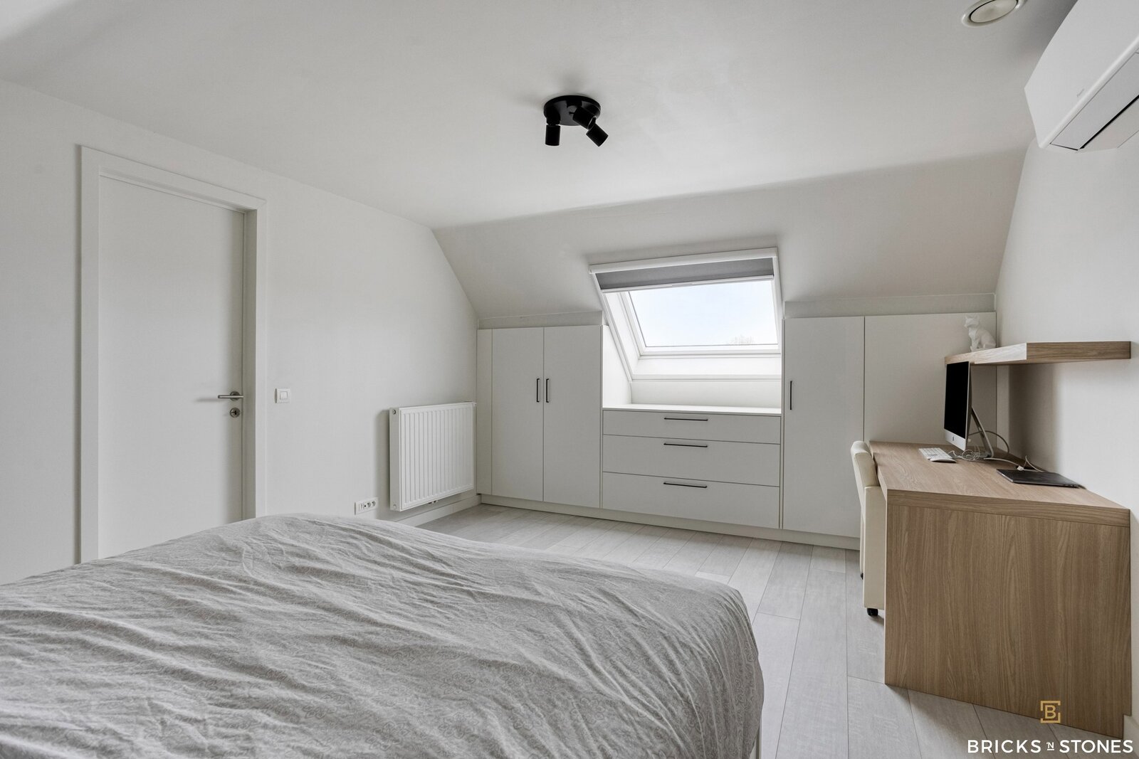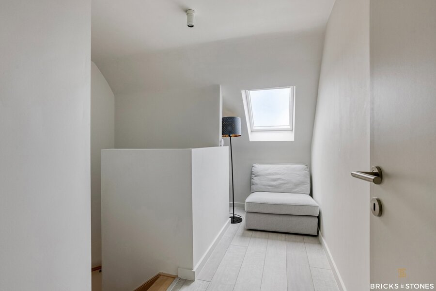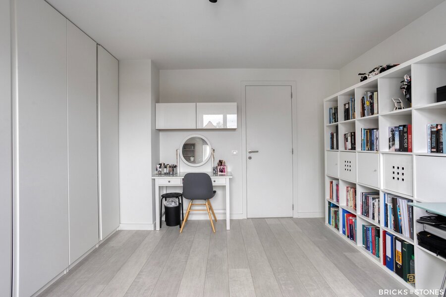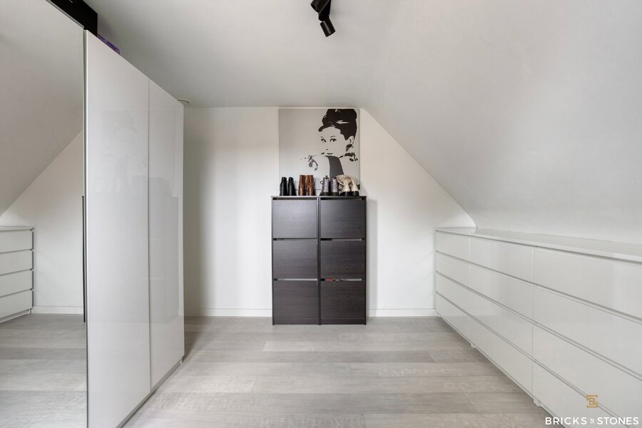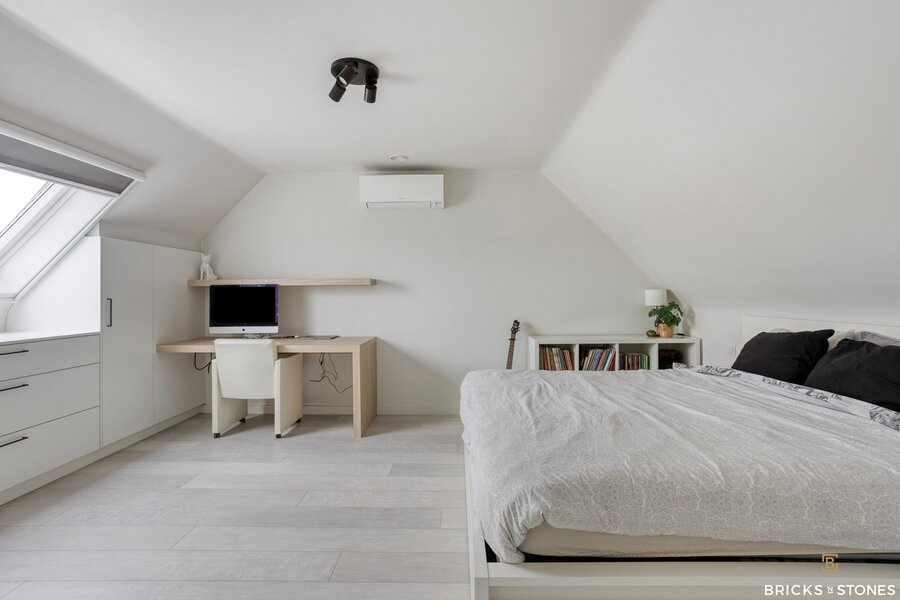 De tweede verdieping biedt een volwaardige master bedroom afgewerkt met maatwerk, en bijkomende bergruimte/technische ruimte.