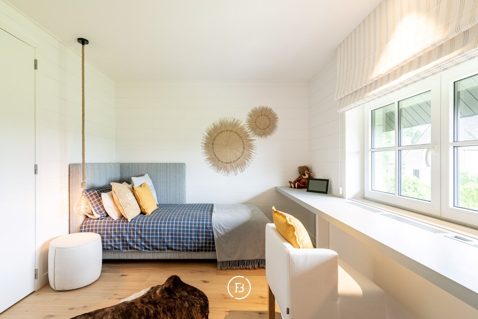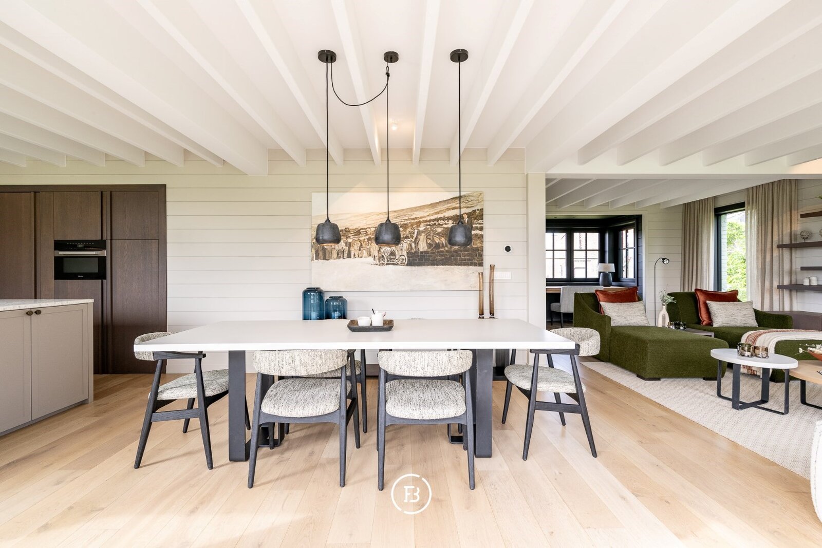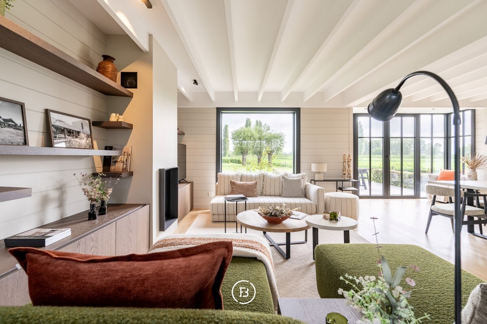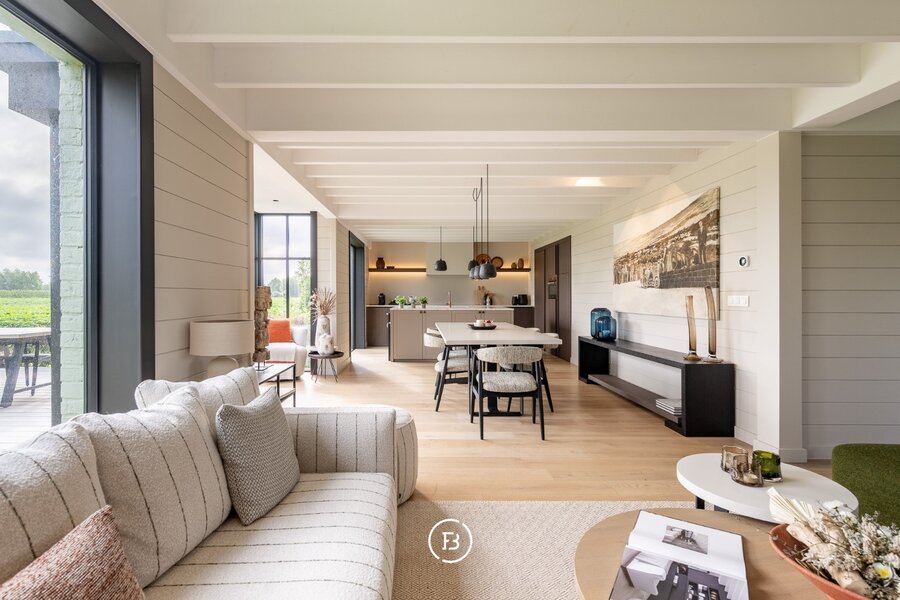 De leefruimte is lichtrijk en sfeervol, met een directe verbinding naar het terras en de tuin. Dankzij de grote raampartijen vloeien binnen- en buitenleven naadloos in elkaar over.