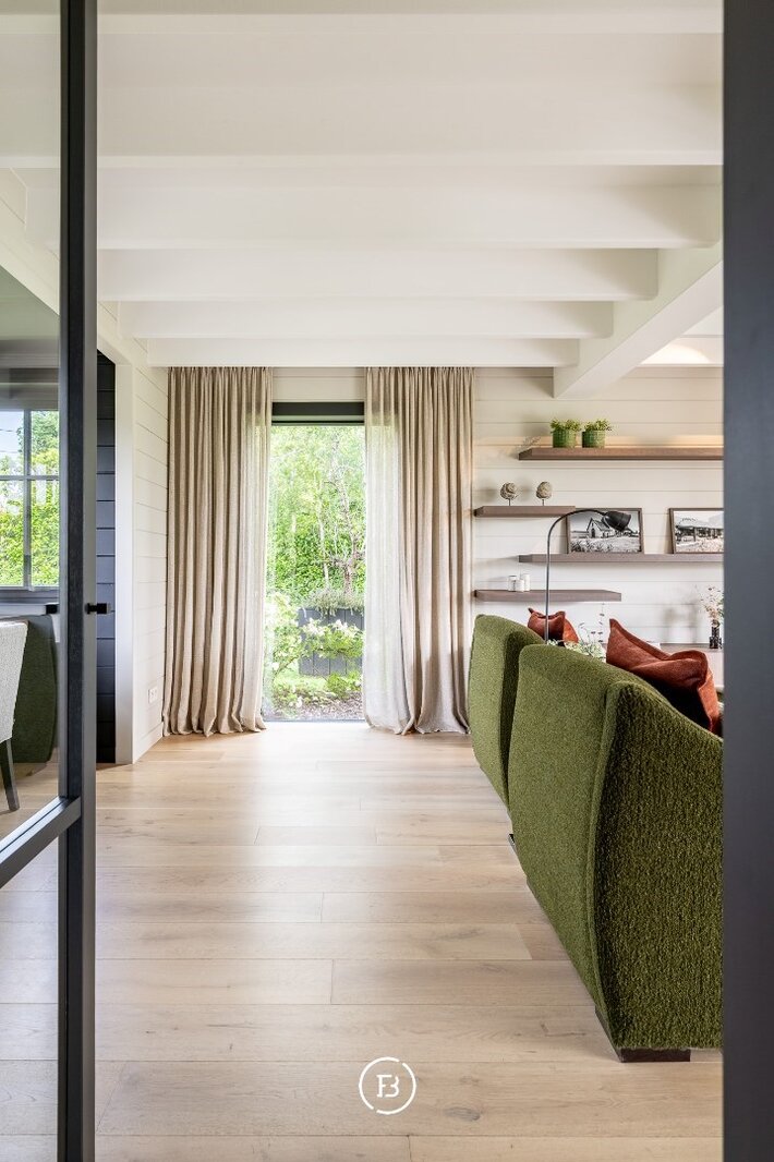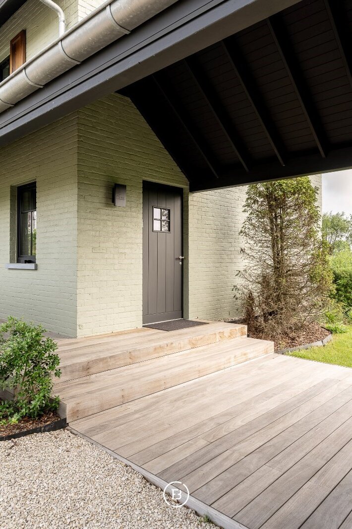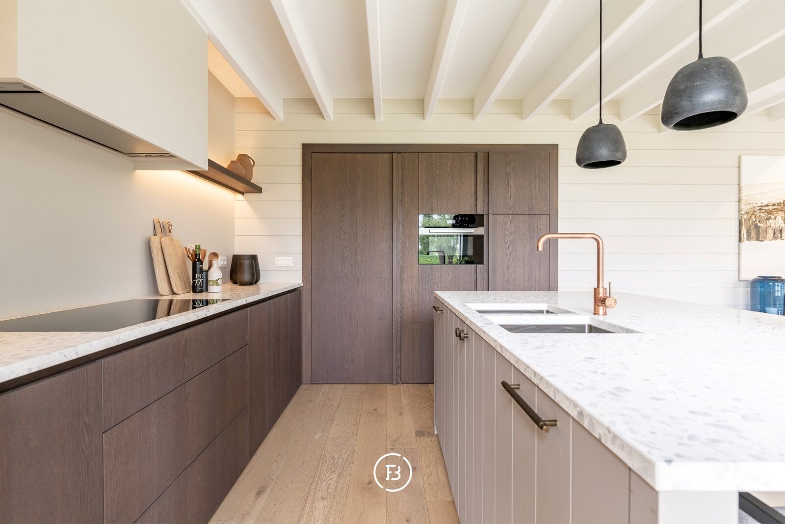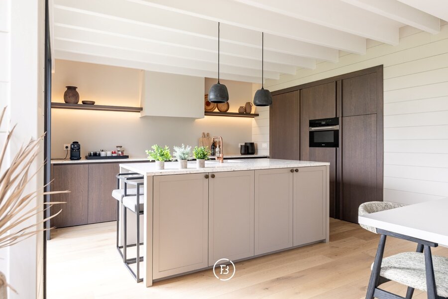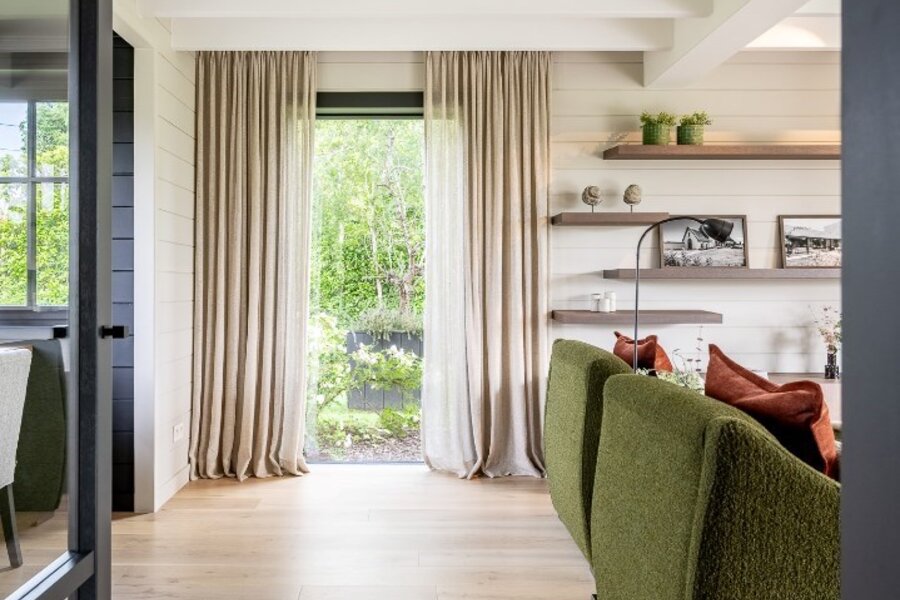 De leefruimte is lichtrijk en sfeervol, met een directe verbinding naar het terras en de tuin. Dankzij de grote raampartijen vloeien binnen- en buitenleven naadloos in elkaar over.
