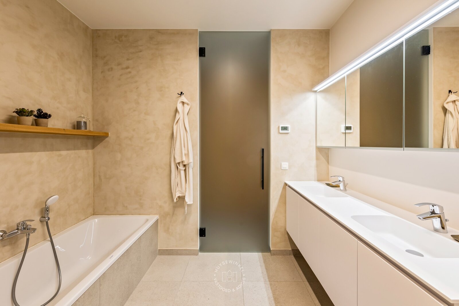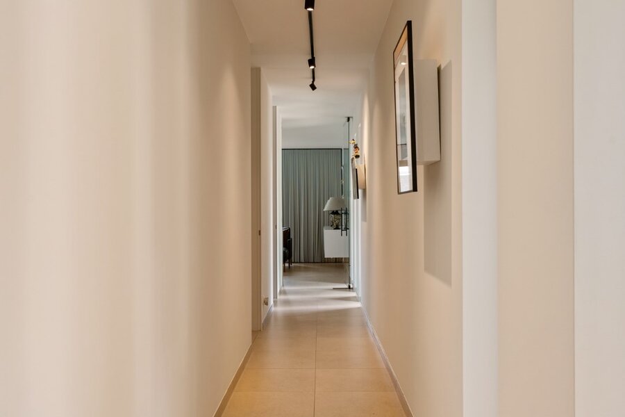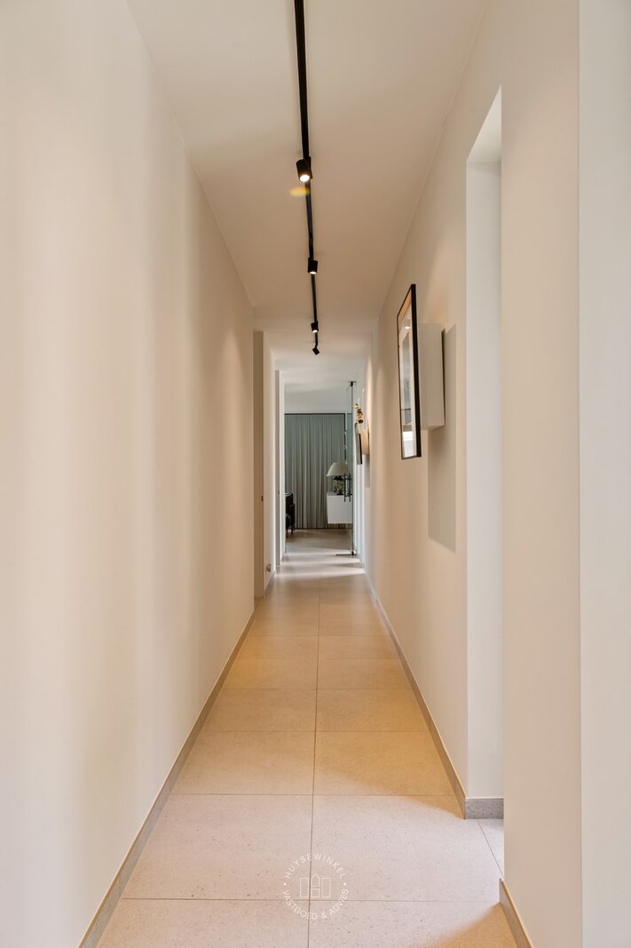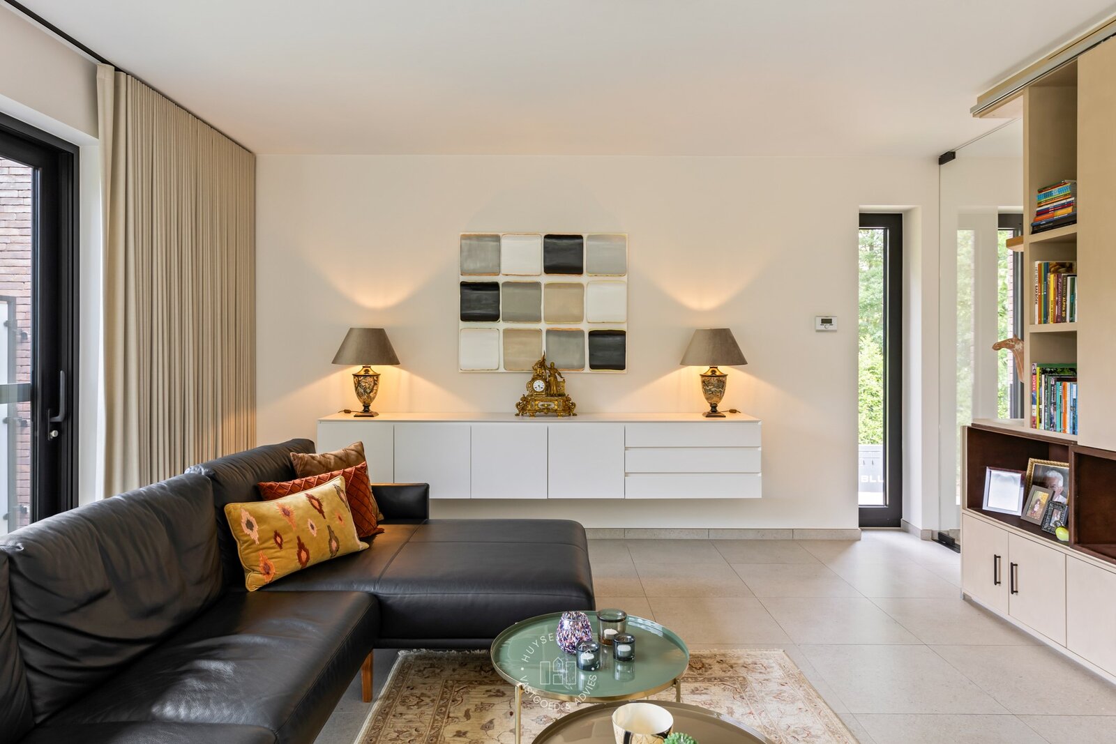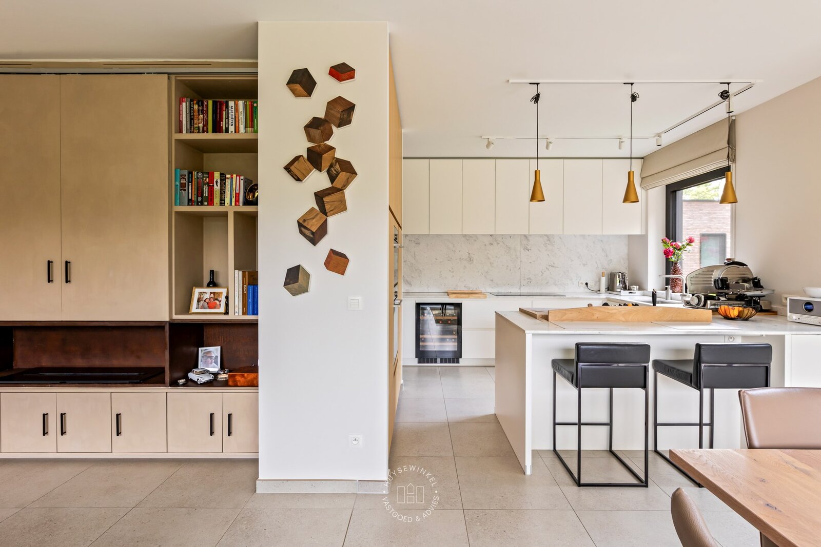 Het appartement onderscheidt zich door grote raampartijen die overvloedig licht binnenbrengen en een harmonieus interieur waarin hoogwaardig maatwerk subtiel verweven zit. Vanuit de inkomhal bereikt men de leefruimte, ingericht met een comfortabele zithoek en eetplaats, beide met toegang tot het terras en zicht op de volgroeide tuin.