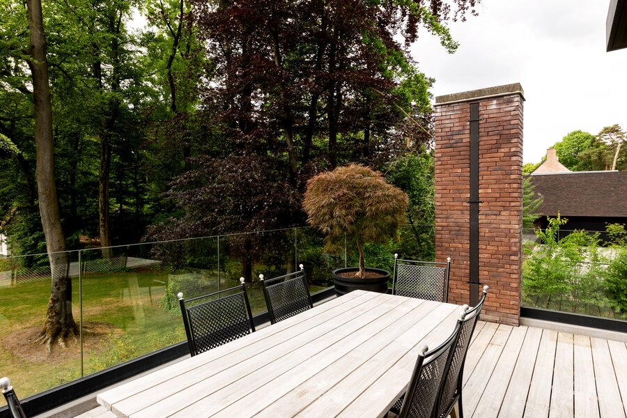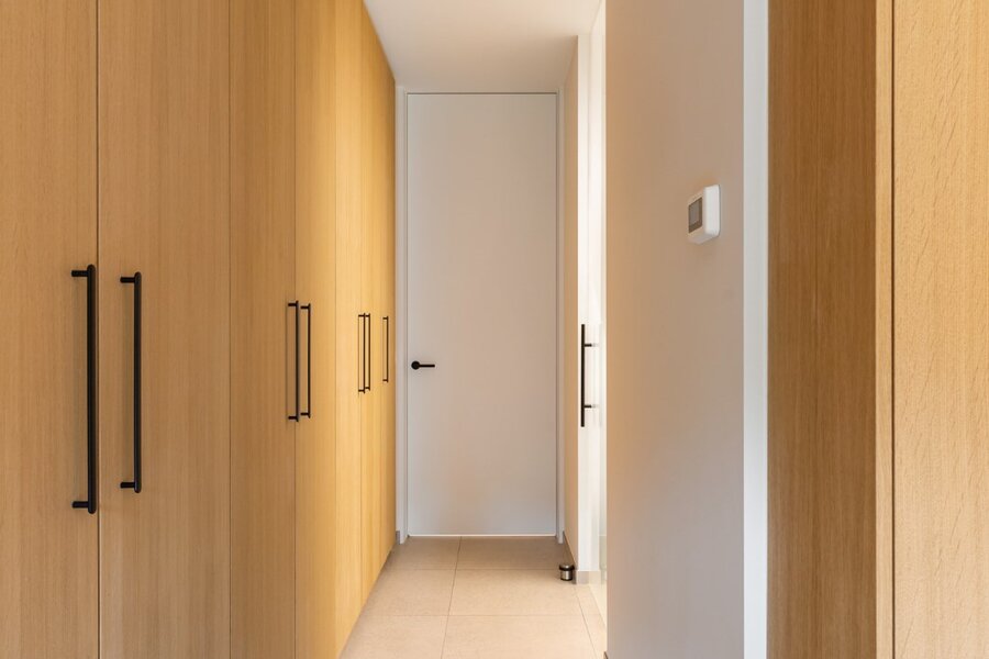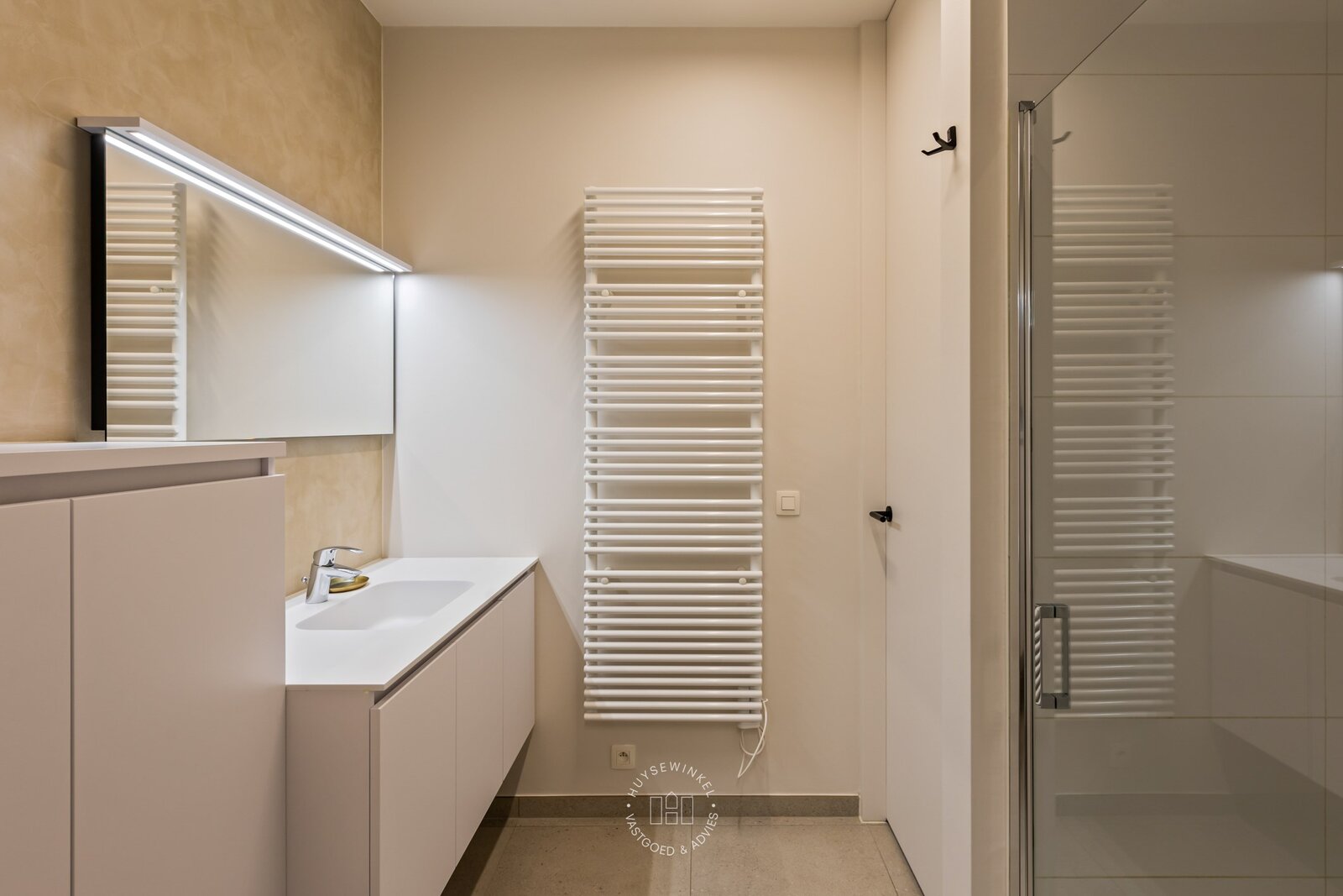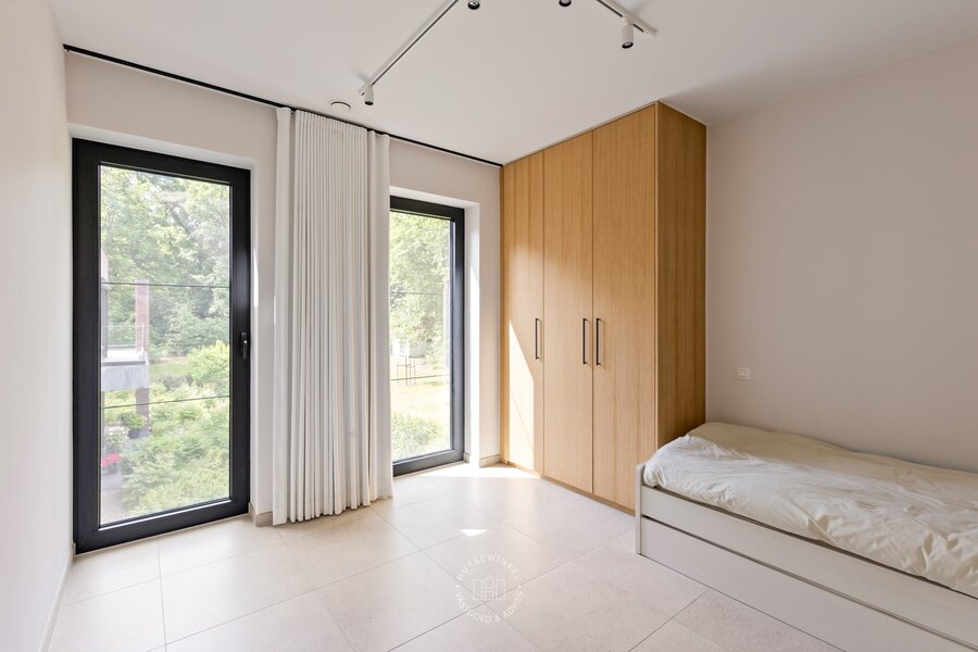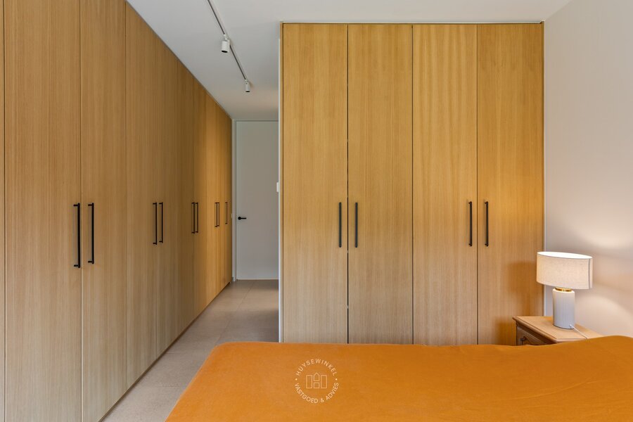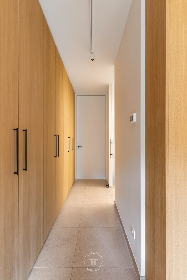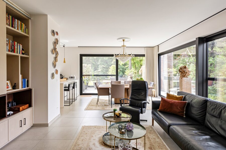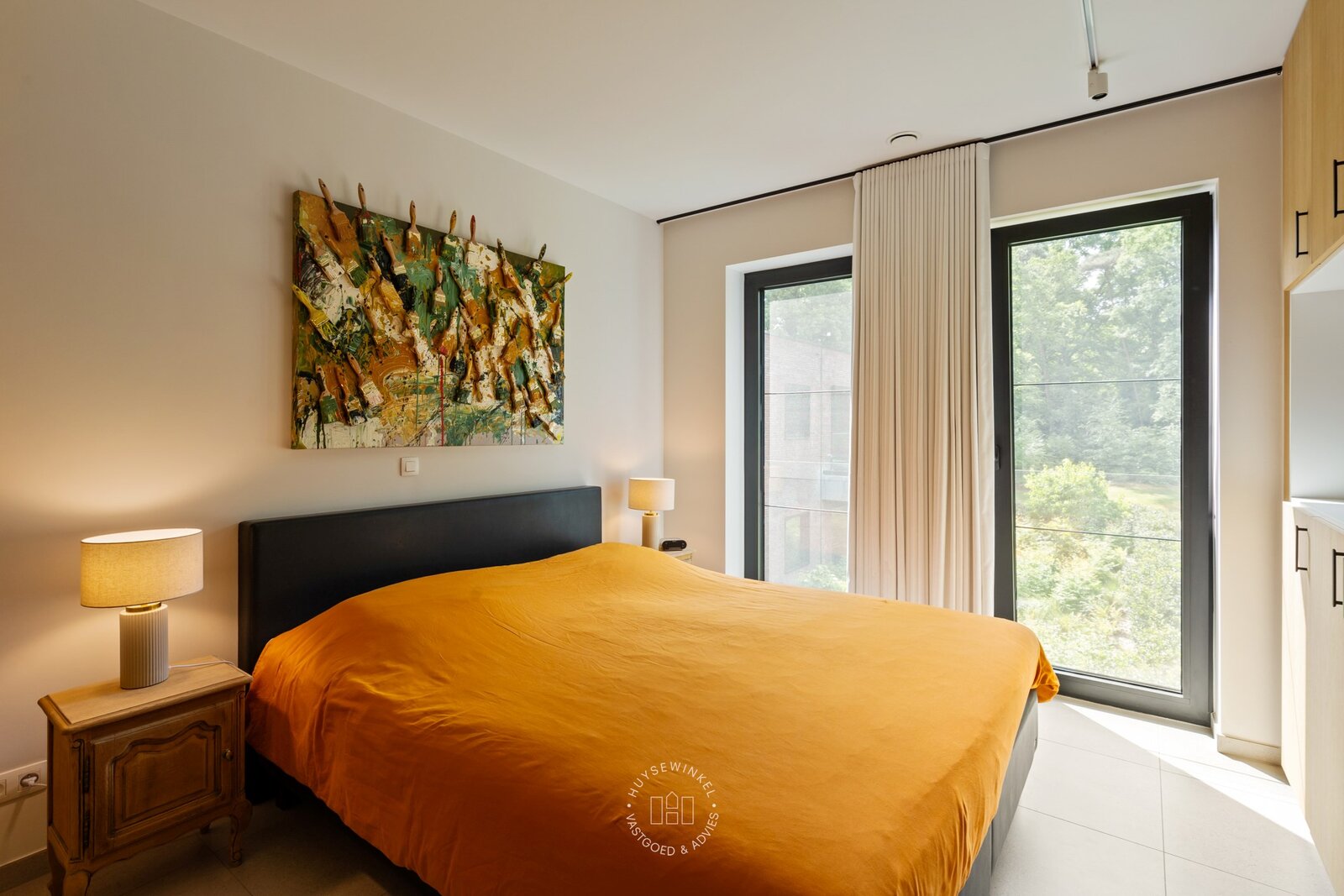 Het appartement onderscheidt zich door grote raampartijen die overvloedig licht binnenbrengen en een harmonieus interieur waarin hoogwaardig maatwerk subtiel verweven zit. Vanuit de inkomhal bereikt men de leefruimte, ingericht met een comfortabele zithoek en eetplaats, beide met toegang tot het terras en zicht op de volgroeide tuin.