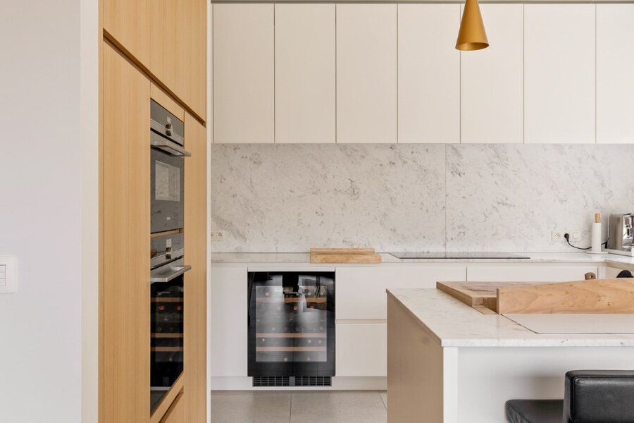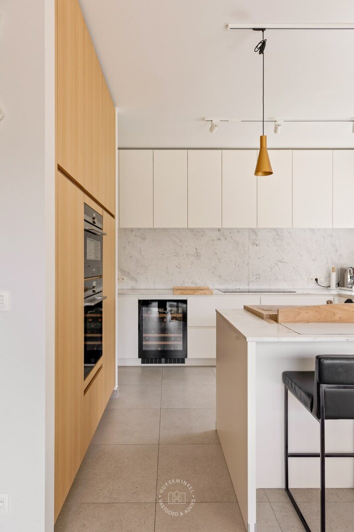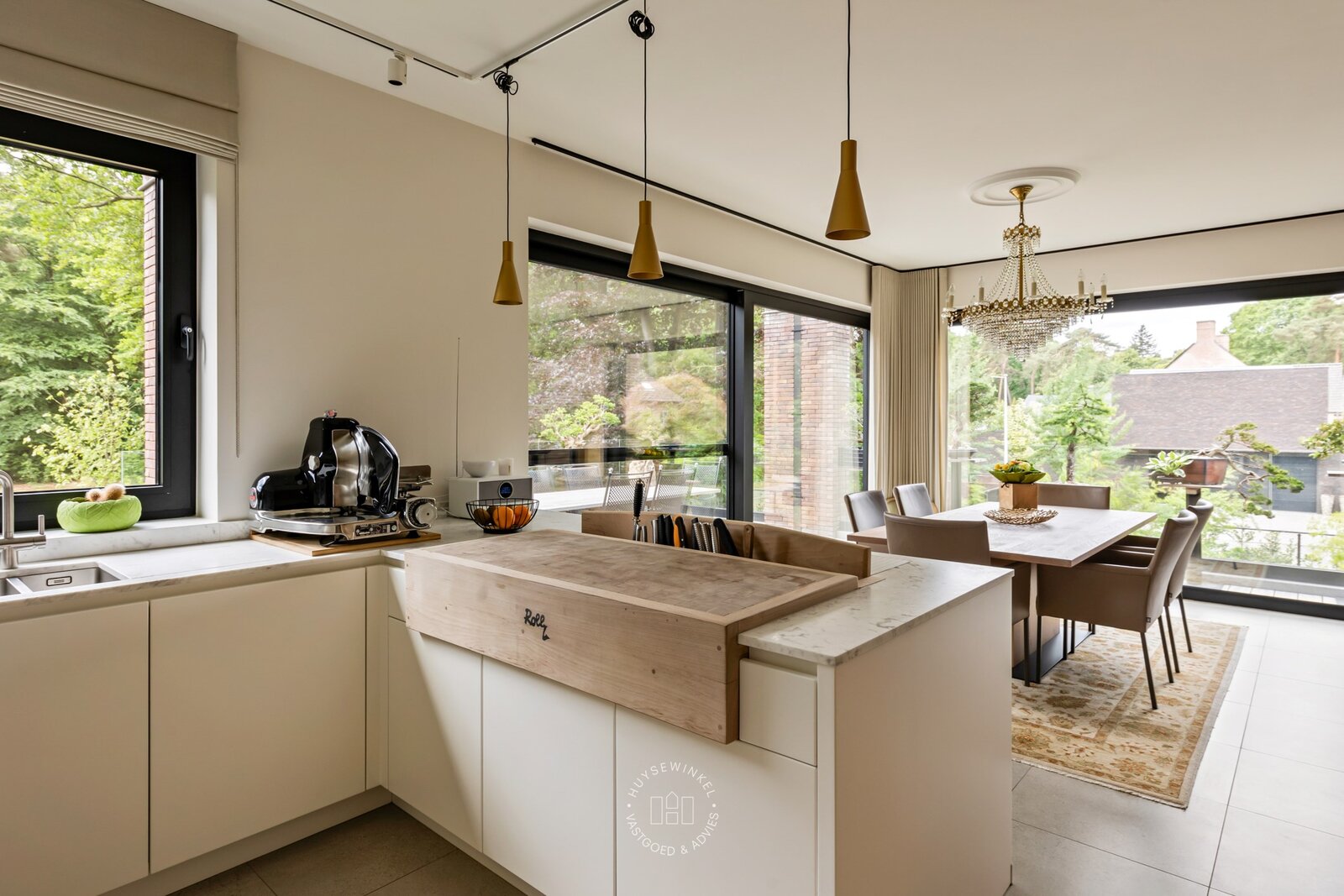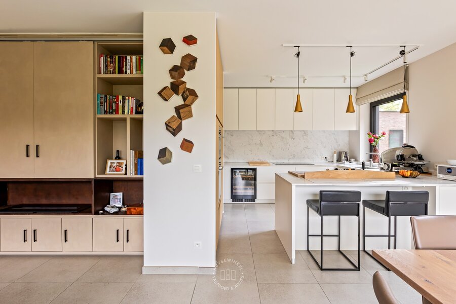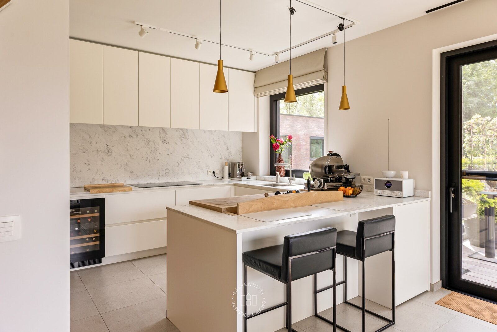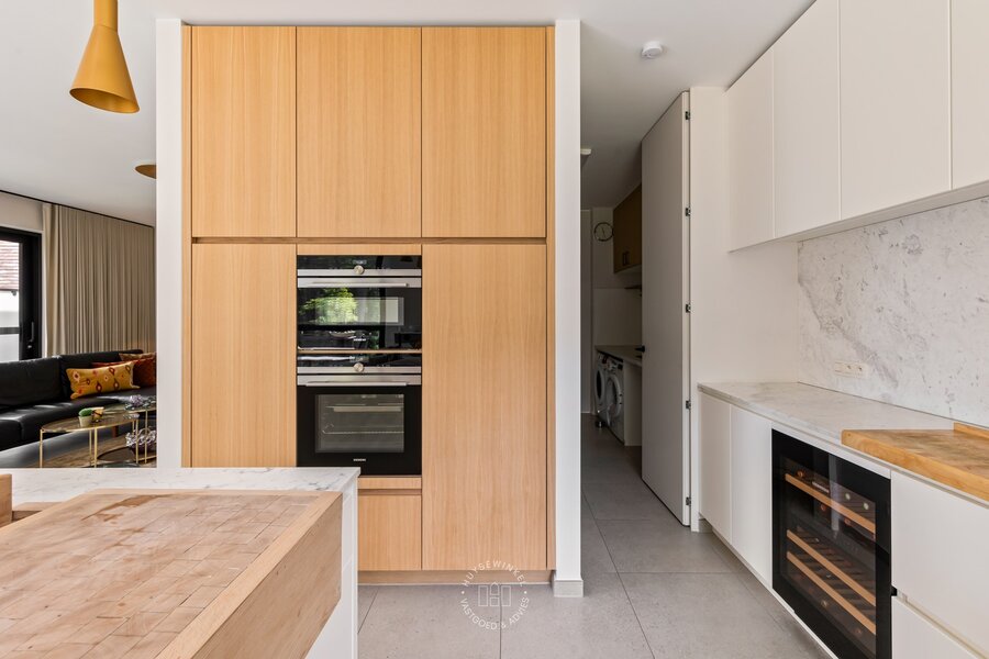 De keuken is volledig uitgevoerd in maatwerk en uitgerust met moderne toestellen, ideaal geschikt voor wie graag kookt of een creatieve werkplek wenst. Aansluitend bevindt zich een praktische bijkeuken en wasplaats.