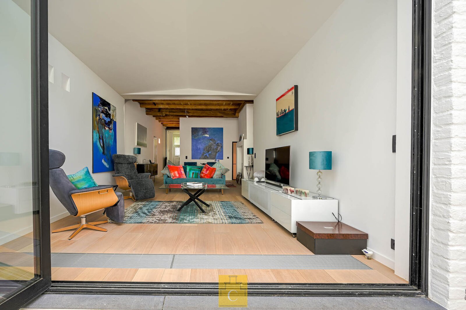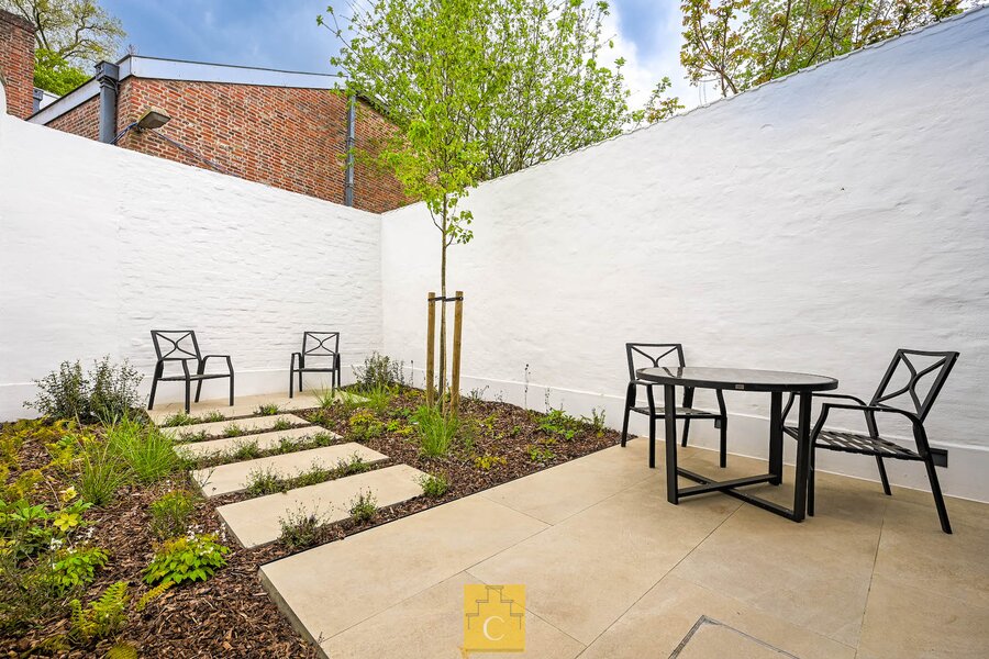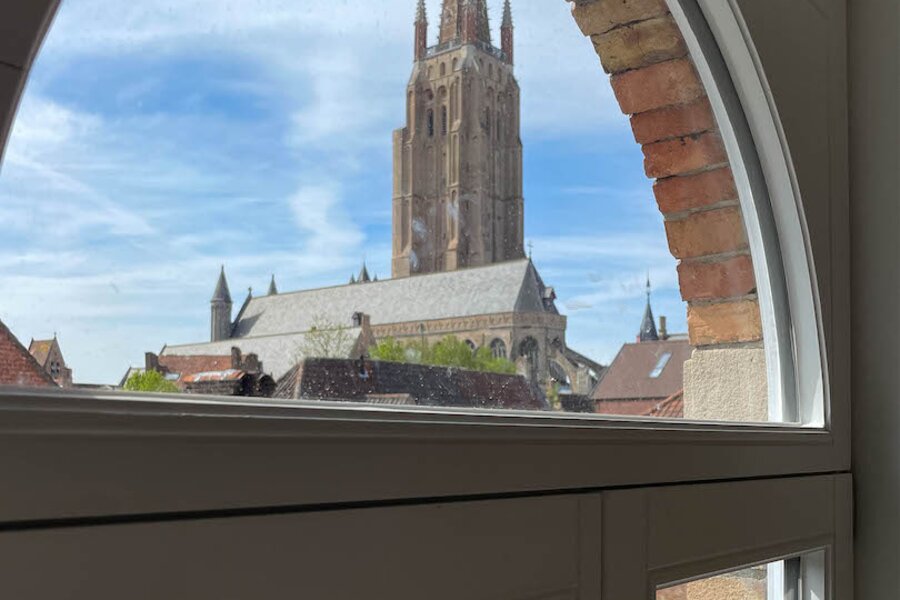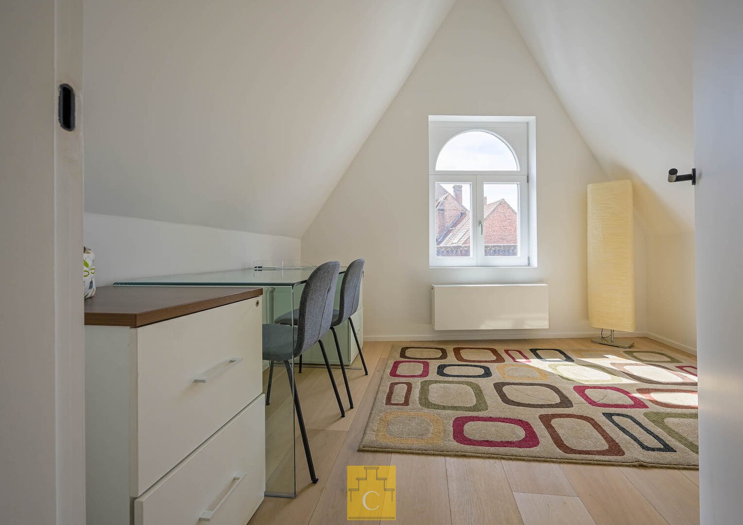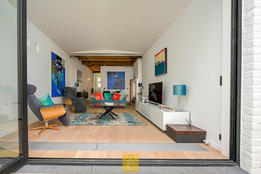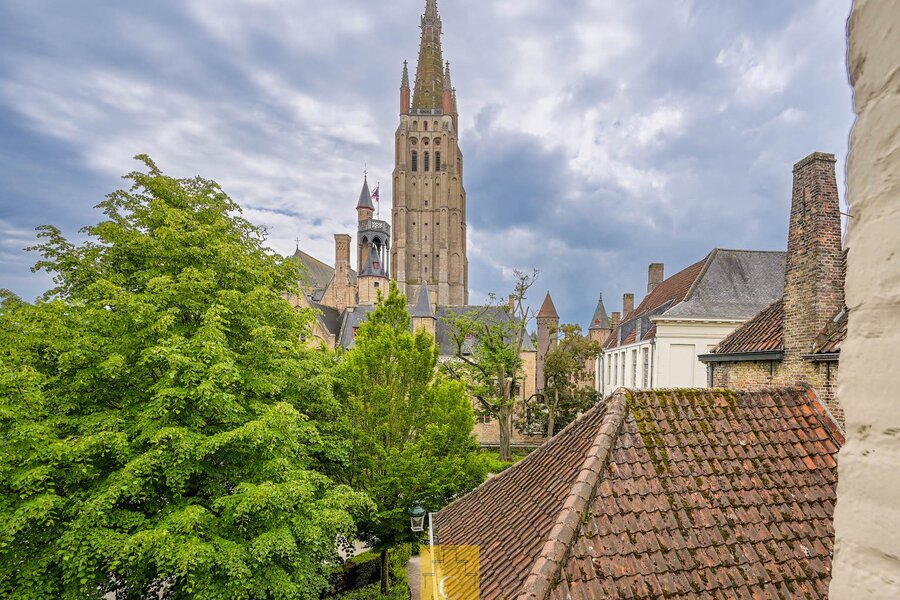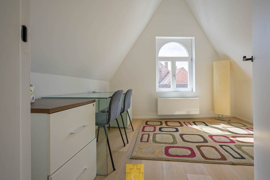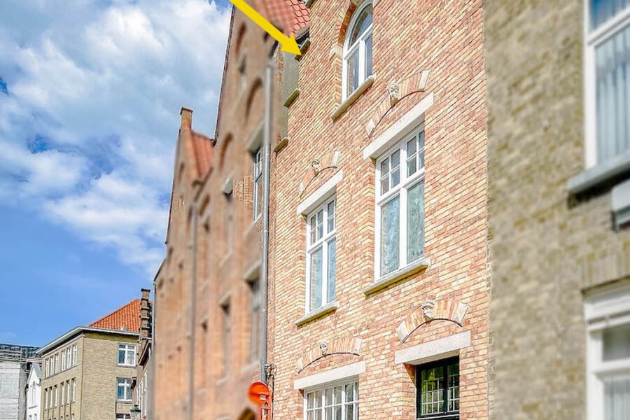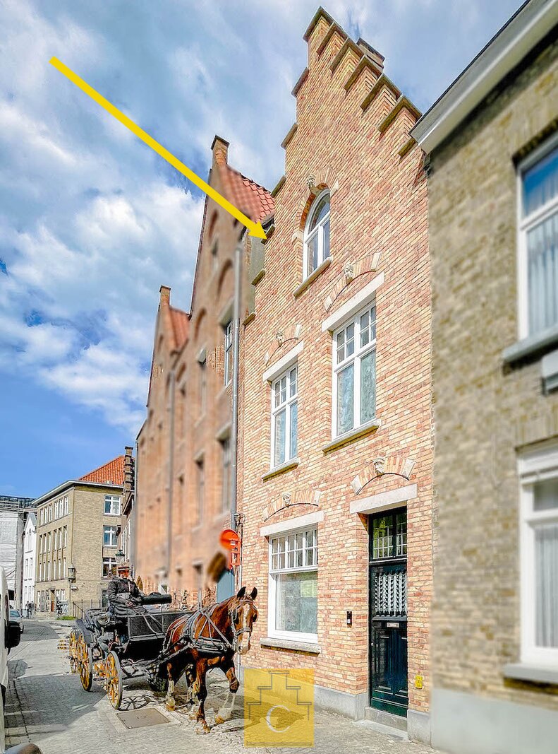 Een schilderachtige locatie in het beschermde stadsgezicht van Dijver, Arentshuis, Gruuthuse en Onze-Lieve-Vrouwkerk. De straat Groeninge vinden we reeds in 1200 terug in de annalen. Het is een gekasseide straat met kronkelend patroon, in het hart van de ‘Gouden Driehoek, weg van alle drukte. De totaalrenovatie van de trapgevelwoning die we hier uitzonderlijk te koop kunnen aanbieden heeft lange tijd geduurd. Het resultaat - een ontwerp van het gekende Brugse architectenbureau Dugardyn – mag dan ook ‘a piece or art’ genoemd worden, volledig in de lijn van het Brusk museumproject met feeëriek park dat in het verlengde van de woning wordt gerealiseerd. Een absolute topaanbieding dus. Bij de verbouwing van werd het pand volledig gestript en heropgebouwd met behoud van een aantal originele elementen/balken/roosteringen en een nieuwe uitbouw op het gelijkvloers met een opvallend zinken dak in bootvorm. Het pand heeft overal massieve parketvloeren, gezandstraalde trap en geniet van mooie plafondhoogtes met balken en een prima lichtinval. Gelijkvloers : inkom met wanden/deur in staal/glas, toilet met lavabo, trap, volledig ingerichte keuken aan de straatkant met oa inductiekookplaat met Borasysteem, frigo/diepvries, warme luchtoven, vaatwas Bosch, veel en handige kasten, diepe living met grote glaspartij achteraan (vouwramen die volledig open kunnen gezet worden zodat binnen- en buitengebeuren naadloos in elkaar overlopen, driehoekig vast raam bovenaan), schouw met gashaard (afstandsbediening), deur staal/glas naar berging/wijnkelder, terras en hard-landscaping tuin met gekaleide muren en verlichting, externe stroom- en watervoorziening. Tussenverdiep tussen 0 en 1 : kleine overloop met enkele ingemaakte kastjes. 1ste Verdieping : overloop, toilet met lavabo, berging/technische ruimte met oa cv condensketel gas, omvormer zonnepanelen, aansluiting voor wasmachine en droogkast, masterbedroom aan de tuinkant, badkamer aan de straatkant met diepe inloopdouche (marmer), breed lavabomeubel met 2 opstaande lavabo’s, spiegel met led-verlichting. 2de Verdieping : overloop, toilet met lavabo, 2 mooie slaapkamers (knap dakgebinte gedeeltelijk zichtbaar). CV gas. Enkele weetjes/eye)catchers : de uitbouw heeft een zelden gezien dak in de vorm van een bootromp met zinken buitenkant, isolatie en energie-efficiëntie volgens hoge normen, inclusief 6 zonnepanelen, quasi overal nieuwe ramen met driedubbele beglazing, nieuw dak, verbeterde isolatie, overal laagspanningsverlichting, akoestische isolatie van de tussenmuren, veiligheidstrapverlichting, overal bijpassende verlichtingsarmaturen, alarm- en verwarmingscontrolesystemen via internet. Niet gelegen in overstromingsgevoelig gebied. G-score: A, P-score: A