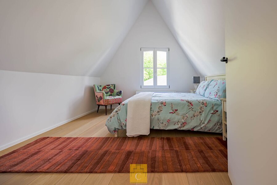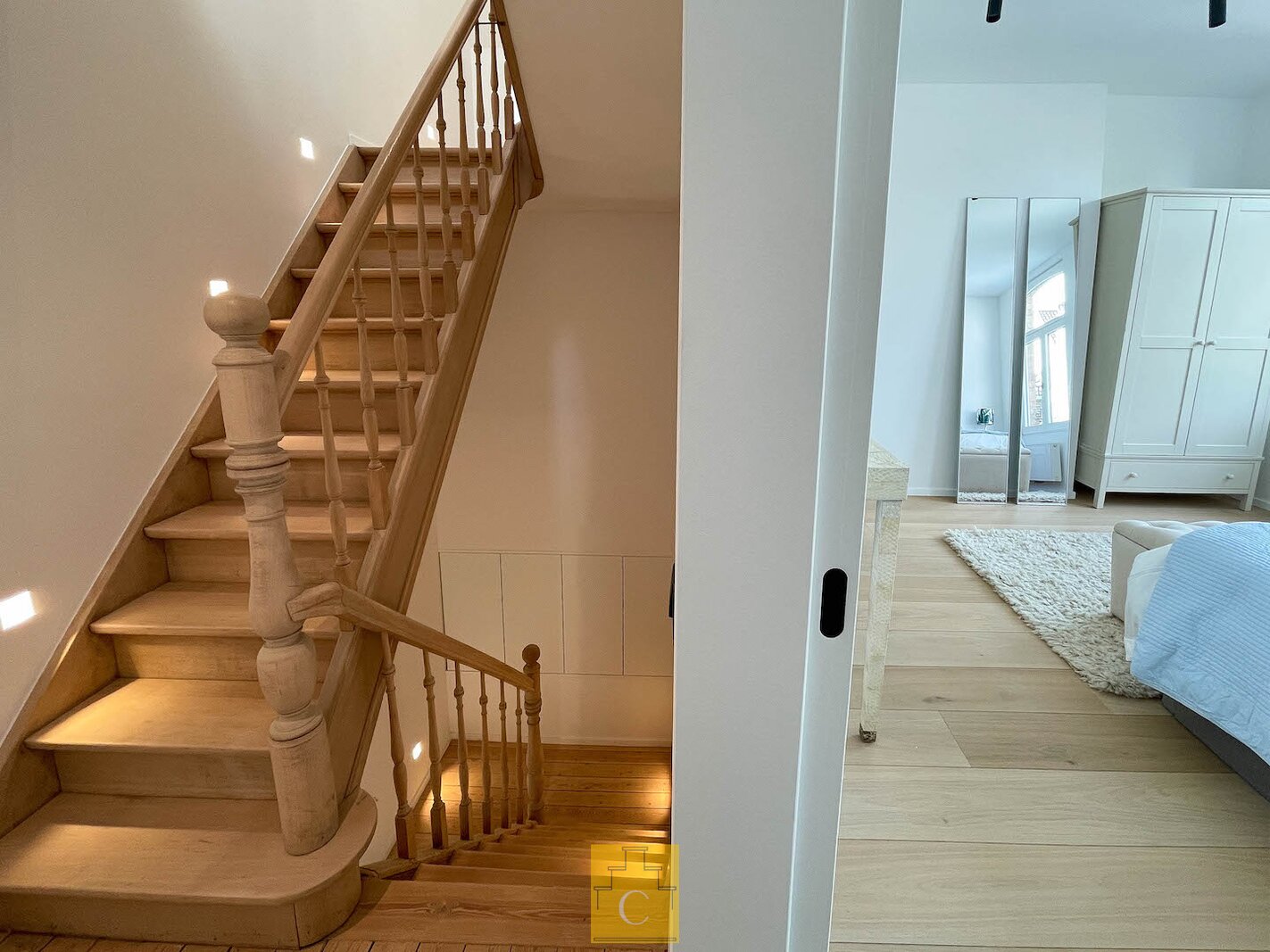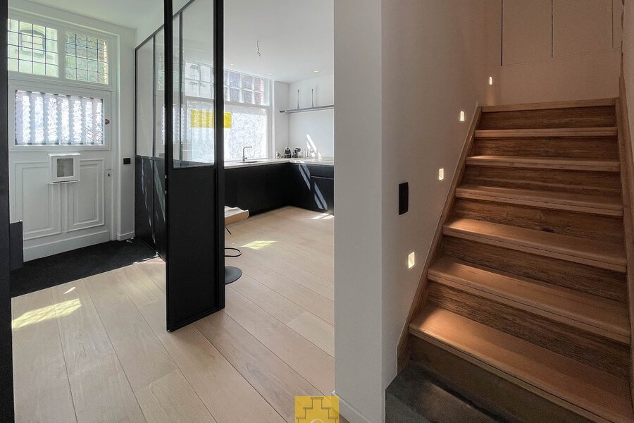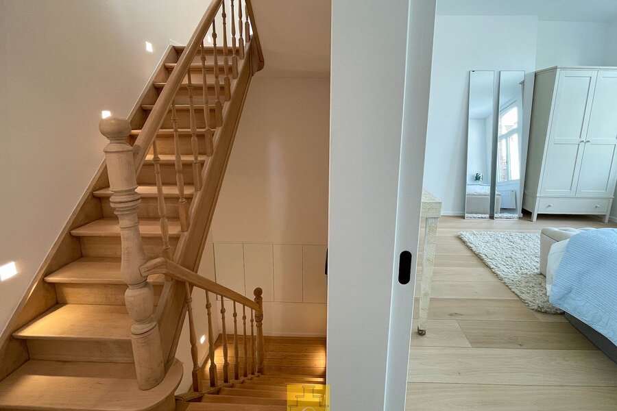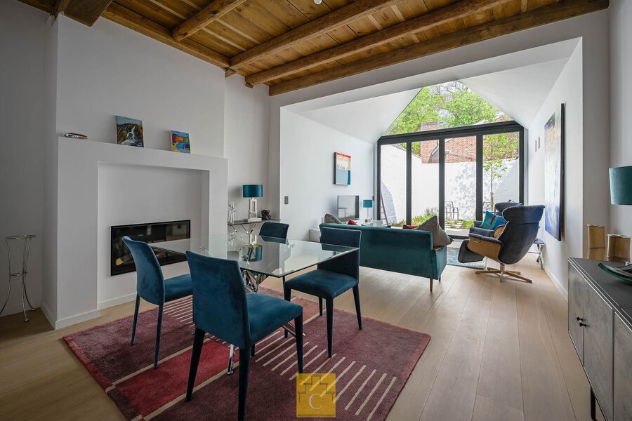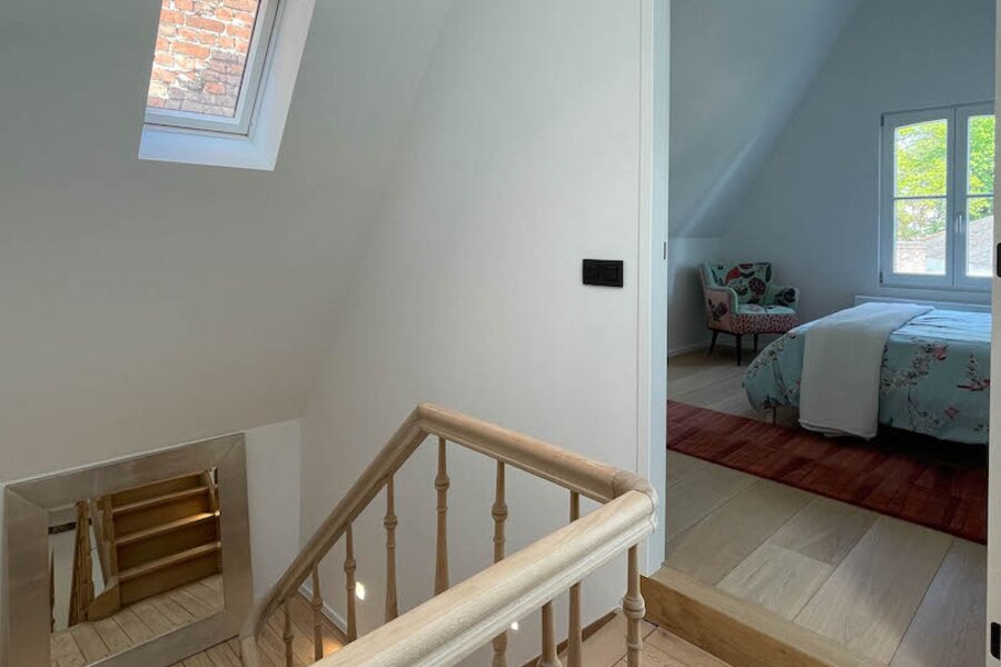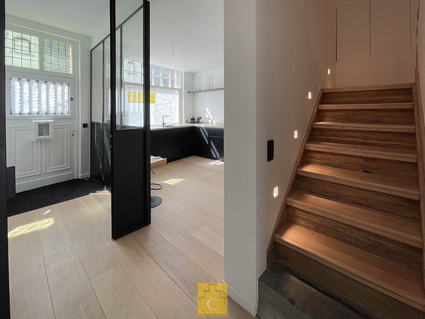 Een schilderachtige locatie in het beschermde stadsgezicht van Dijver, Arentshuis, Gruuthuse en Onze-Lieve-Vrouwkerk. De straat Groeninge vinden we reeds in 1200 terug in de annalen. Het is een gekasseide straat met kronkelend patroon, in het hart van de ‘Gouden Driehoek, weg van alle drukte. De totaalrenovatie van de trapgevelwoning die we hier uitzonderlijk te koop kunnen aanbieden heeft lange tijd geduurd. Het resultaat - een ontwerp van het gekende Brugse architectenbureau Dugardyn – mag dan ook ‘a piece or art’ genoemd worden, volledig in de lijn van het Brusk museumproject met feeëriek park dat in het verlengde van de woning wordt gerealiseerd. Een absolute topaanbieding dus. Bij de verbouwing van werd het pand volledig gestript en heropgebouwd met behoud van een aantal originele elementen/balken/roosteringen en een nieuwe uitbouw op het gelijkvloers met een opvallend zinken dak in bootvorm. Het pand heeft overal massieve parketvloeren, gezandstraalde trap en geniet van mooie plafondhoogtes met balken en een prima lichtinval. Gelijkvloers : inkom met wanden/deur in staal/glas, toilet met lavabo, trap, volledig ingerichte keuken aan de straatkant met oa inductiekookplaat met Borasysteem, frigo/diepvries, warme luchtoven, vaatwas Bosch, veel en handige kasten, diepe living met grote glaspartij achteraan (vouwramen die volledig open kunnen gezet worden zodat binnen- en buitengebeuren naadloos in elkaar overlopen, driehoekig vast raam bovenaan), schouw met gashaard (afstandsbediening), deur staal/glas naar berging/wijnkelder, terras en hard-landscaping tuin met gekaleide muren en verlichting, externe stroom- en watervoorziening. Tussenverdiep tussen 0 en 1 : kleine overloop met enkele ingemaakte kastjes. 1ste Verdieping : overloop, toilet met lavabo, berging/technische ruimte met oa cv condensketel gas, omvormer zonnepanelen, aansluiting voor wasmachine en droogkast, masterbedroom aan de tuinkant, badkamer aan de straatkant met diepe inloopdouche (marmer), breed lavabomeubel met 2 opstaande lavabo’s, spiegel met led-verlichting. 2de Verdieping : overloop, toilet met lavabo, 2 mooie slaapkamers (knap dakgebinte gedeeltelijk zichtbaar). CV gas. Enkele weetjes/eye)catchers : de uitbouw heeft een zelden gezien dak in de vorm van een bootromp met zinken buitenkant, isolatie en energie-efficiëntie volgens hoge normen, inclusief 6 zonnepanelen, quasi overal nieuwe ramen met driedubbele beglazing, nieuw dak, verbeterde isolatie, overal laagspanningsverlichting, akoestische isolatie van de tussenmuren, veiligheidstrapverlichting, overal bijpassende verlichtingsarmaturen, alarm- en verwarmingscontrolesystemen via internet. Niet gelegen in overstromingsgevoelig gebied. G-score: A, P-score: A