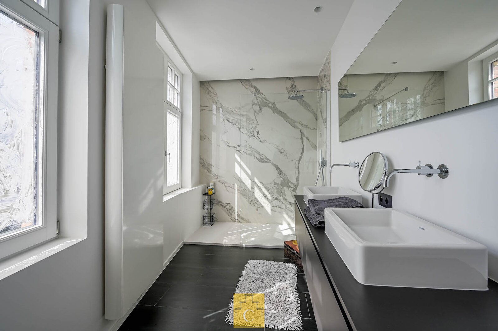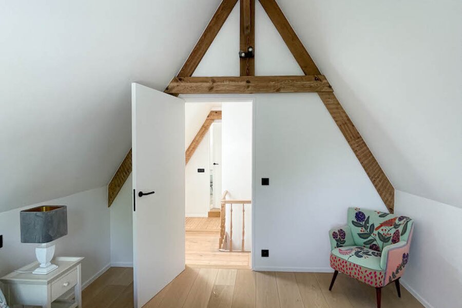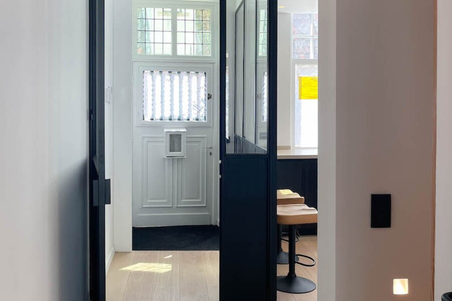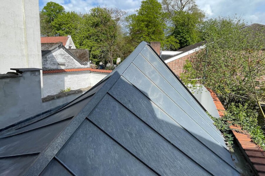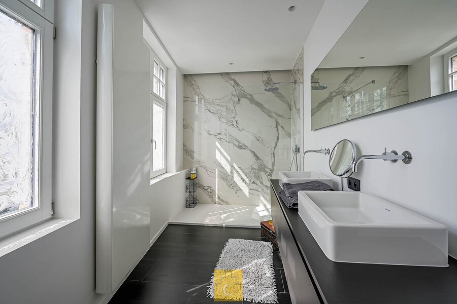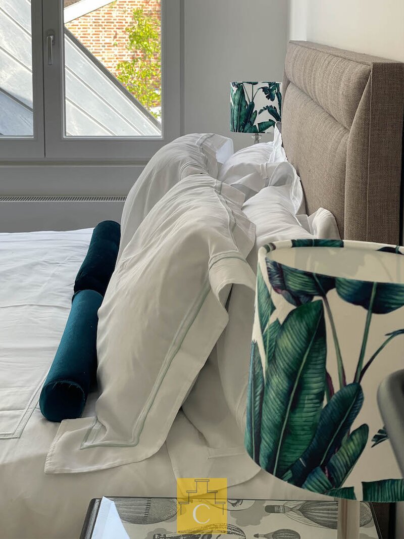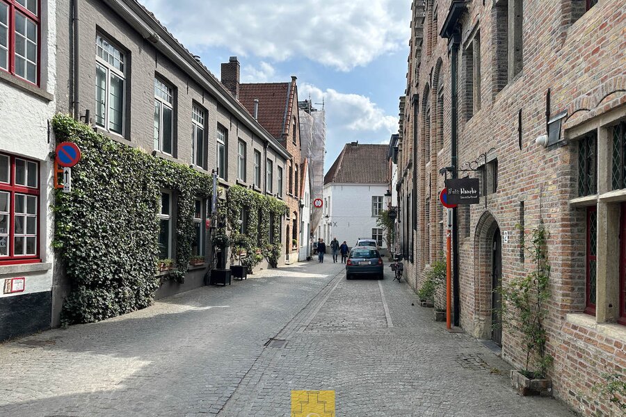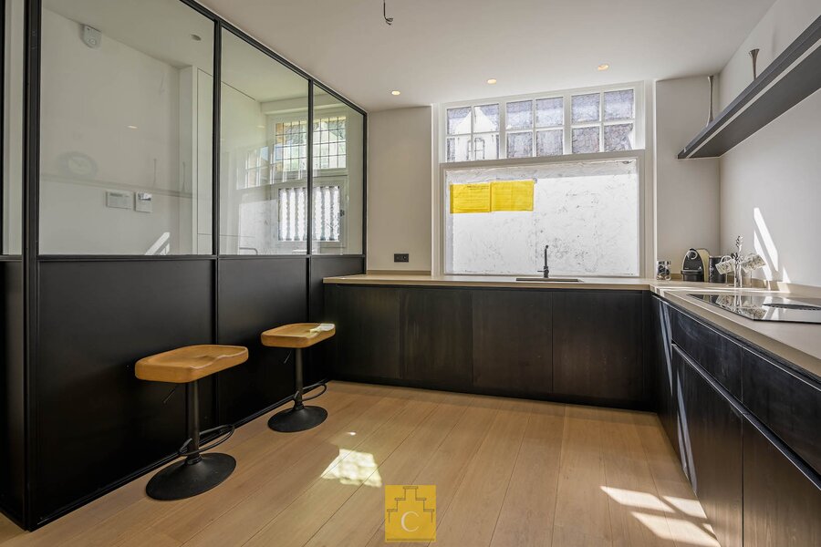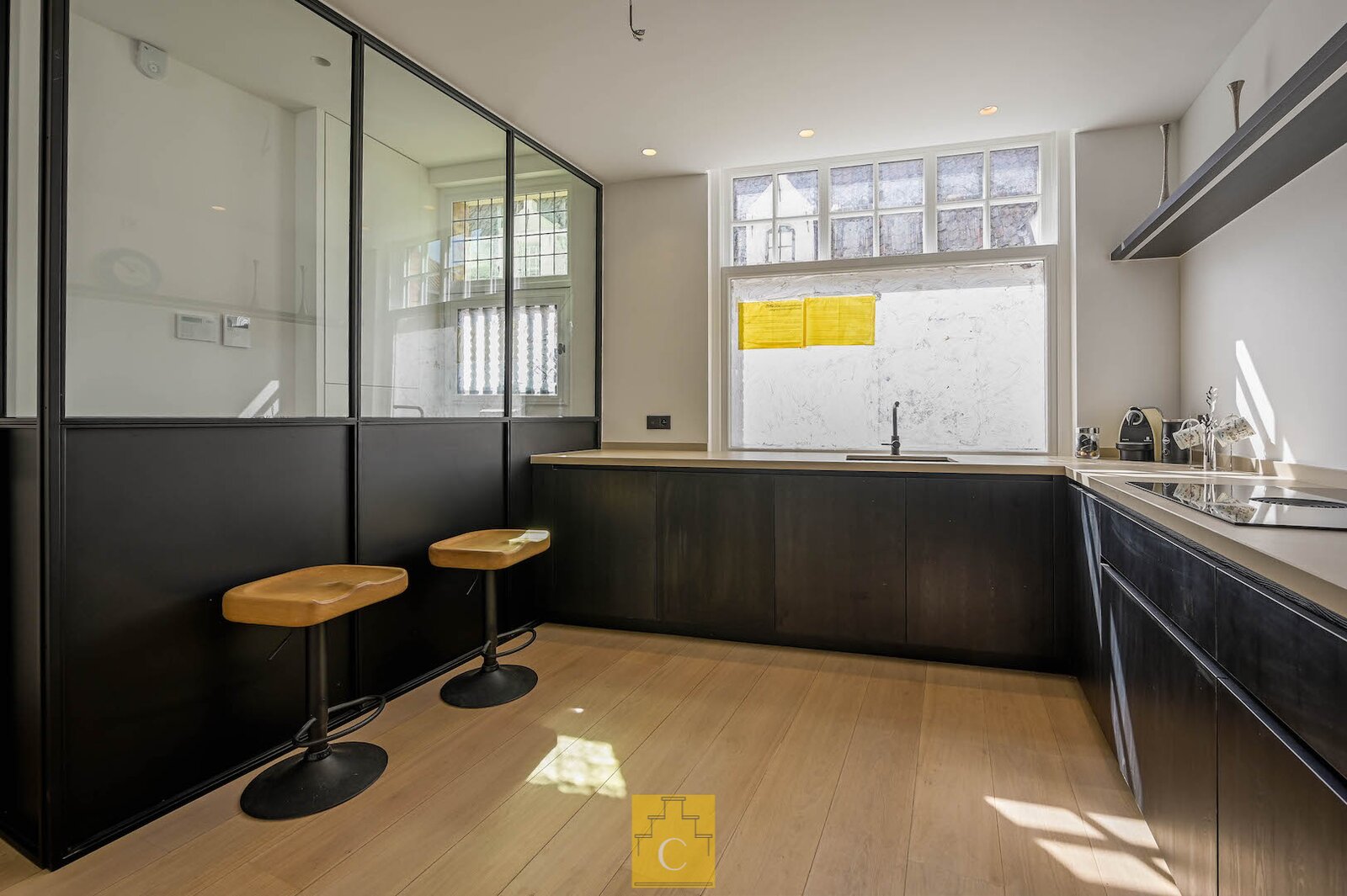 Een schilderachtige locatie in het beschermde stadsgezicht van Dijver, Arentshuis, Gruuthuse en Onze-Lieve-Vrouwkerk. De straat Groeninge vinden we reeds in 1200 terug in de annalen. Het is een gekasseide straat met kronkelend patroon, in het hart van de ‘Gouden Driehoek, weg van alle drukte. De totaalrenovatie van de trapgevelwoning die we hier uitzonderlijk te koop kunnen aanbieden heeft lange tijd geduurd. Het resultaat - een ontwerp van het gekende Brugse architectenbureau Dugardyn – mag dan ook ‘a piece or art’ genoemd worden, volledig in de lijn van het Brusk museumproject met feeëriek park dat in het verlengde van de woning wordt gerealiseerd. Een absolute topaanbieding dus. Bij de verbouwing van werd het pand volledig gestript en heropgebouwd met behoud van een aantal originele elementen/balken/roosteringen en een nieuwe uitbouw op het gelijkvloers met een opvallend zinken dak in bootvorm. Het pand heeft overal massieve parketvloeren, gezandstraalde trap en geniet van mooie plafondhoogtes met balken en een prima lichtinval. Gelijkvloers : inkom met wanden/deur in staal/glas, toilet met lavabo, trap, volledig ingerichte keuken aan de straatkant met oa inductiekookplaat met Borasysteem, frigo/diepvries, warme luchtoven, vaatwas Bosch, veel en handige kasten, diepe living met grote glaspartij achteraan (vouwramen die volledig open kunnen gezet worden zodat binnen- en buitengebeuren naadloos in elkaar overlopen, driehoekig vast raam bovenaan), schouw met gashaard (afstandsbediening), deur staal/glas naar berging/wijnkelder, terras en hard-landscaping tuin met gekaleide muren en verlichting, externe stroom- en watervoorziening. Tussenverdiep tussen 0 en 1 : kleine overloop met enkele ingemaakte kastjes. 1ste Verdieping : overloop, toilet met lavabo, berging/technische ruimte met oa cv condensketel gas, omvormer zonnepanelen, aansluiting voor wasmachine en droogkast, masterbedroom aan de tuinkant, badkamer aan de straatkant met diepe inloopdouche (marmer), breed lavabomeubel met 2 opstaande lavabo’s, spiegel met led-verlichting. 2de Verdieping : overloop, toilet met lavabo, 2 mooie slaapkamers (knap dakgebinte gedeeltelijk zichtbaar). CV gas. Enkele weetjes/eye)catchers : de uitbouw heeft een zelden gezien dak in de vorm van een bootromp met zinken buitenkant, isolatie en energie-efficiëntie volgens hoge normen, inclusief 6 zonnepanelen, quasi overal nieuwe ramen met driedubbele beglazing, nieuw dak, verbeterde isolatie, overal laagspanningsverlichting, akoestische isolatie van de tussenmuren, veiligheidstrapverlichting, overal bijpassende verlichtingsarmaturen, alarm- en verwarmingscontrolesystemen via internet. Niet gelegen in overstromingsgevoelig gebied. G-score: A, P-score: A