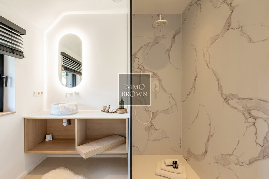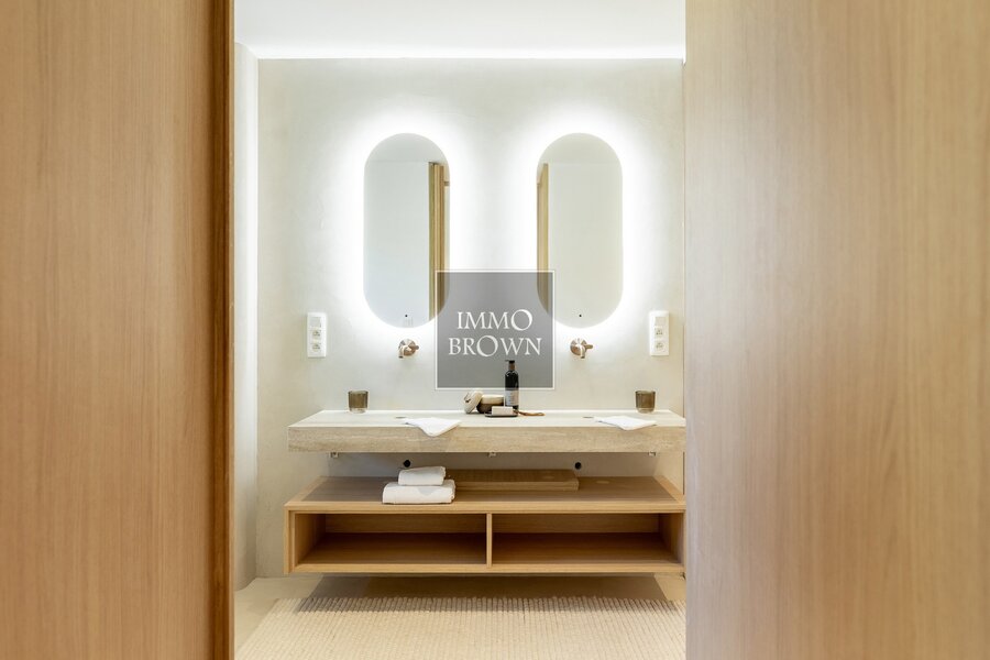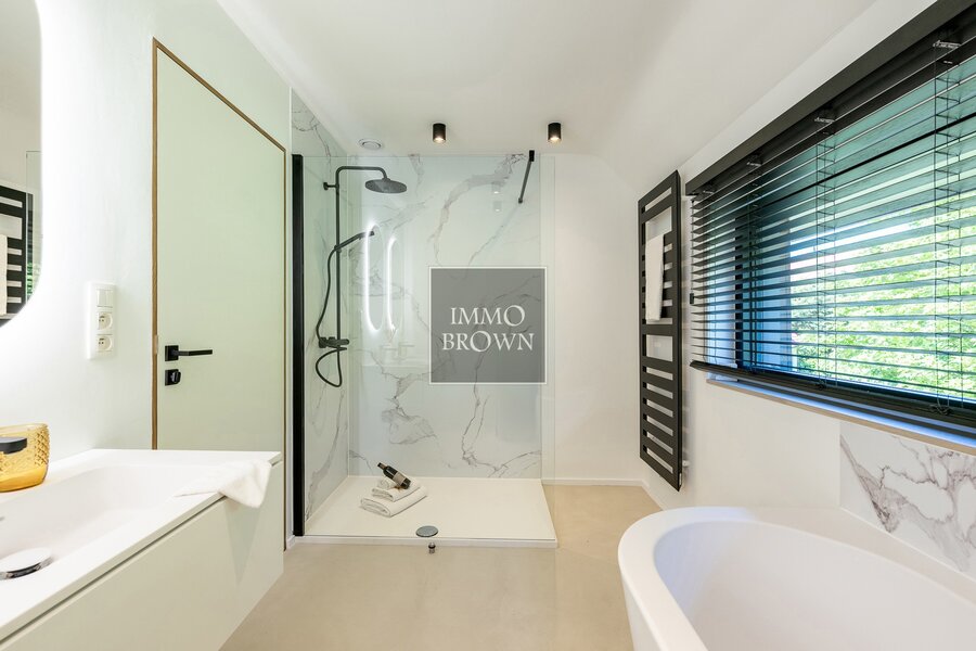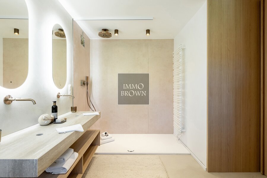 On the first floor, you’ll find a generous master suite with dressing room and a luxurious bathroom, as well as a second master suite with built-in wardrobes and a private shower room. Two additional double bedrooms with fitted wardrobes, a large bathroom with bath and shower, and a separate toilet complete the floor. All bedrooms are equipped with air conditioning, ensuring year-round comfort.