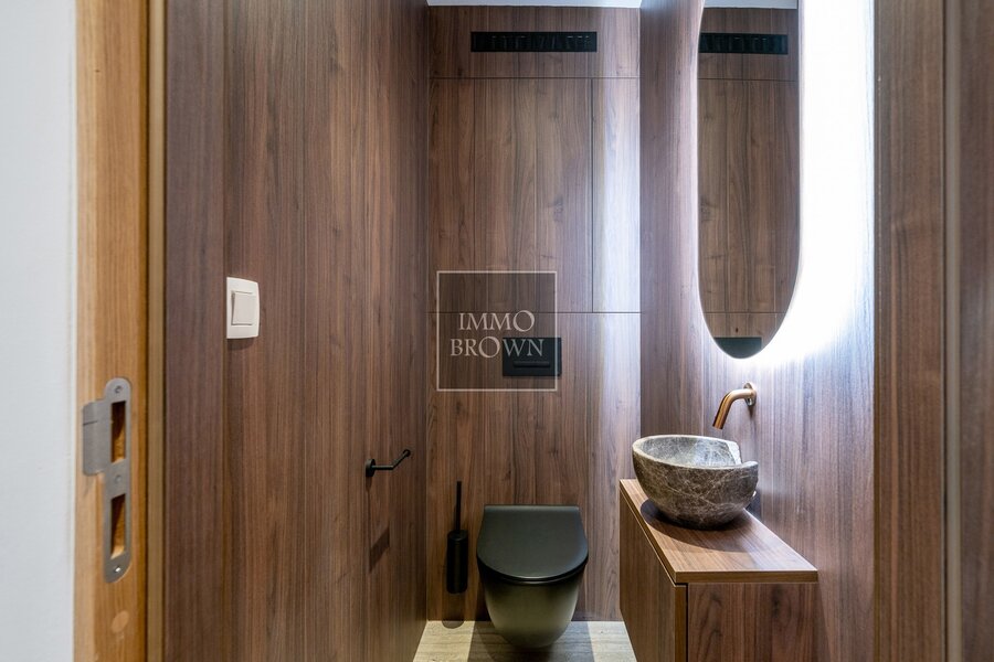 The ground floor features a spacious, light-filled living area with an open kitchen opening directly onto two terraces – ideal for those who love indoor-outdoor living. A cozy TV corner and a practical utility room, seamlessly integrated into the layout, complete this level.