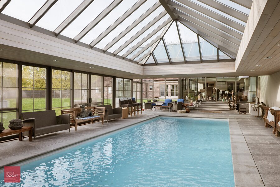 De villa omvat een inkomhal, ruime leefruimte, keuken, wasplaats, vier slaapkamers, twee badkamers, kelder, zolder en dubbele garage. Daarnaast is er een orangerie met barbecue en een binnenzwembad.