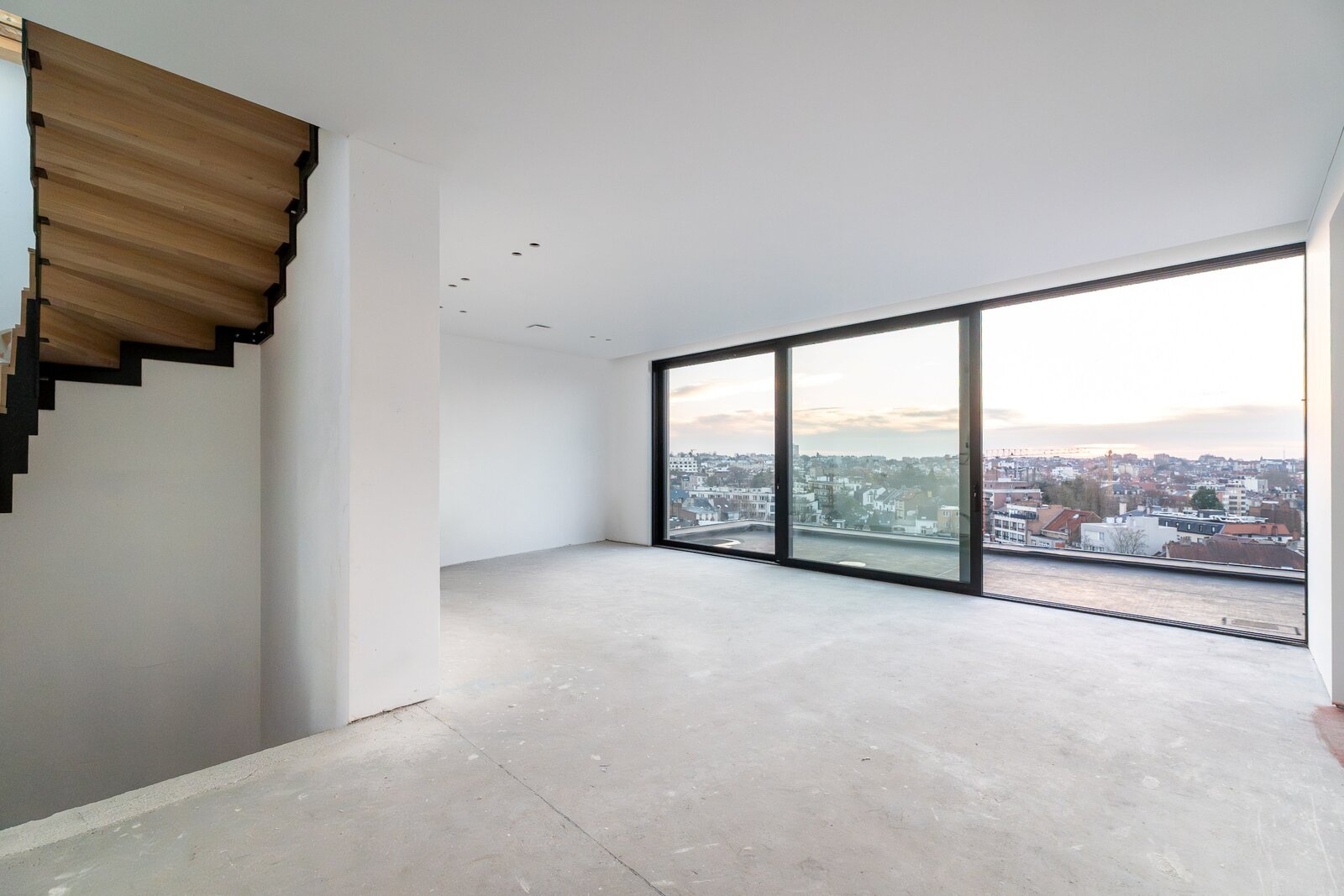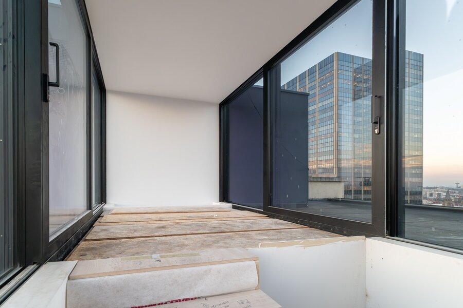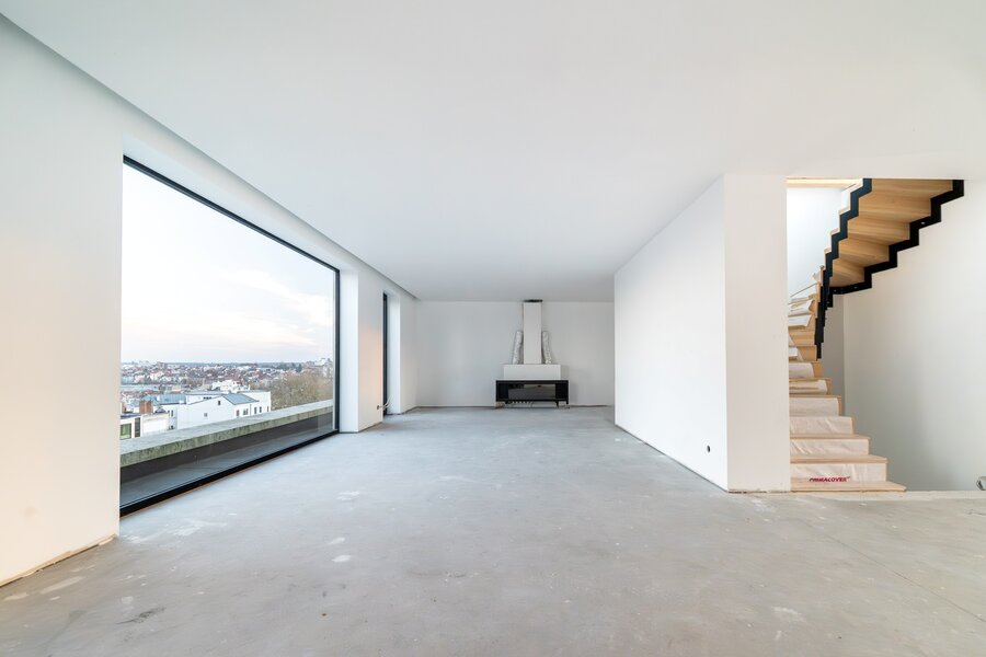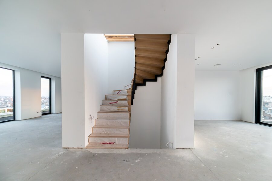 Op het bovenste niveau bevindt zich een ruime woon- en eetkamer met gashaard en grote panoramische ramen die een adembenemend uitzicht over Brussel bieden. Een ruimte van 35 m² is voorzien voor de keuken en geeft toegang tot een terras van 20 m², perfect georiënteerd op het zuidwesten.