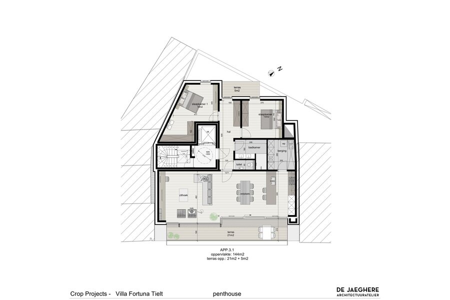 - 3° Verdiep (3.1): 144 m² + 26 m² terrassen – 2 slpk – 1 bdk – berging