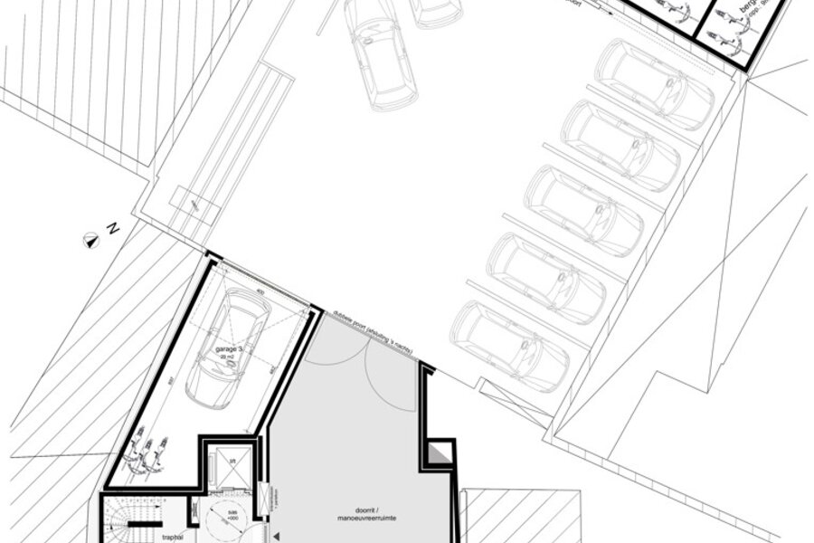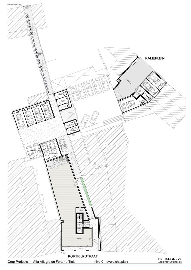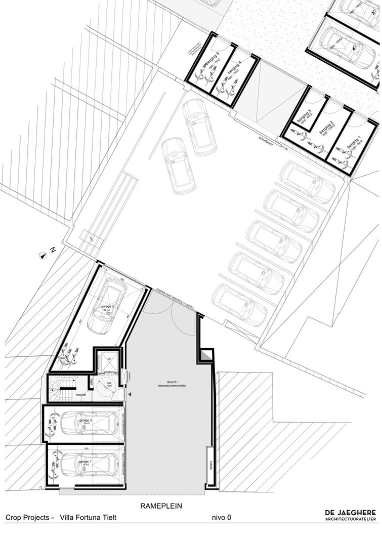 Achteraan het terrein zijn private garages voorzien, bereikbaar via het Rameplein, evenals fietsenbergingen met een toegang langs de Nieuwstraat.