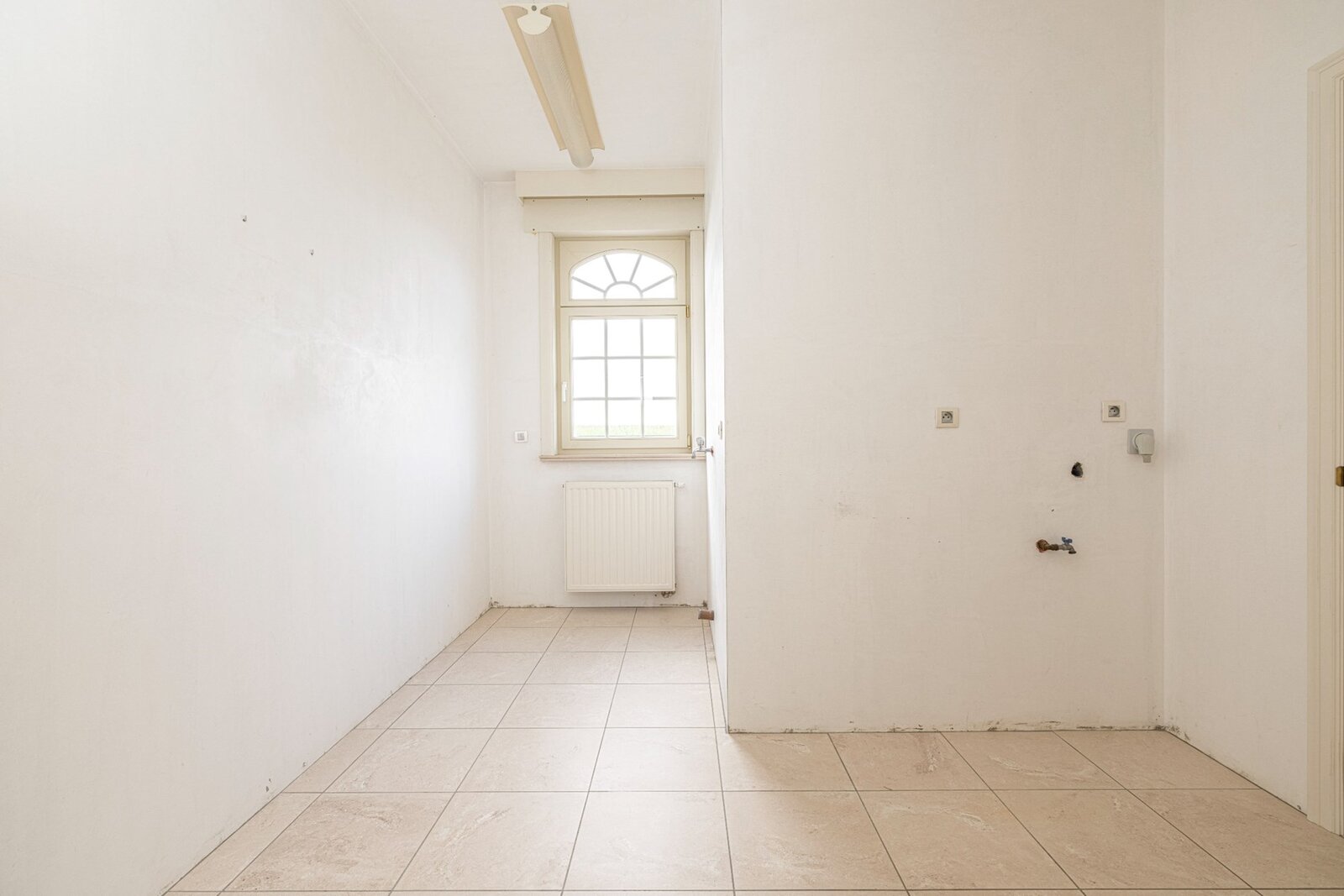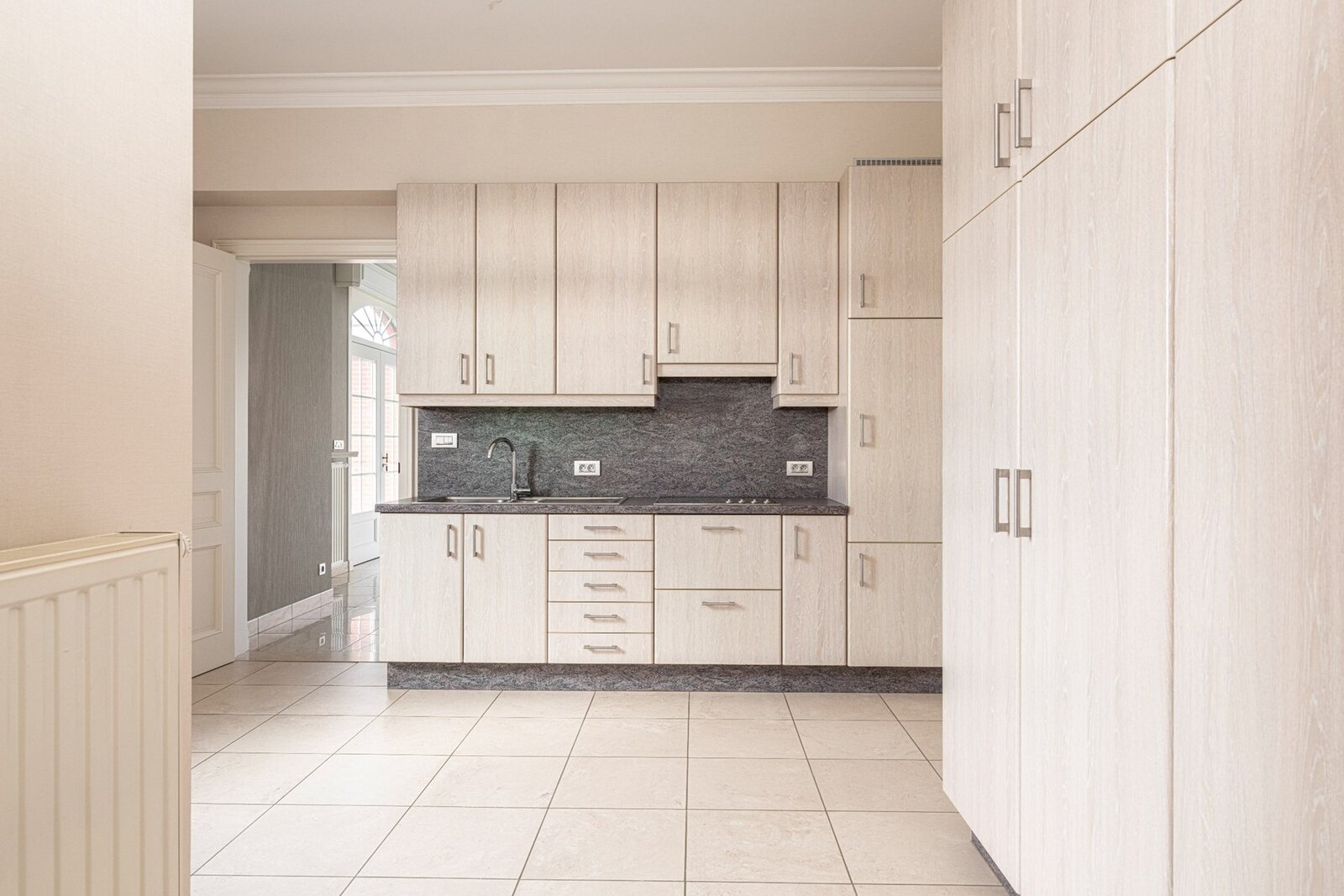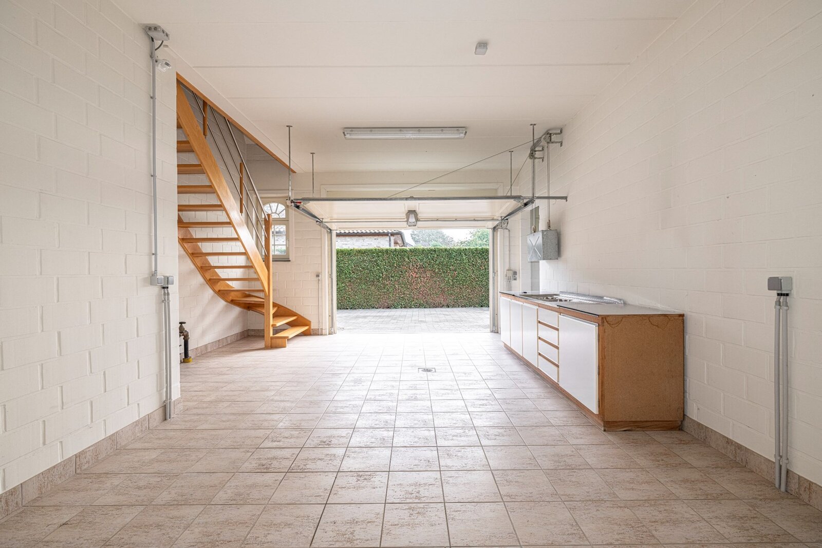Achterliggend is er de landelijke-stijlvolle ongebruikte en compleet uitgeruste keuken met eetzone en zicht op de tuin. De lichtrijke erker maakt deze ruimte compleet. Aansluitend is er de toegang tot de bijkeuken/bergruimte/wasplaats met mogelijkheid tot doucheruimte / technische berging en de dubbele inpandige garage met veel bergruimte en vlotte toegang tot de tuin. In de garage is er een trap die ons naar de linker stockage zolder brengt.