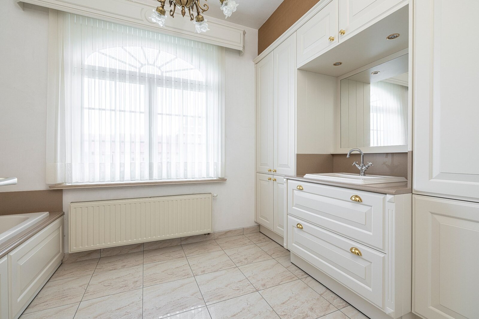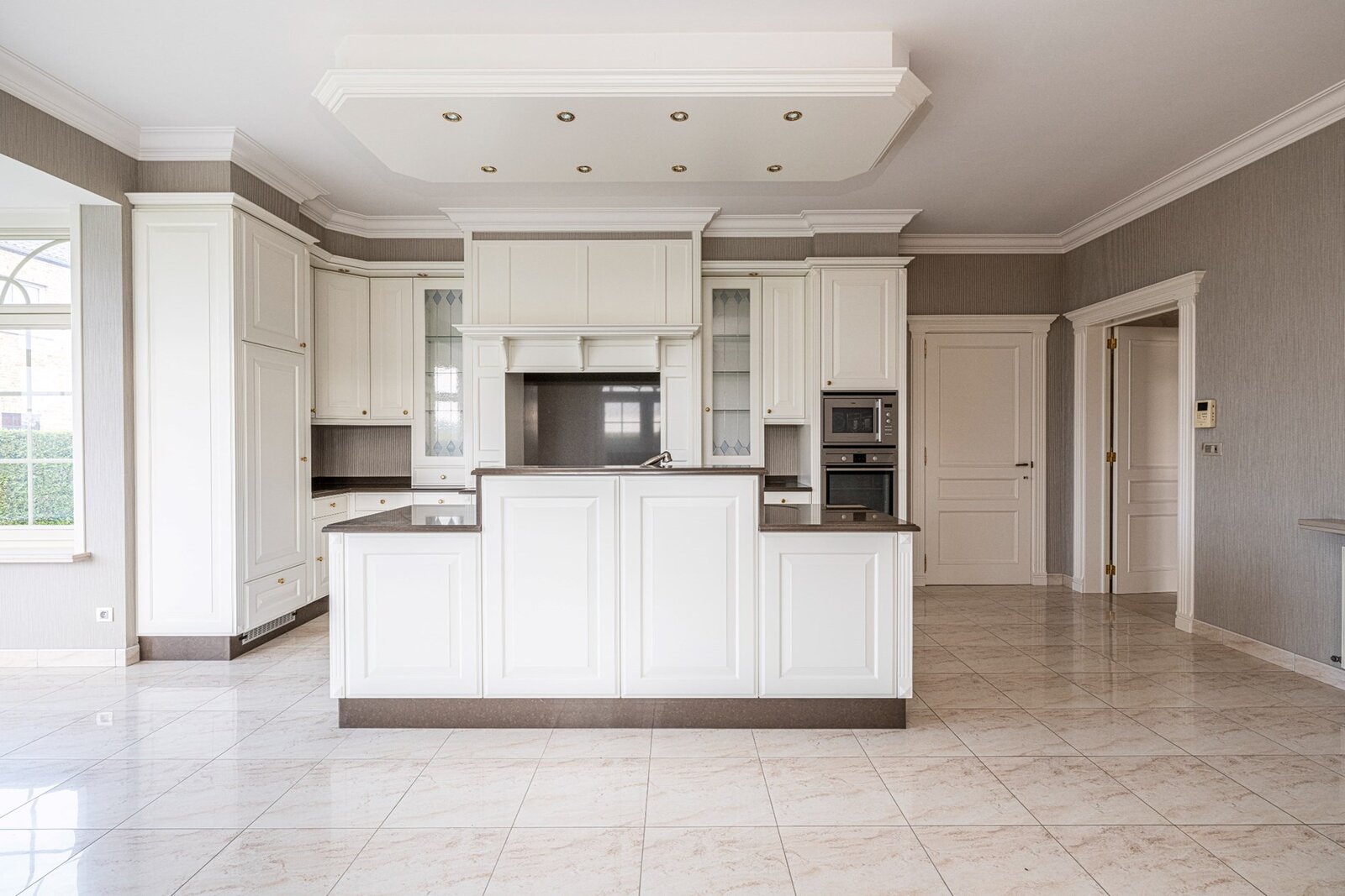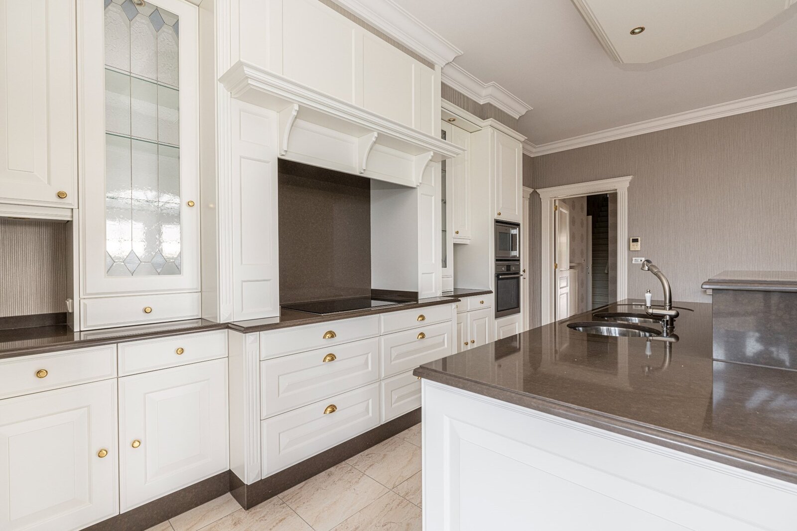 Achterliggend is er de landelijke-stijlvolle ongebruikte en compleet uitgeruste keuken met eetzone en zicht op de tuin. De lichtrijke erker maakt deze ruimte compleet. Aansluitend is er de toegang tot de bijkeuken/bergruimte/wasplaats met mogelijkheid tot doucheruimte / technische berging en de dubbele inpandige garage met veel bergruimte en vlotte toegang tot de tuin. In de garage is er een trap die ons naar de linker stockage zolder brengt.