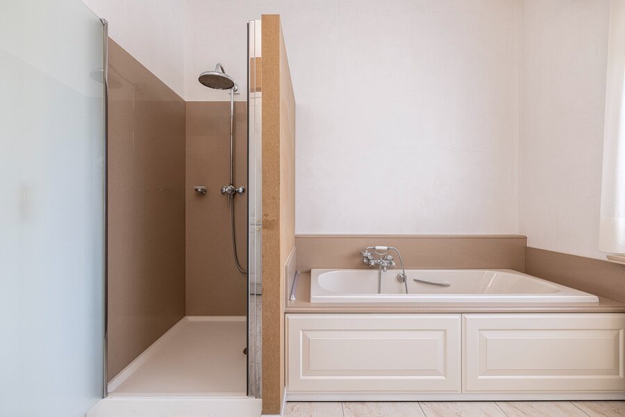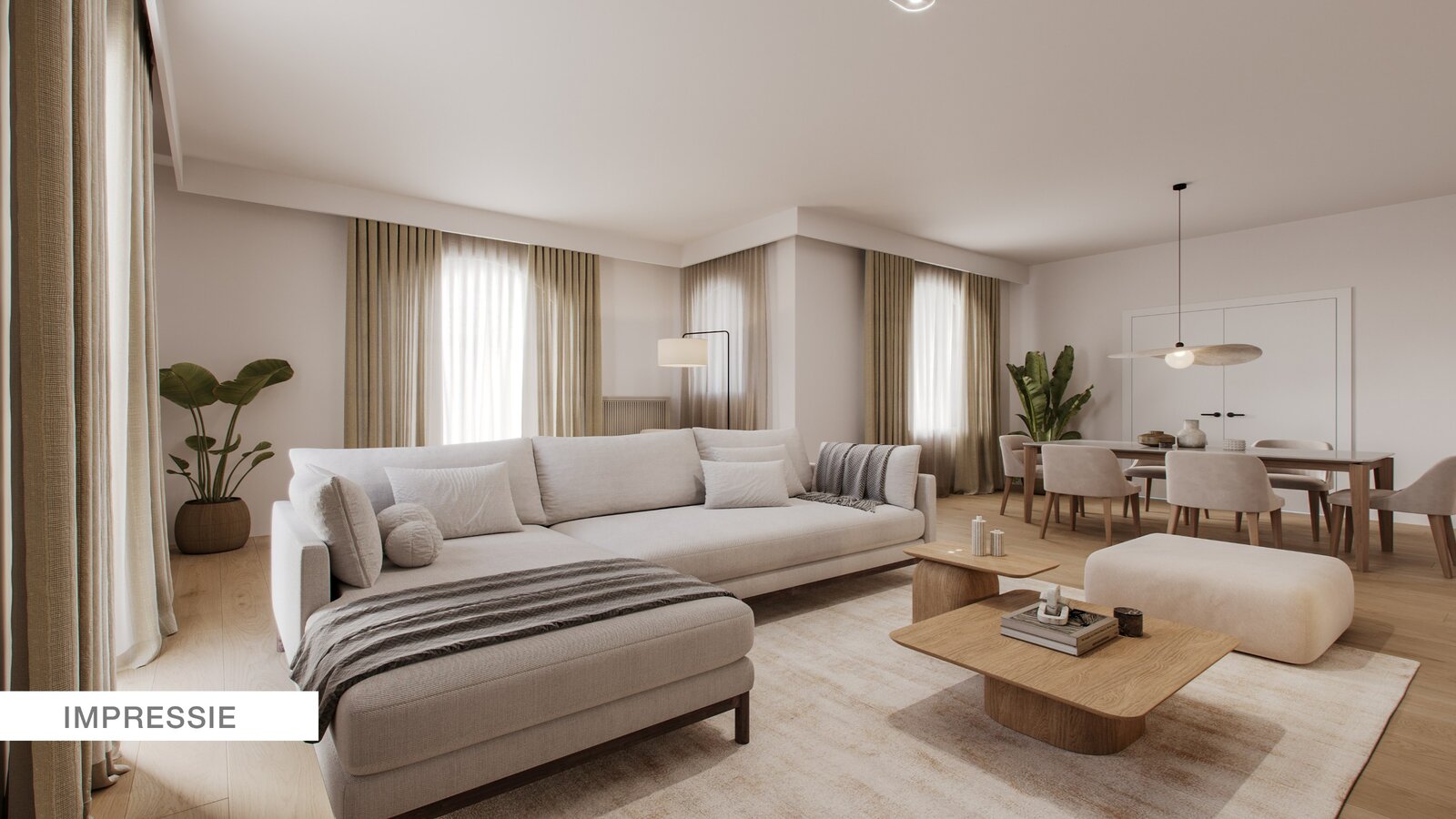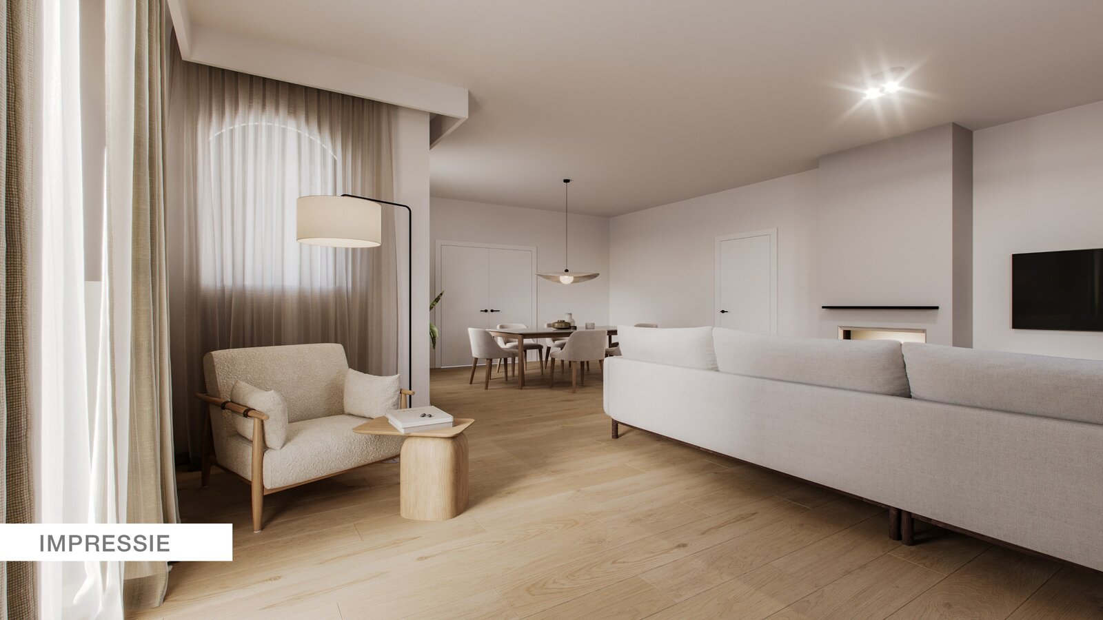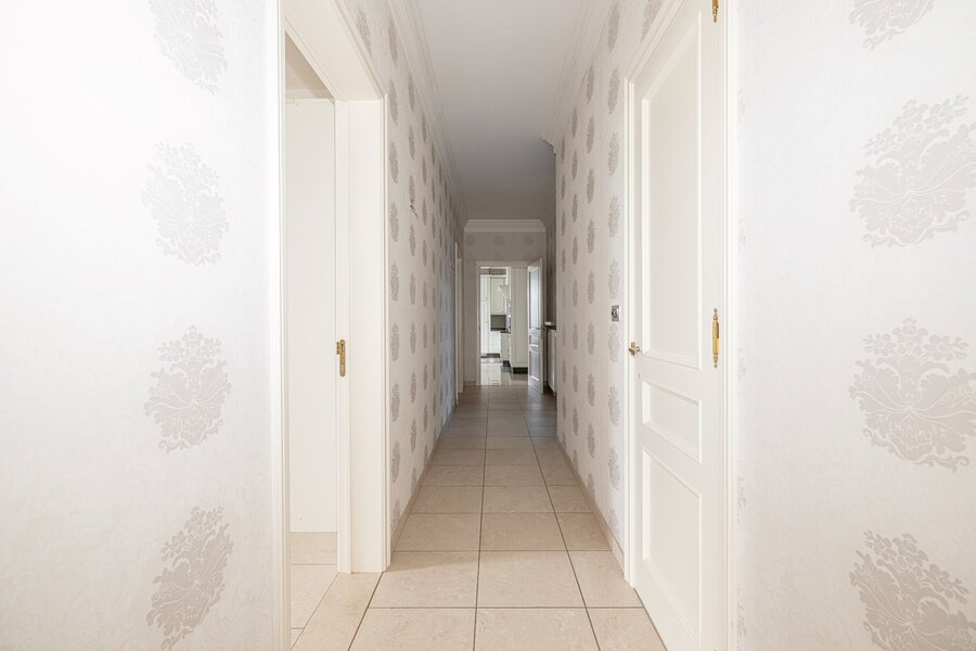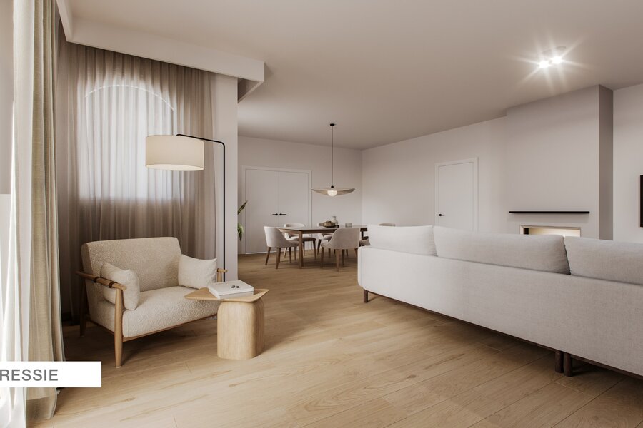 De ruime lichtrijke inkomhall, geeft ons toegang tot het toilet en de linker vleugel. Hier vinden we een complete uitgeruste badkamer met bad/ douche en wastafel op maat. Achterliggend is er de king size gelijkvloerse slaapkamer van 27m2. Aan de rechterzijde van de inkomzone is er de uiterst ruime leefruimte van 66m2 met de voorzieningen voor het plaatsen van een schouwmantel/haard.