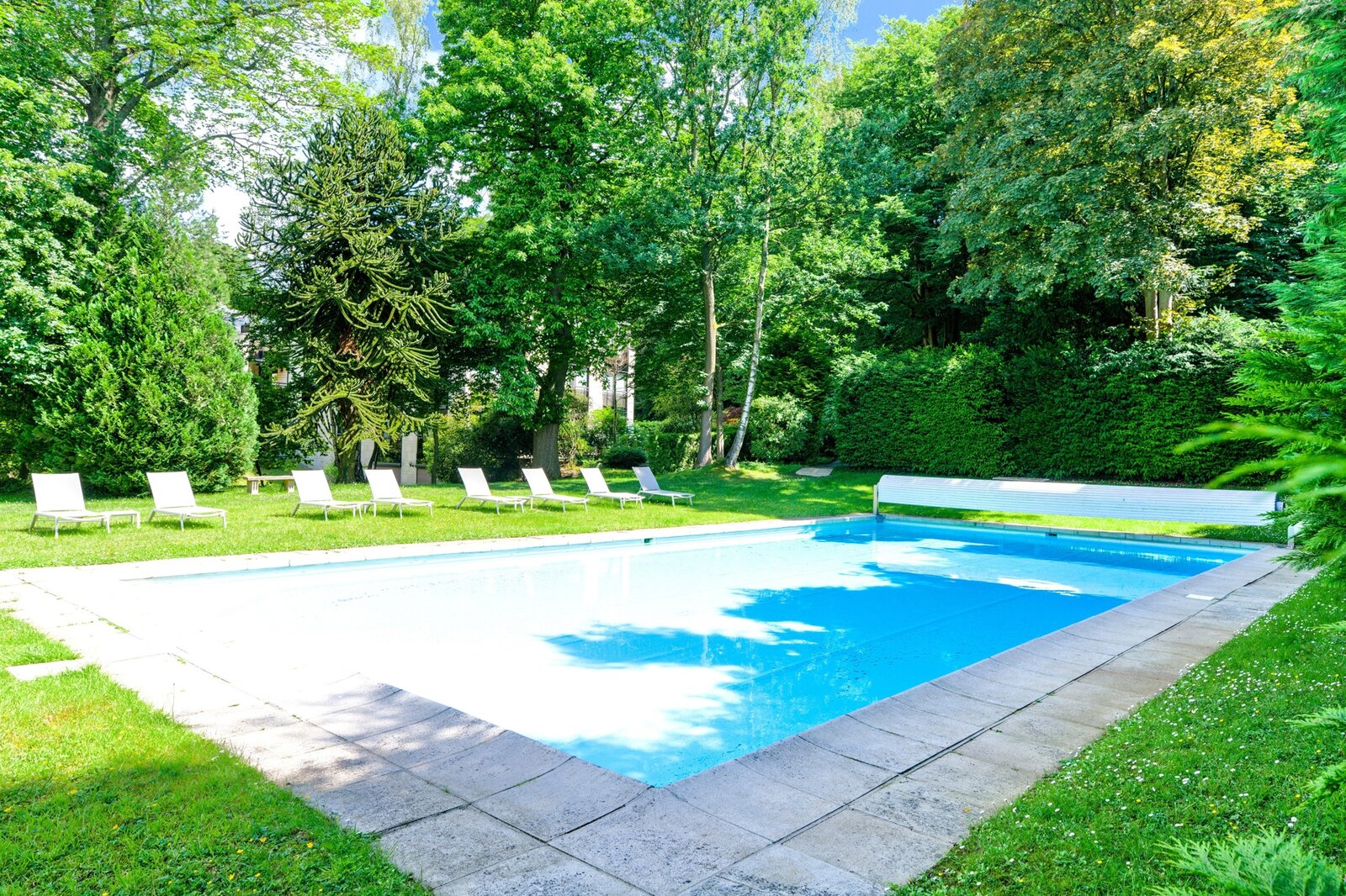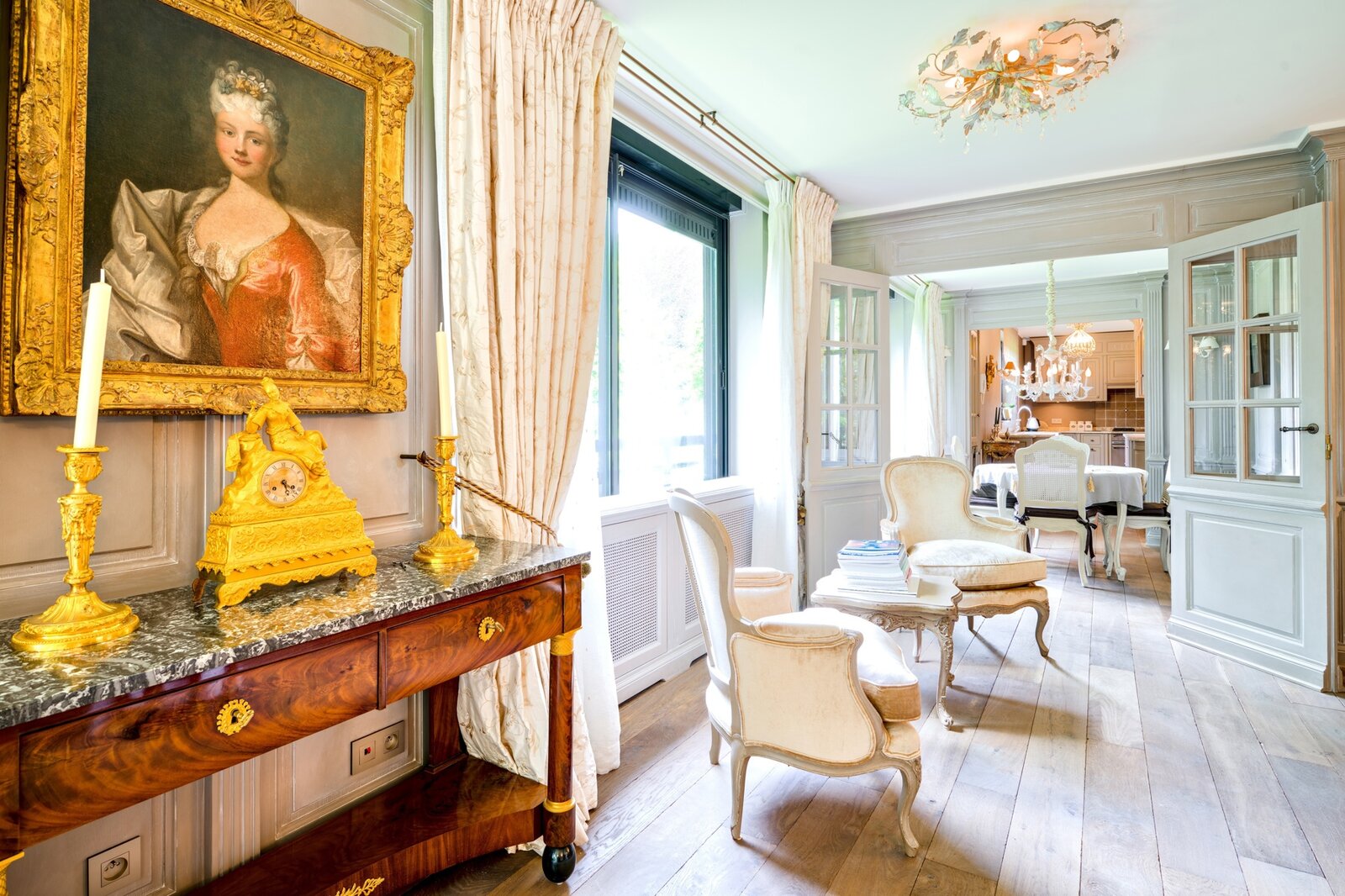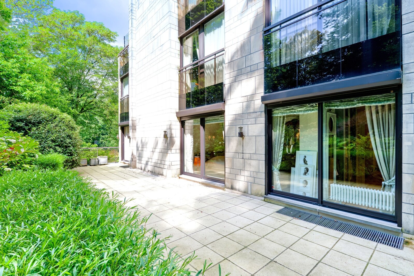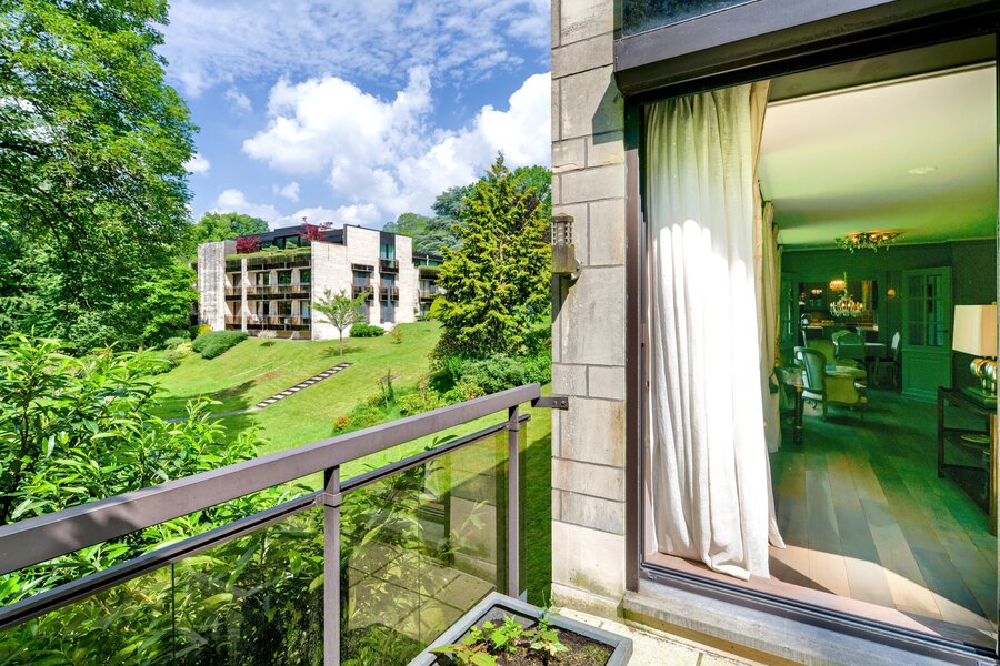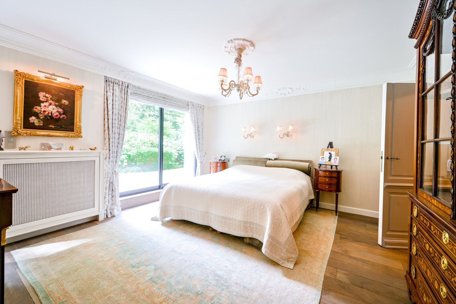 Uccle, close to forêt de Soignes, 10' walk from Fort jaco, in a park of 1,6 ha with outdoor swimming pool, lovely duplex of ± 260 sqm (excluding terraces), facing south. This duplex is composed of a large living room of ± 90 sqm with open fire, a beautiful super equipped kitchen , 3 large bedrooms with dressings, including an independent area for an "au pair", 1 office, 2 bathrooms, 2 shower rooms, laundry room, individual gas boiler, 2 garages. Excellent condition! PEB D+.