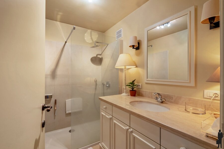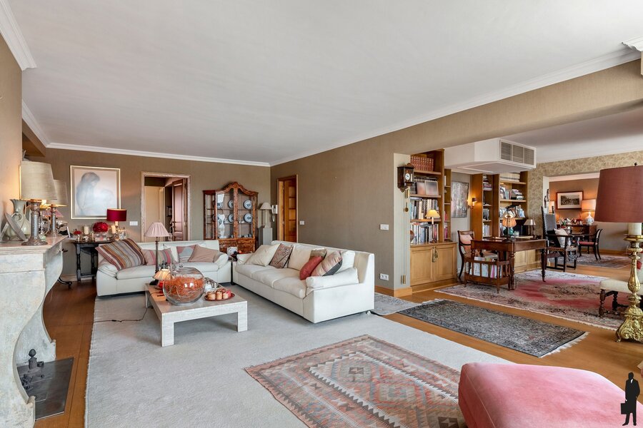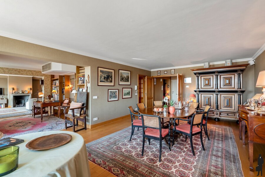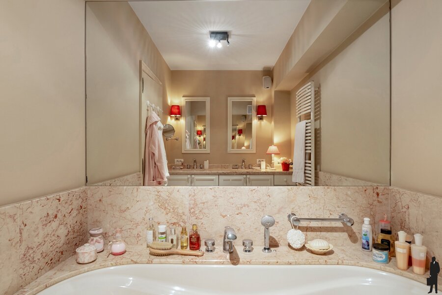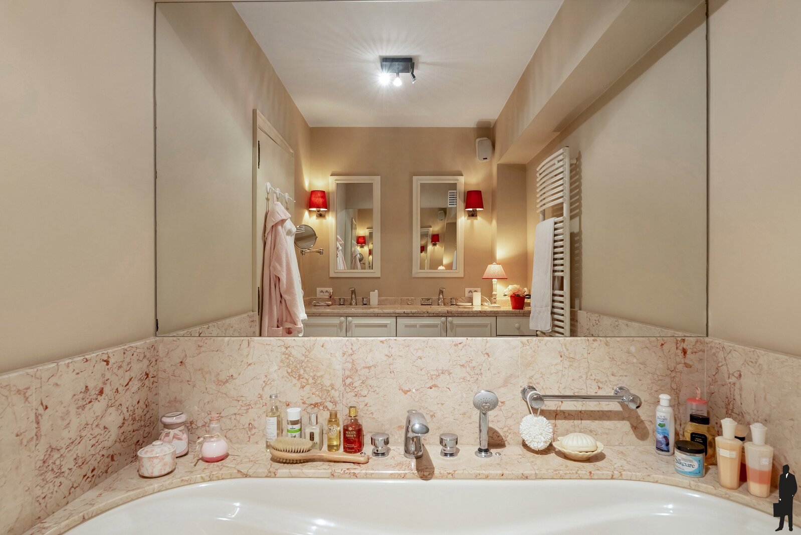 De derde slaapkamer, de masterbedroom, is bereikbaar via de leefruimte en ligt eveneens aan de achterzijde van het appartement. Deze kamer biedt ook toegang tot het terras en grenst aan een ruime dressing, die eventueel ook kan dienen als extra slaapkamer of bureau. In dit deel van het appartement bevinden zich bovendien een tweede apart toilet en een tweede badkamer met ligbad en wastafel.