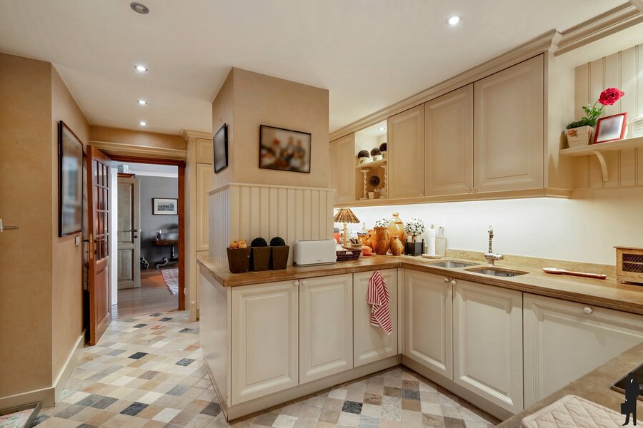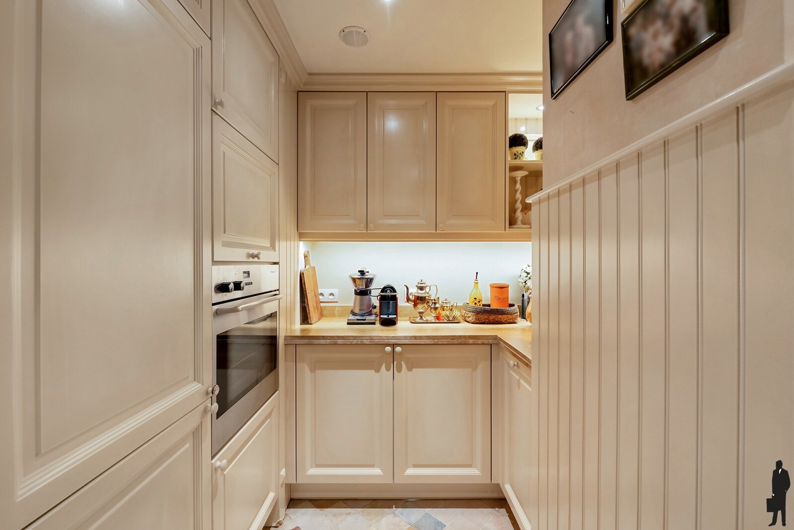 De keuken is uitgerust met kwalitatieve Miele-toestellen: een keramisch kookvuur, oven, microgolfoven, koelkast, vriezer, vaatwasser en een dubbele spoelbak. Aansluitend is er een ruime en praktische voorraadberging.