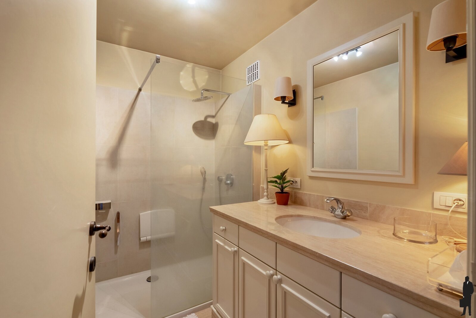 Het nachtgedeelte is opgedeeld in twee delen. Via de inkomhal bereikt u twee slaapkamers, waarvan één toegang geeft tot het terras aan de achterzijde. In dit gedeelte bevinden zich ook de eerste badkamer met inloopdouche en wastafel, evenals de wasplaats/technische ruimte.