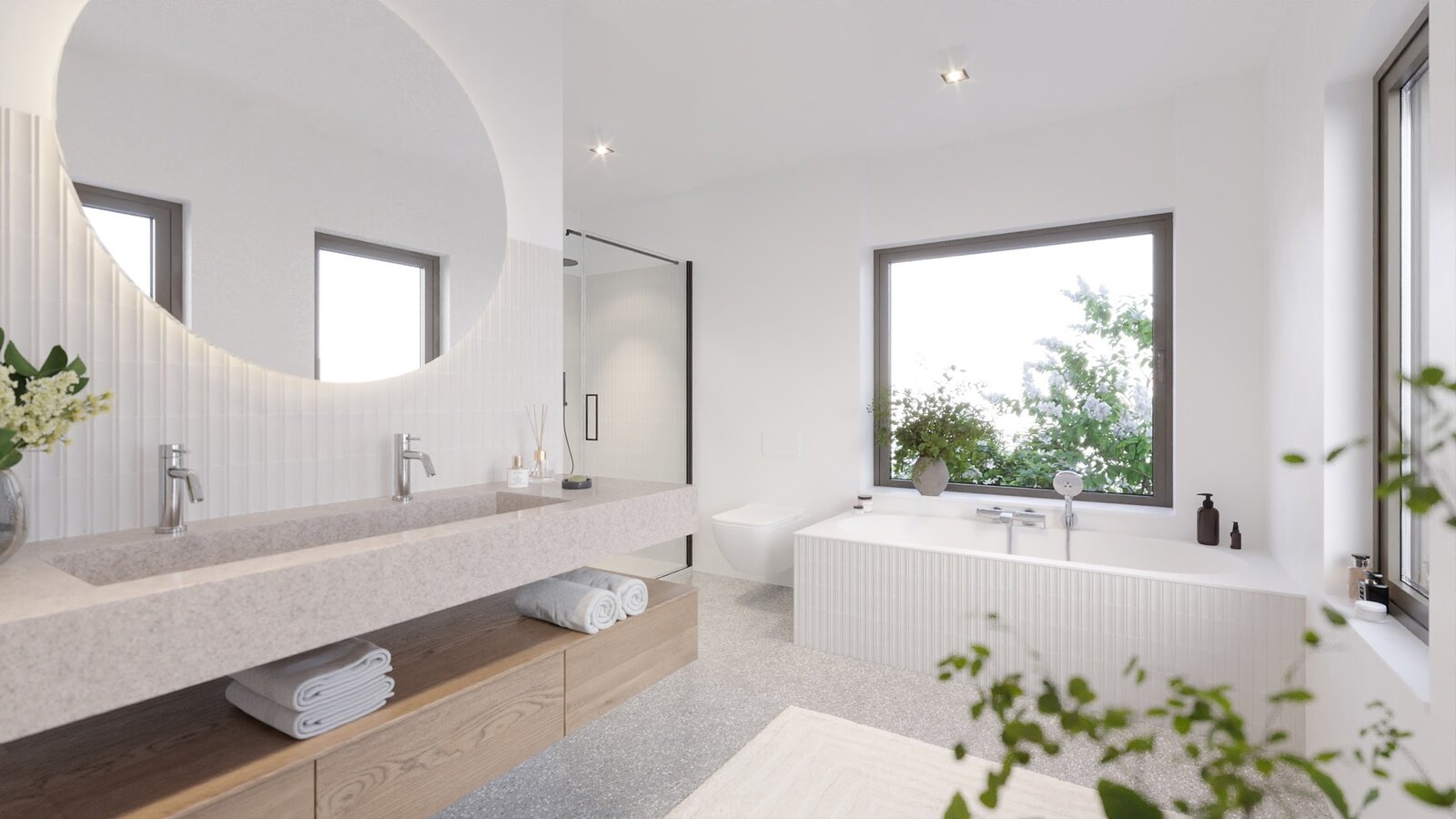 - En-suite bathroom (double washbasin, bathtub, shower, toilet)