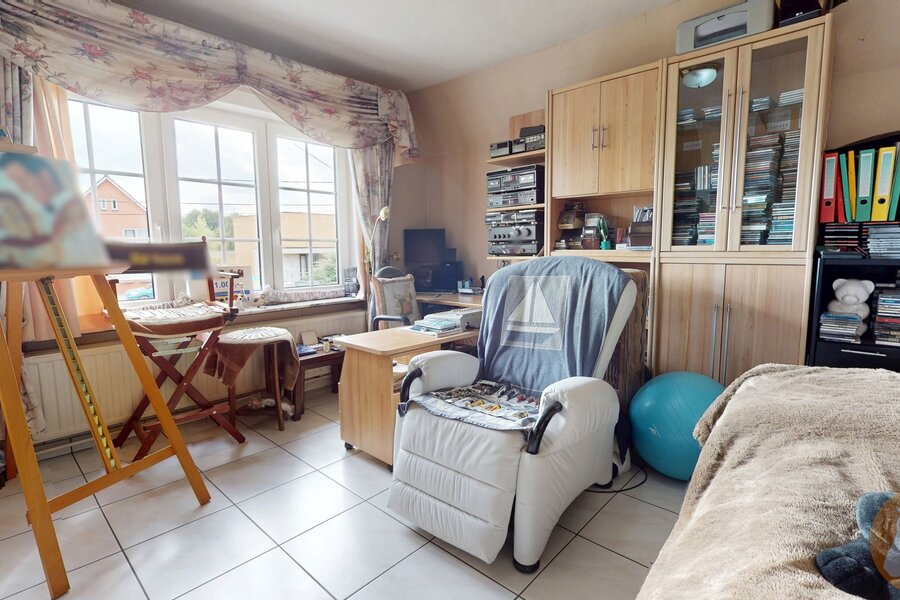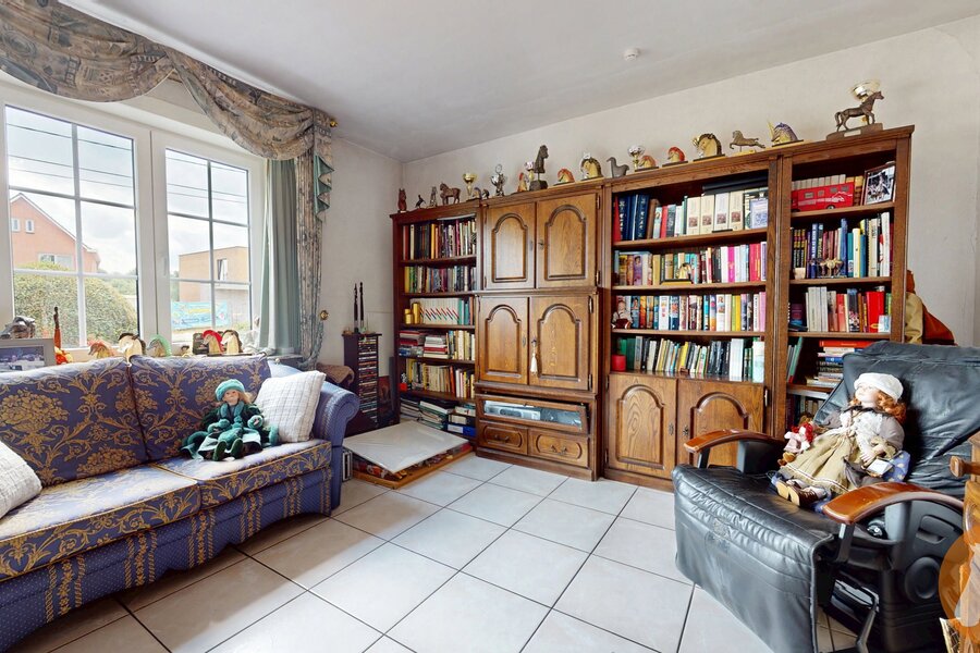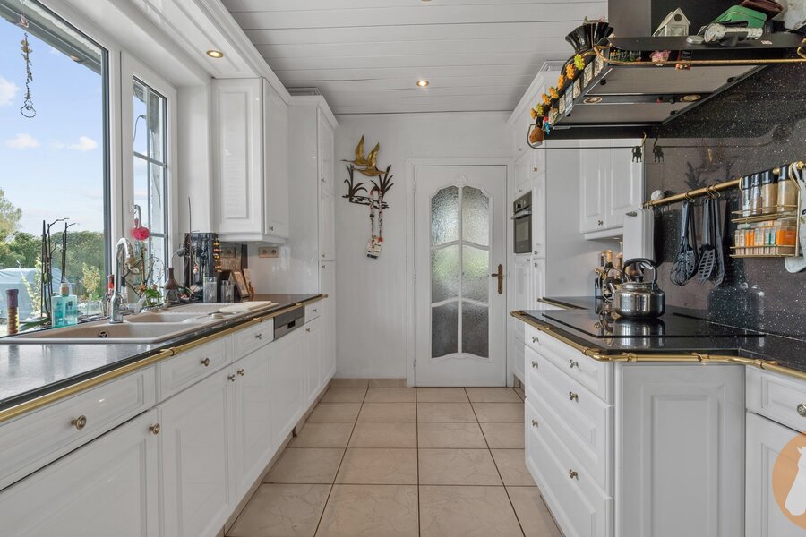 De statige villa verwelkomt u met een ruime inkomhal. Op het gelijkvloers vindt u een grote leefruimte met gashaard, een bureel of slaapkamer, een apart toilet, een eetplaats en een volledig ingerichte keuken met zicht op de tuin.