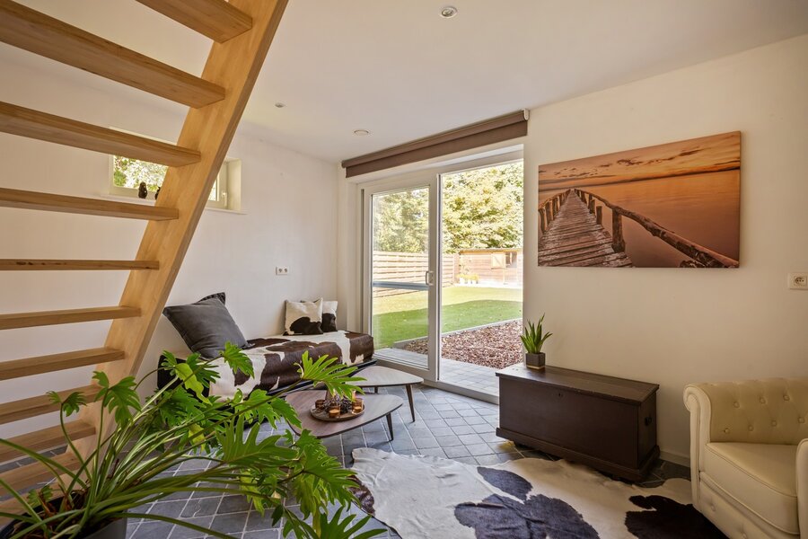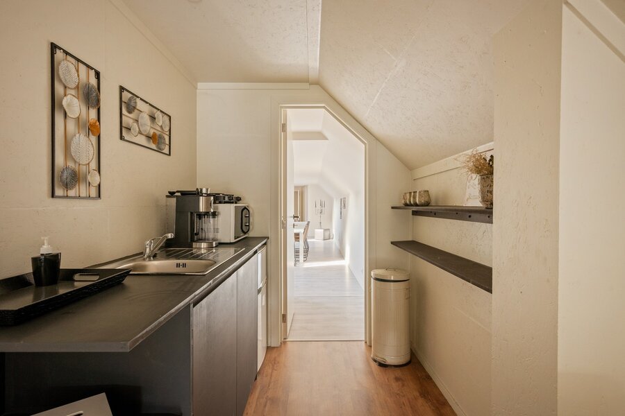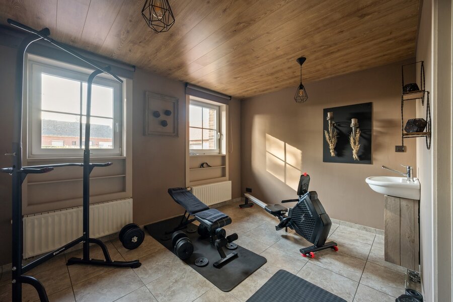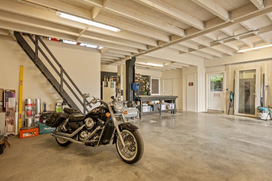 Op de verdieping is er ruimte ingericht met mancave en een bureau, een vergaderruimte en een aansluitende gastenkamer. Als kers op de taart is nog een ruime loods van 111m² met een extra verdieping (rond de 85m²) voor stockage, met zonnepanelen en een aansluitende carport voor bestelwagen of mobilhome. De vergunning voor de volledige regularisatie van aanbouw, bijgebouwen en verharding is bekomen en definitief!