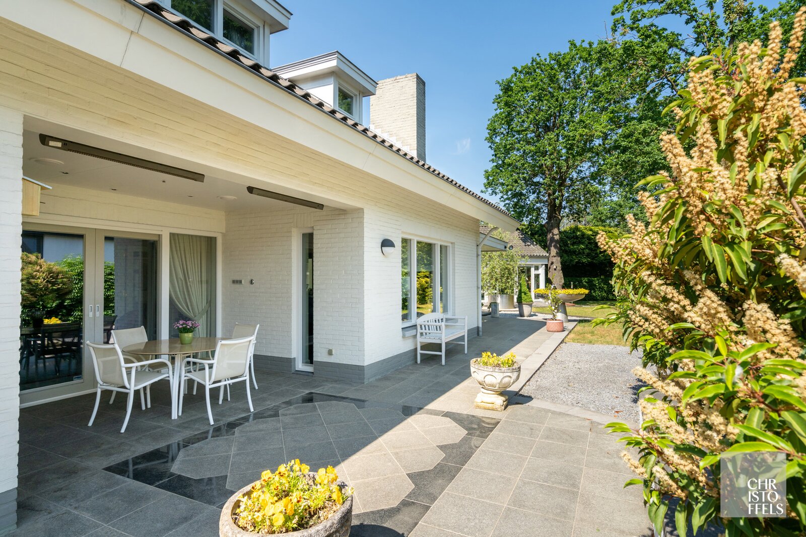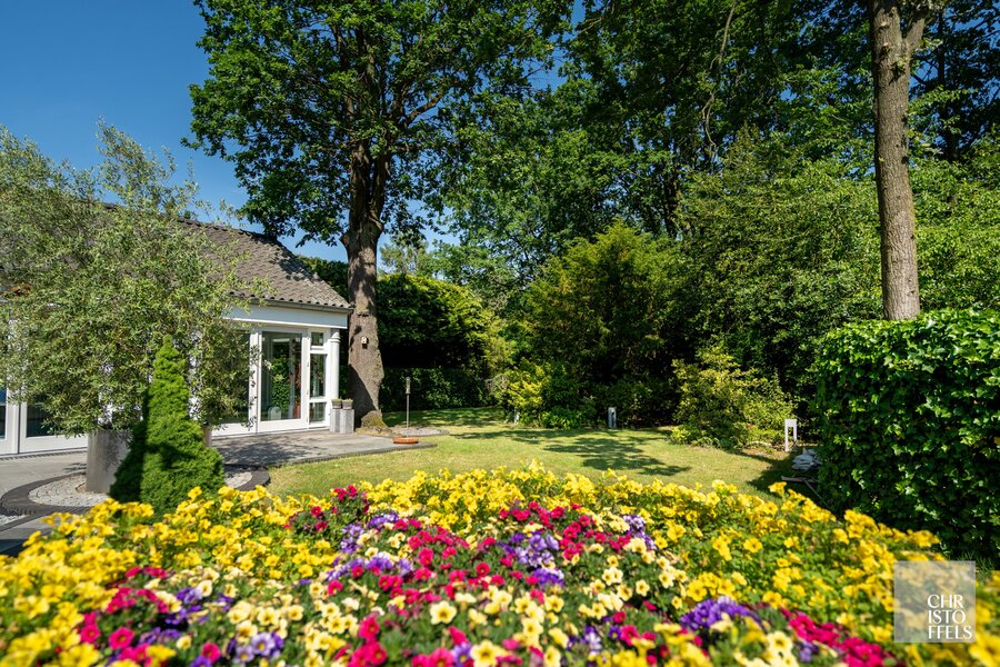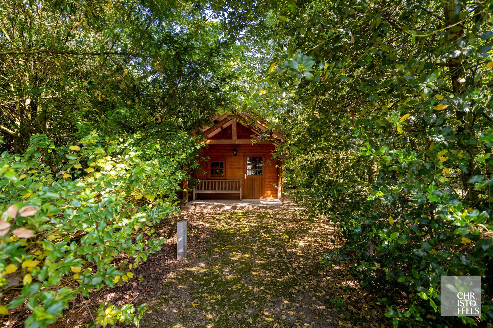 The southeast-facing garden includes a large covered terrace and is fully fenced. At the rear of the plot, there is a wooden garden house offering extra sleeping space, a toilet, and a washbasin — ideal as a guest house or pool house.