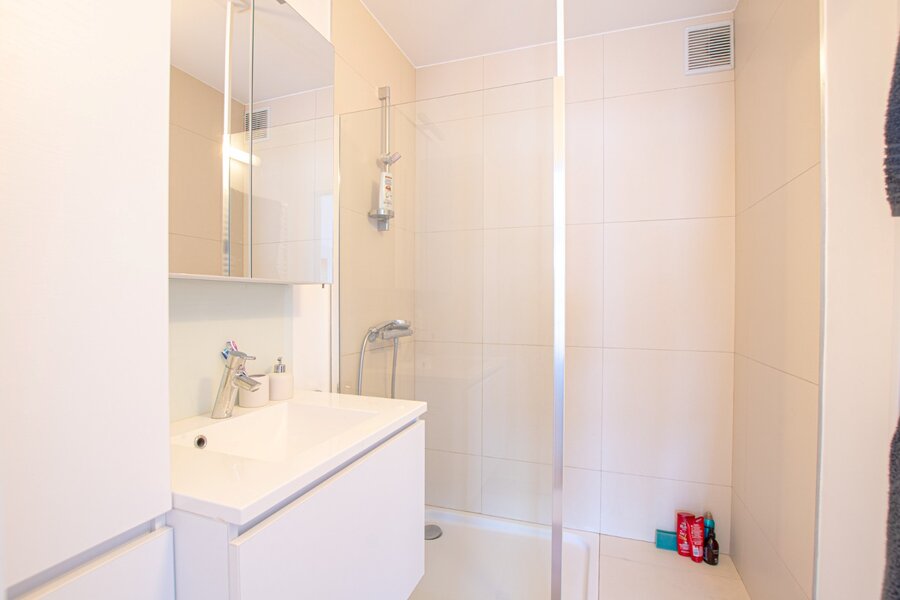 Indeling: Inkom met gastentoilet, open volledig geïnstalleerde keuken. Ruime living met ingemaakte kasten uitgevend op zongericht terras vooraan. Slaapkamer met aanpalend douchekamer, tweede slaapkamer met douche.