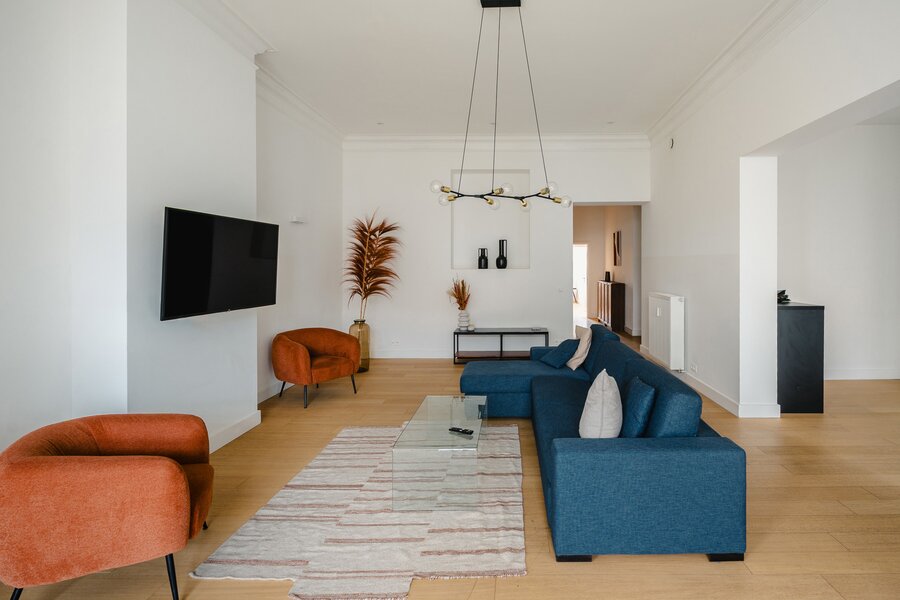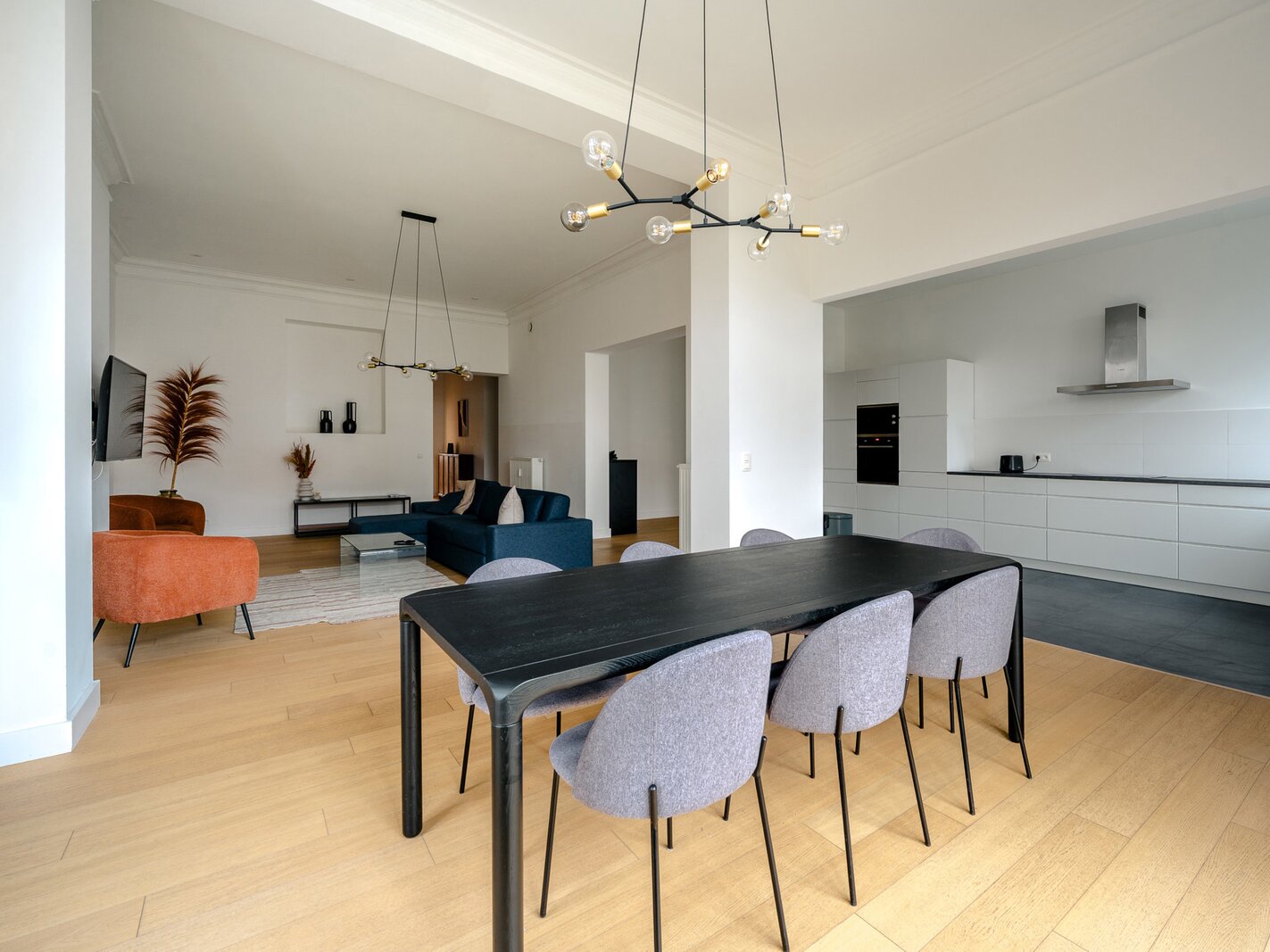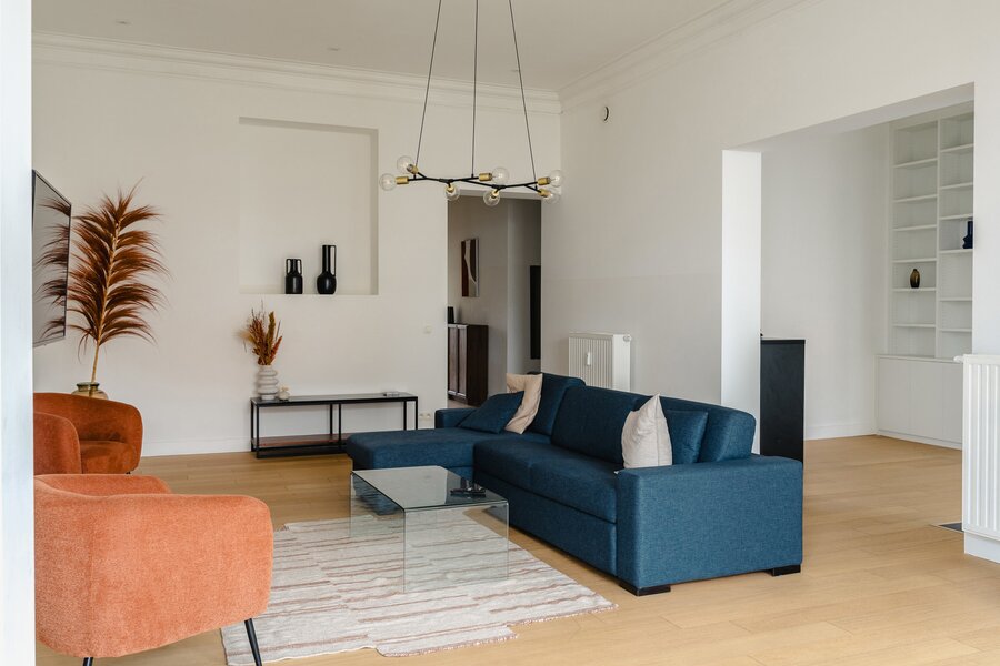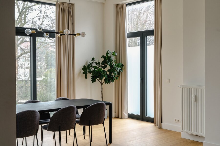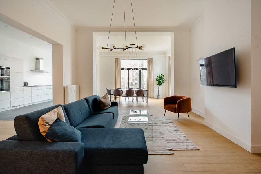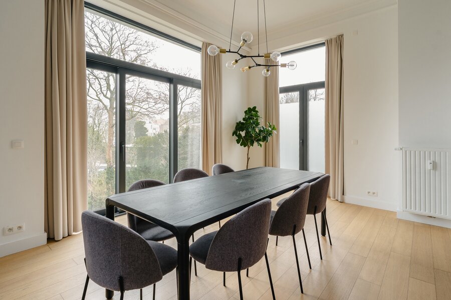 Ideally located between Place Stéphanie and Place du Châtelain, close to shops and public transport, in a fully renovated 1907 Renaissance-inspired Beaux-Arts house, furnished apartment with a gross surface area according to PEB of ± 174 m² offering three bedrooms.