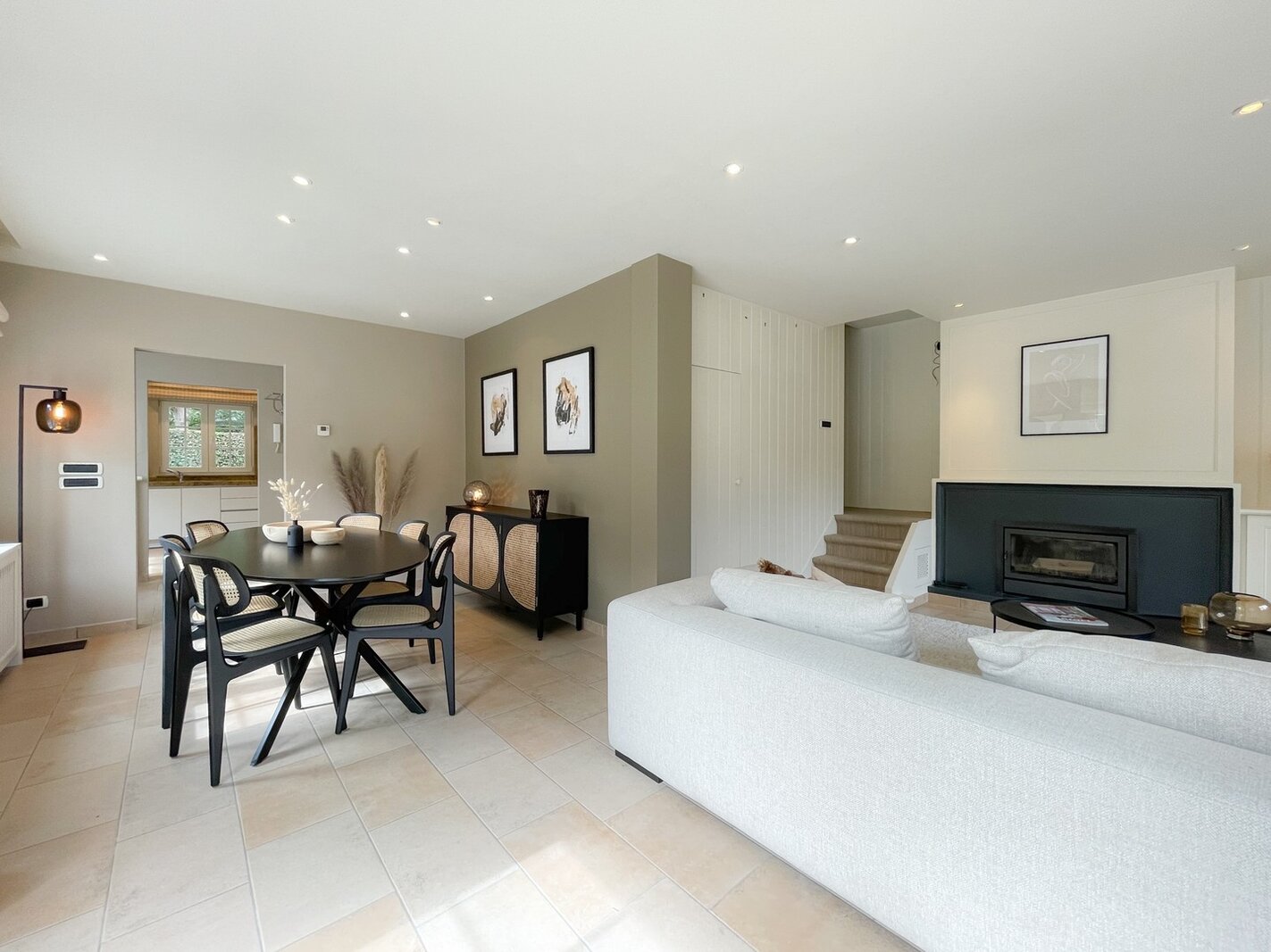 Composition: Hall d'entrée avec toilettes invités. Agréable coin salon avec cheminée, suivi d'une salle à manger lumineuse. Les deux pièces s'ouvrent sur la terrasse et le jardin parfaitement orienté. Cuisine séparée avec coin petit-déjeuner confortable, équipée de tout le confort moderne. Buanderie. Les escaliers au 1er étage partent du salon.