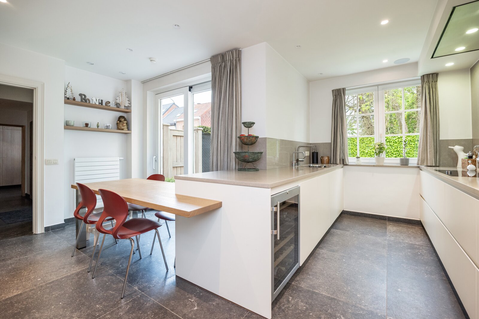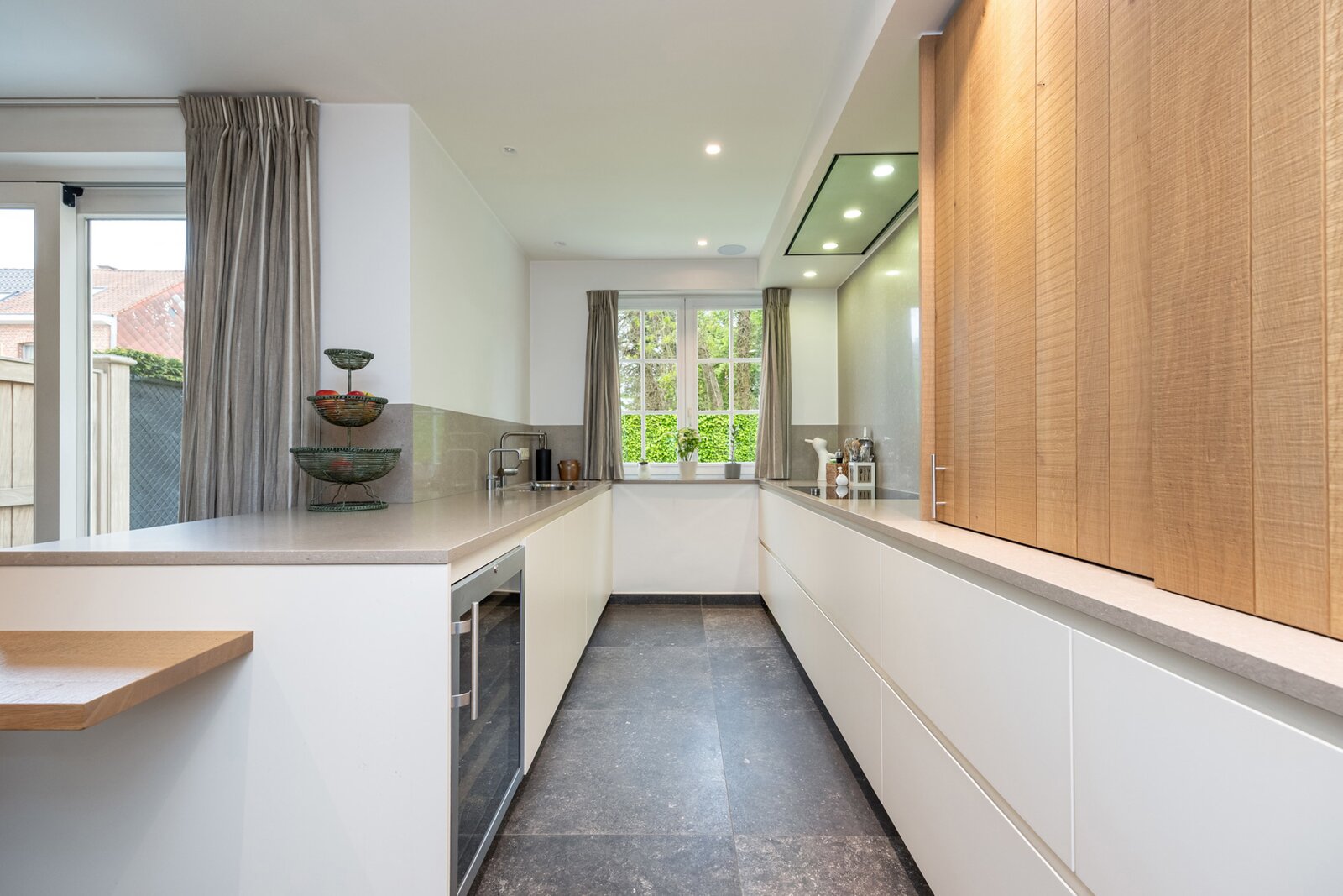 De luxueuze keuken is een waar paradijs voor de culinaire liefhebber. Het strakke composiet keukenblad geeft de ruimte een moderne uitstraling, terwijl de toestellen van Gaggenau garant staan voor topkwaliteit. De keuken beschikt tevens over een gezellige eettafel en biedt toegang tot een 1e terras.