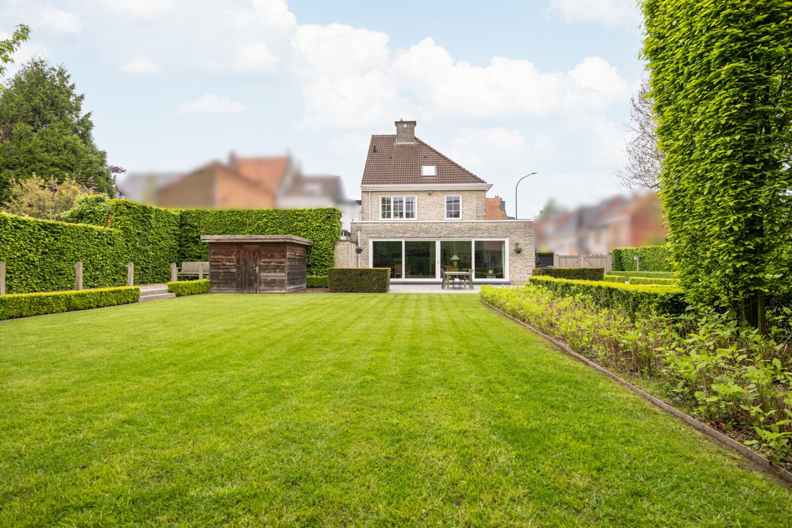 De zuidgerichte tuin werd aangelegd met diverse beplantingen, sfeervolle tuinverlichting en een petanquebaan – ideaal om in alle rust en privacy te genieten van het groen. Bovendien werd de tuin voorzien van een eiken bijgebouw van BoGarden, met ruimte voor twee wagens en (motor)fietsen.