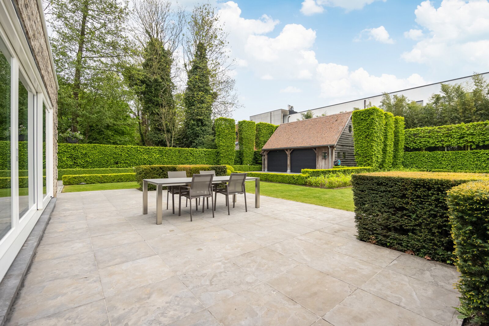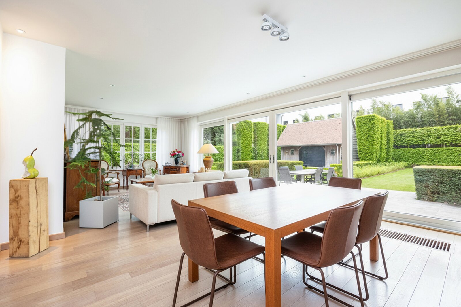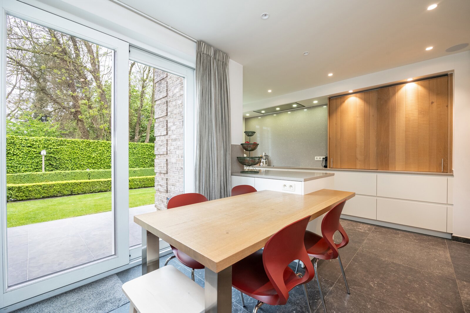 In de ruime eetkamer zorgen de grote raampartijen voor een overvloed aan natuurlijk licht en een panoramisch uitzicht op de fraai aangelegde tuin, met directe toegang tot het terras voor een naadloze verbinding tussen binnen en buiten.