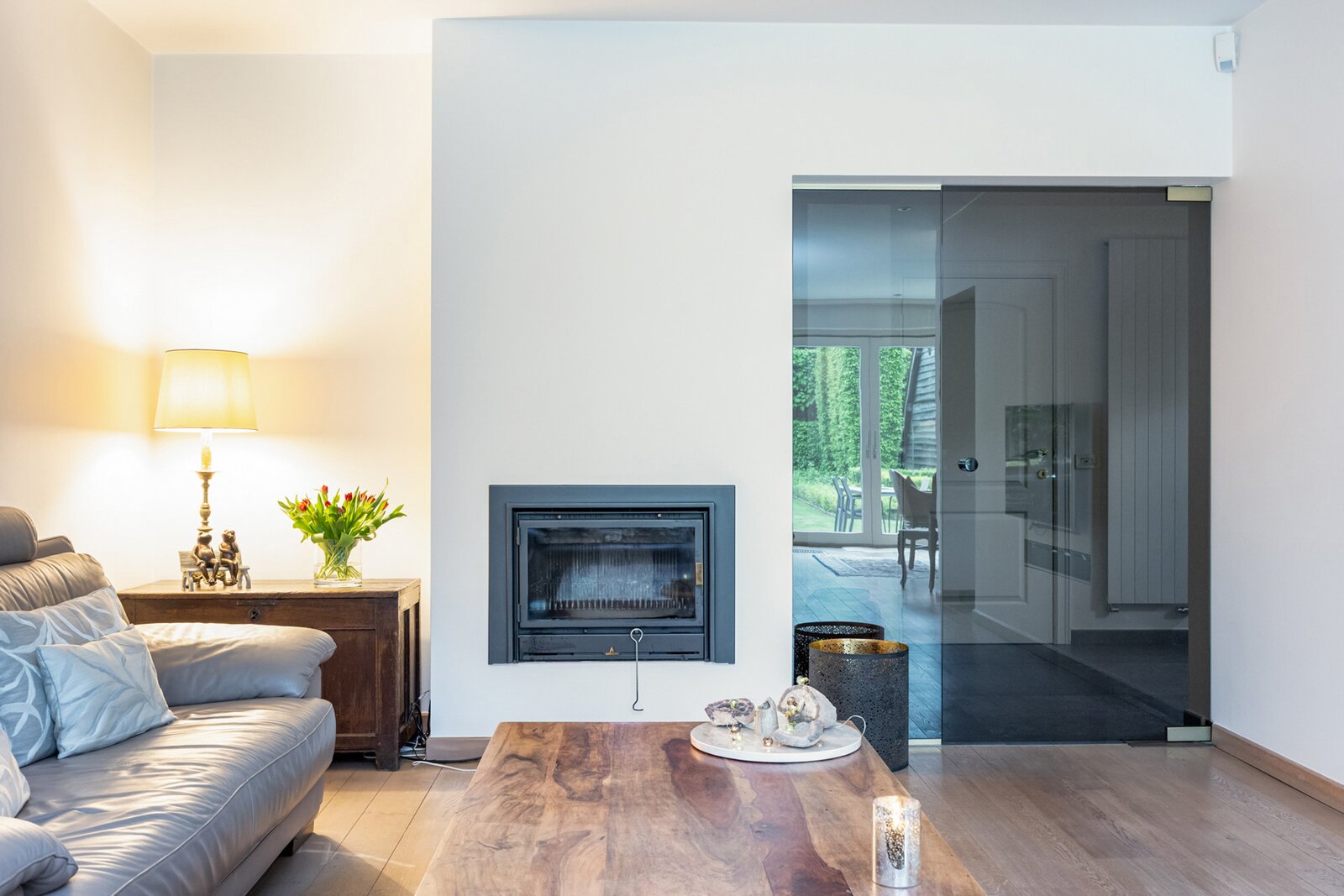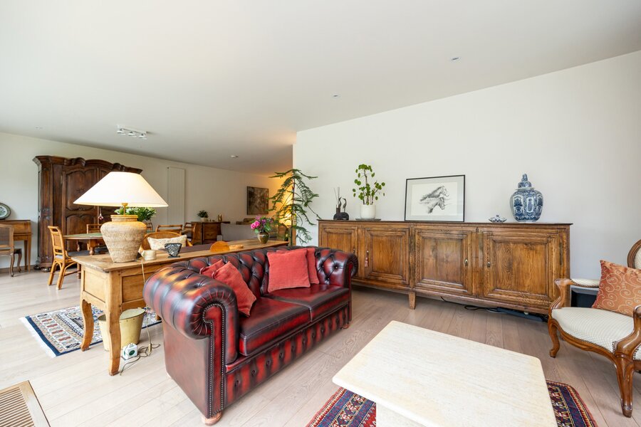 De woonkamer straalt gezelligheid en warmte uit dankzij de houthaard die een aangename sfeer creëert gecombineerd met een elegante parketvloer.
