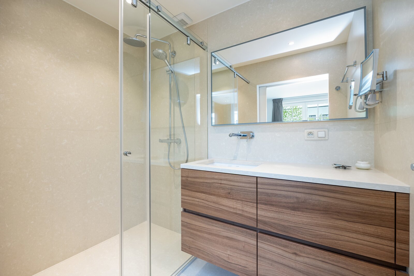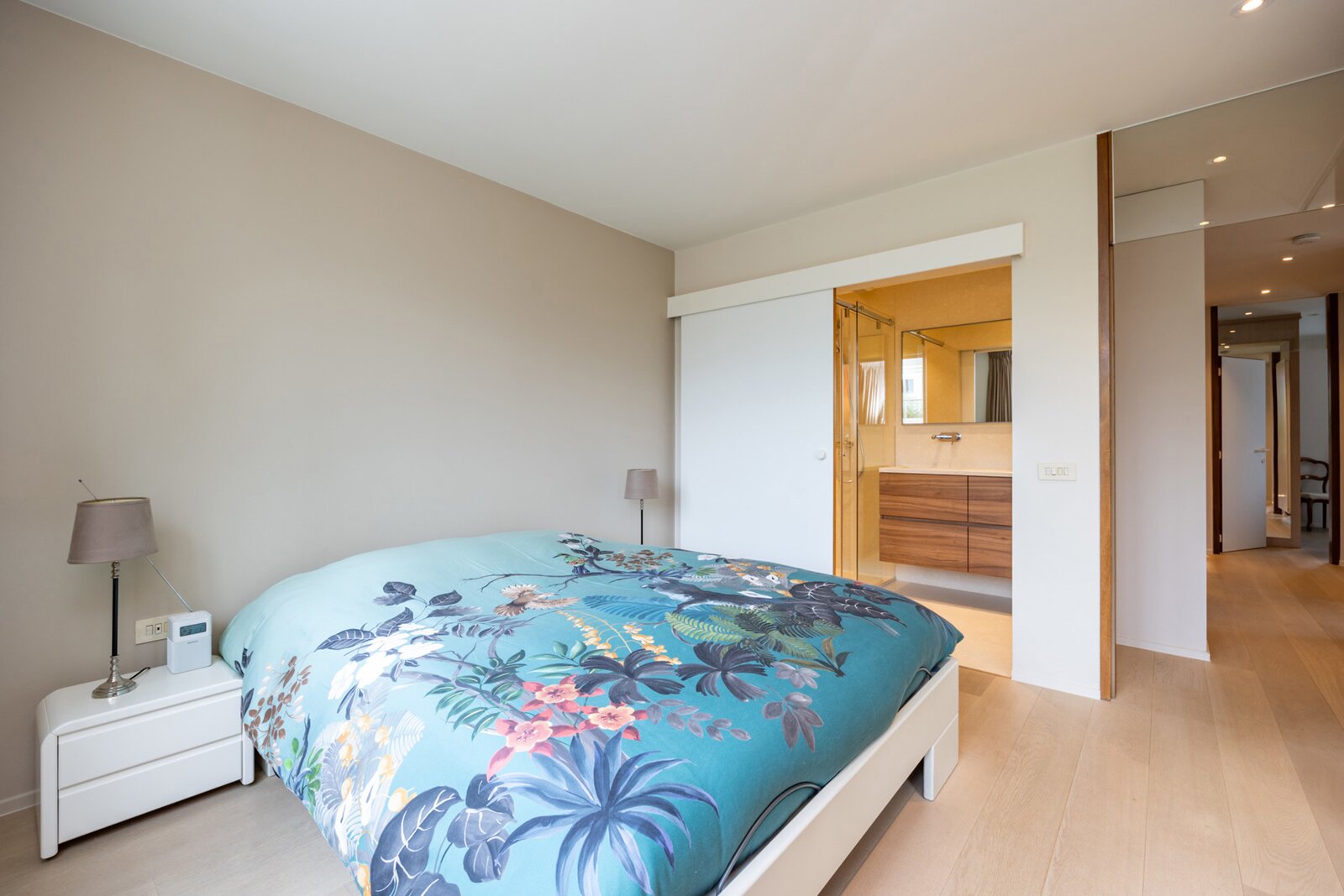 De prachtige eiken trap leidt u naar de eerste verdieping, waar de klasse van deze woning zich ten volle onthult. Hier bevinden zich vier ruime en lichtrijke slaapkamers, afgewerkt met een elegante parketvloer, waarvan drie uitgerust met ingemaakte kasten. De masterbedroom is uitgerust met een eigen badkamer, waar een composiet badkamerblad, de inloopdouche en lavabo de ruimte een verfijnde, luxueuze uitstraling geven. De tweede badkamer, in dezelfde stijl, is voorzien van een inloopdouche, ligbad, dubbele lavabo en toilet. Er is ook een bijkomend toilet op het verdiep aanwezig eveneens afgewerkt in composiet.